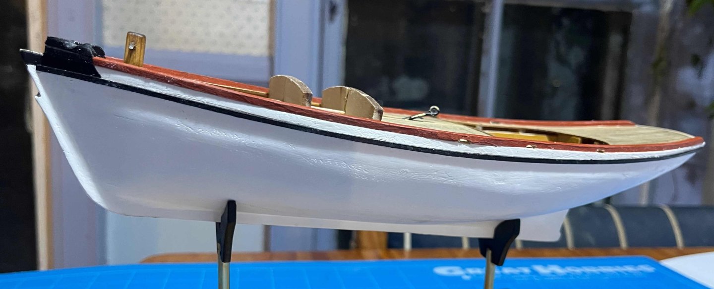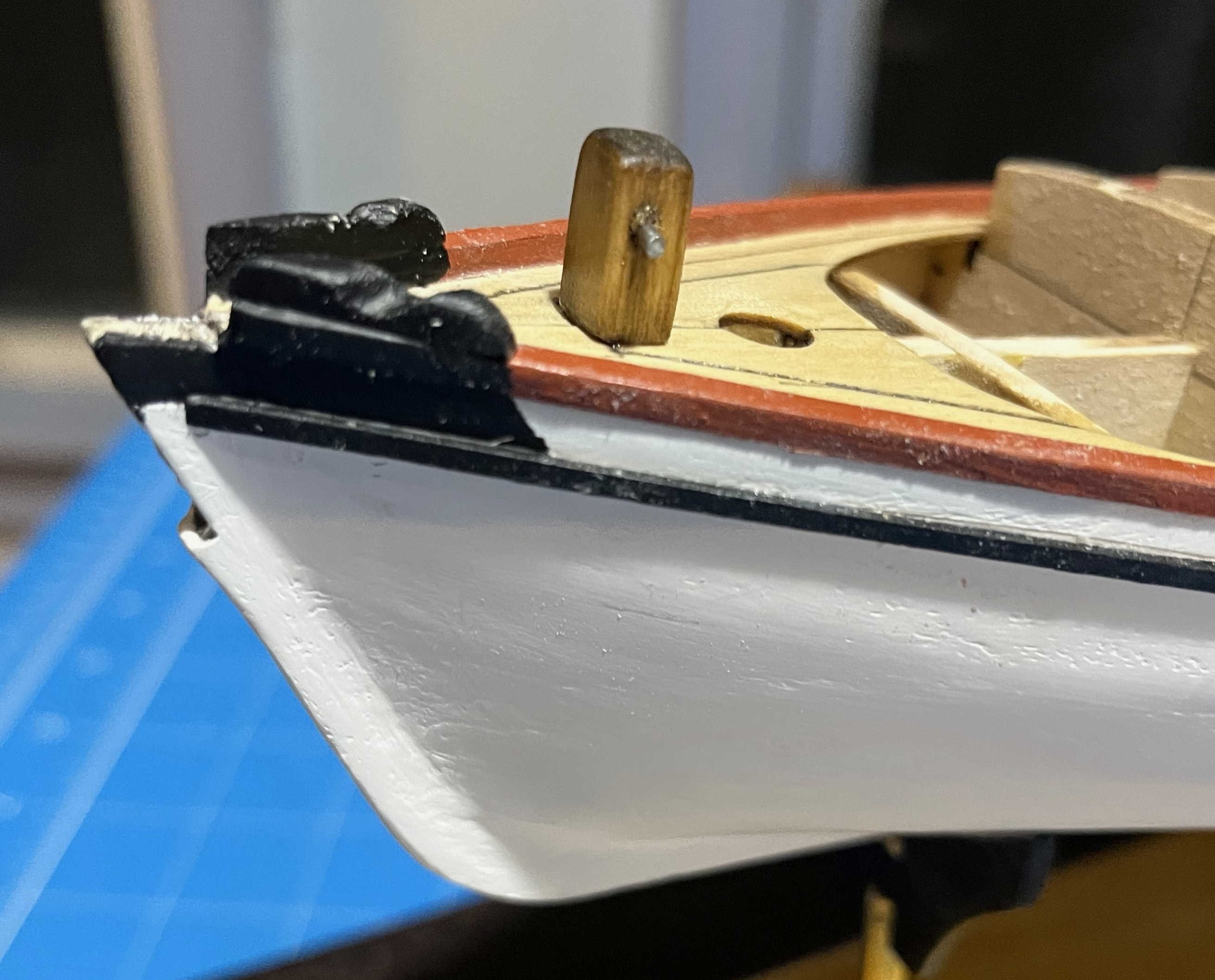 Ten days of only intermittent work on my smack. The grey, spray primer went on easily and with no problems at the time, but I soon came to regret applying it. It revealed a few hollows that needed more filler but no second coat seemed worthwhile, so I turned to a white (artist's) acrylic primer, then a warm-white top coat. The problem was that the acrylics had poor opacity, so I had to put them on thick to hide the grey, then sand to get a nicer surface than the paste-like effect of the paint. The sanding let the grey show through, calling for another coat ... and on and on. I lost almost any sign of the planking strakes, giving me a hull that is too yacht-like for my taste. Finally, I applied a very slightly thinned coat in a (largely unsuccessful) attempt to fill the defects in the paintwork, followed by a polish with a sanding stick so worn that it has almost no abrasive effect left. I am not at all happy with the outcome but there seems no point in repeating to the process any further, so I added the rub rails and toe rails. The rub rails are very thin and easily bent with fingers. I pre-painted three surfaces black, leaving the back bare for glue. Meanwhile, I had kept line of 1mm masking tape on the hull, in the required position, so that there was bare wood to provide somewhere for the glue to grip -- though the masking wasn't perfect and I had too scrape out some paint. Each rail needs a slight bevel at the forward end, so that it can sit flush against the stem, but otherwise all was easy and the contrast against white topsides looks nice. (I did consider a bare-wood effect, with a golden-oak stain on the rails. However, in the finished boat, they merge into the black-painted headworks, so I thought black would go better throughout.) The toe rails were much more awkward. The kit instructions warn that they are thick enough to need bending with steam, not hot water. In practice, I found them easily handled with my usual soak in water boiled in the kettle. I shaped them on the sheerstrake, with rubber bands to hold them there while drying into the required 3D curve. Then I painted them with red ochre, to give the finished model a splash of colour without violating historical authenticity for the time and place. Finally, I sanded the outer edges of the deck to give the glue a grip there too. So far so good. However, there was enough spring-back after the rails dried that it was hard to get them properly aligned with the deck edge, made all the worse by there being nothing to clamp them to. In the end, I surrounded the hull and both rails with multiple rubber bands, then lifted those off the rail that I was fitting by putting Lego blocks under the bands. That let me get a glue brush under one section of the rail, then held it in place with finger pressure, removed the Lego so that the bands supported the glue while it set thoroughly -- and moved to the next section, working from the bow aft, before repeating with the other rail. The result is a mess of surplus glue and worn paint that needs cleaning up, along with rail ends that need trimming, but I think all will do well enough in the end. There are only a couple of spots where the rail is not neatly aligned with the deck edge and I can live with those: The instructions offer an optional extra of cutting a small scupper in each toe rail, after it is in place. But that raises a question of where to put it. With the boat upright on her mooring, rainwater on deck would pool against the rail abreast the cockpit. As the boat heeled to the wind, however, the low point would move forward, so spray would collect abreast of the live wells. I figured that three scuppers per side would really be needed but I didn't fancy drilling them out after the rails were in place. Instead, I used a file with a curved upper surface and worked on the underside of each rail until I had enough space to get the tip of the file in after the rail was glued down. They look like: That's out of focus but does also show the poor state of my paint job! The risk, of course, was that the cut scuppers would so weaken the rail that it snapped before being securely in place. As the second photo shows, I did have one break, but it will be easy enough to hide when I tidy up. So progress is slow and imperfect, but I am progressing! Trevor