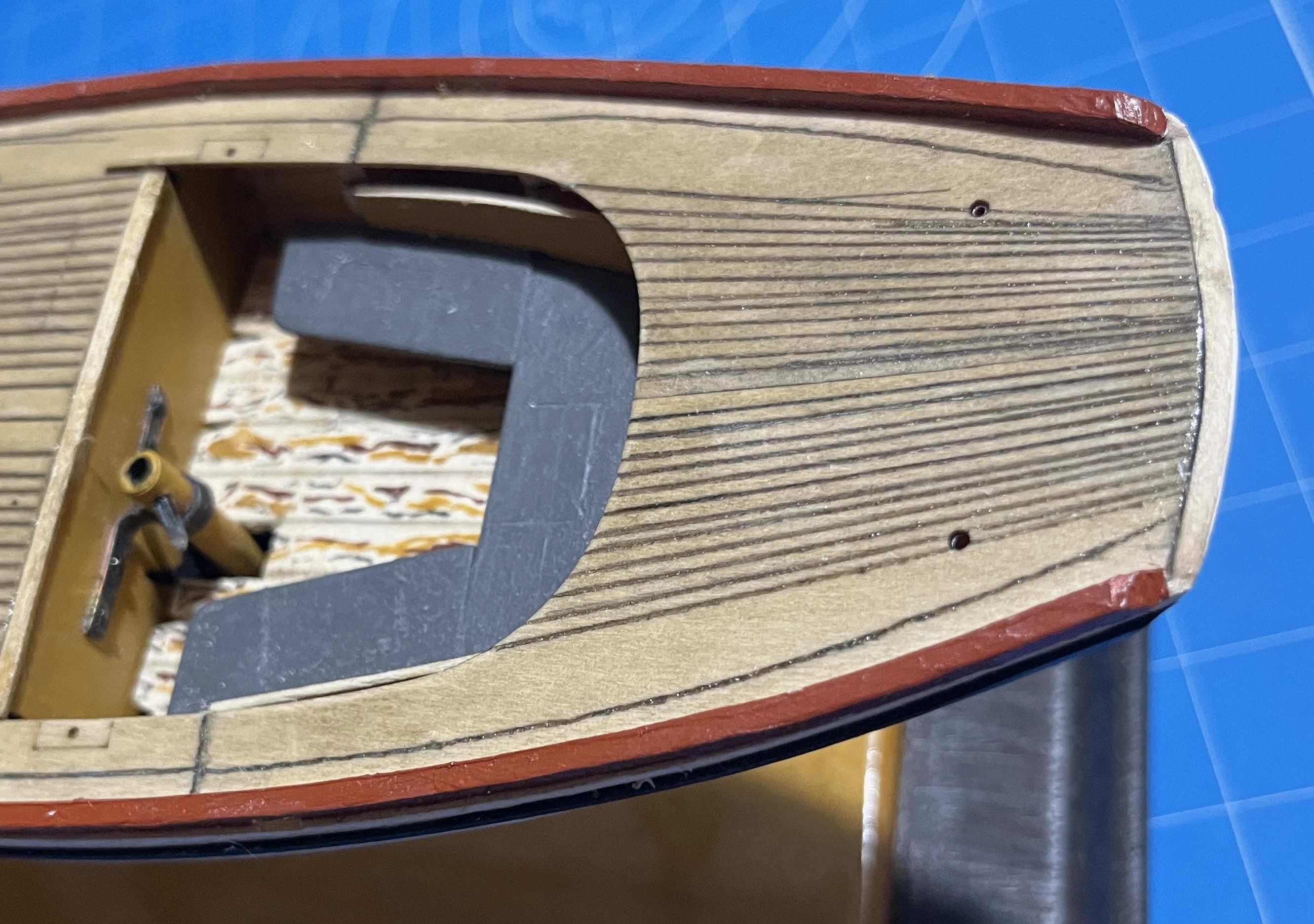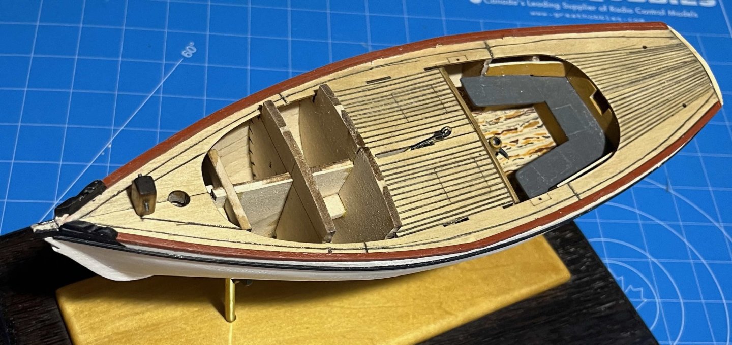 My past week has been better for sitting at a computer, dodging stress, than for careful crafting of anything. As a result, after promising myself that I would never get stuck into more than one model at a time, I am now deep into the preliminary thinking for two others -- while my Muscongus Bay boat has languished. Still, I have managed some progress: Tidied up the ends of the toerails and rubrails, cleared up some of the excess glue and touched up the paint (though the camera shows that there is more tidying to be done): My attempt to file the scuppers in the toerails before gluing those on was a bust, though it did save me drilling a hole for the saw blade that (as per the instructions) I used to open up the holes. Once tidied up with a flat file, they turned out OK: Meanwhile, I added the bow chocks, cutting them carefully to suit their role as partners for the bowsprit, while shaping grooves for their second role as fairleads for the anchor warp or mooring pendant. Those, I painted black, while extending the contrast colour down to the rubrail. Once the tailboards are in place, that should make for a unified appearance of the head. I also made and fitted a sampson post. The kit one broke on me (twice!), so I made another from some basswood stock. The kit version was two parts, glued together, but both pieces are laser-cut in such a way that they have cross-grain -- a bad mistake by somebody. Mine has the grain along its length. The instructions call for the post's crossbar (I forget the proper term!) to be made of brass rod. Rather than fuss with blackening the brass, I used a piece of stainless steel (left over from making fishing gear for my dory) instead. I stained the sampson post with golden oak, which came out far darker than my previous use of the same stain, then finished it with wipe-on-poly: I'm quite happy with how that turned out. It does raise a general point, though: Ships and boats (almost) always have a lot of deck fittings. Many of those are fitted on the deck, even if they have fastenings that pass through it to the stronger structures below. However, in full-size reality some things, like a sampson post, pass through the deck and are firmly built into the hull structure to provide sufficient strength. In most models, of course, those fittings are placed on the deck but they should not look like they are. (For one example, to my eye, hatchway coamings that too obviously sit on top of a planked deck can really detract from a model's appearance.) The present kit has a hole in the deck and space in the structure below for an insert much narrower than the exposed part of the sampson post, which needs a shoulder where it sits on the deck. To get my post to sit nicely and look like it might extend up from the keel, I cut that shoulder to a careful square, with the shoulders on the sides of the post angled to match the sheer of the deck. I wasn't sure that that would work but it seems to have turned out well. So I have now arrived at: Next up will be the support blocks for the rowlocks, closely followed by the cockpit coaming -- blocks and coaming forming a joint structure when all is done. Trevor