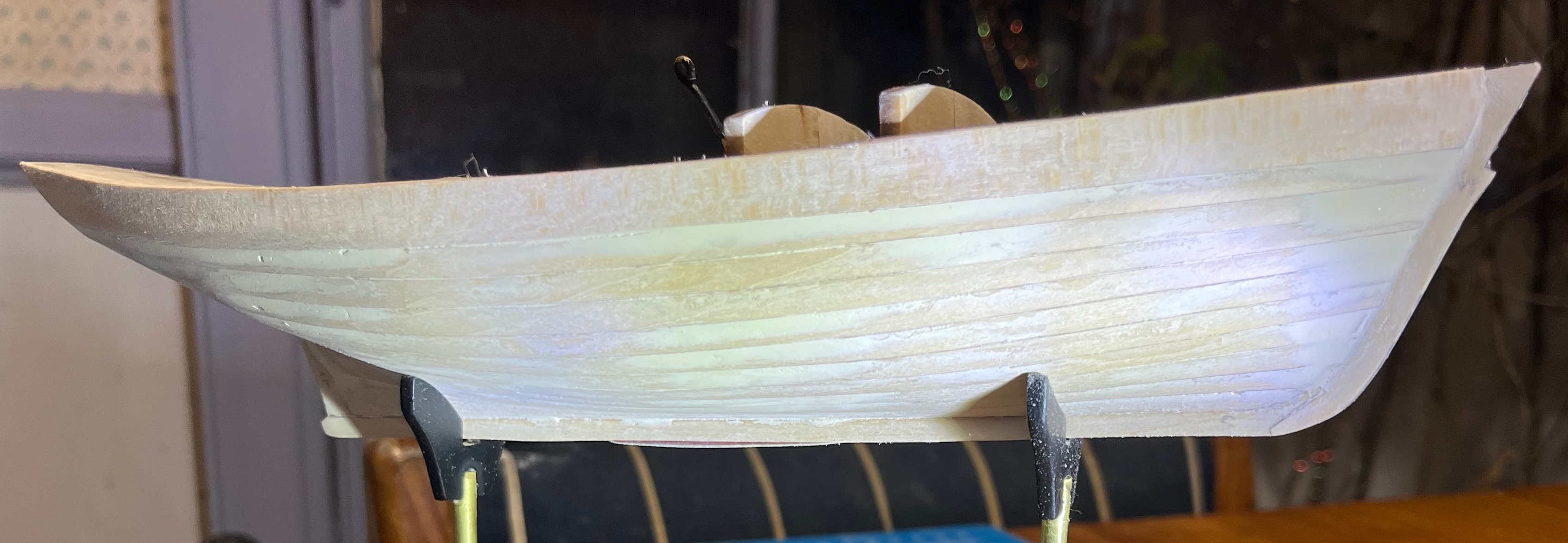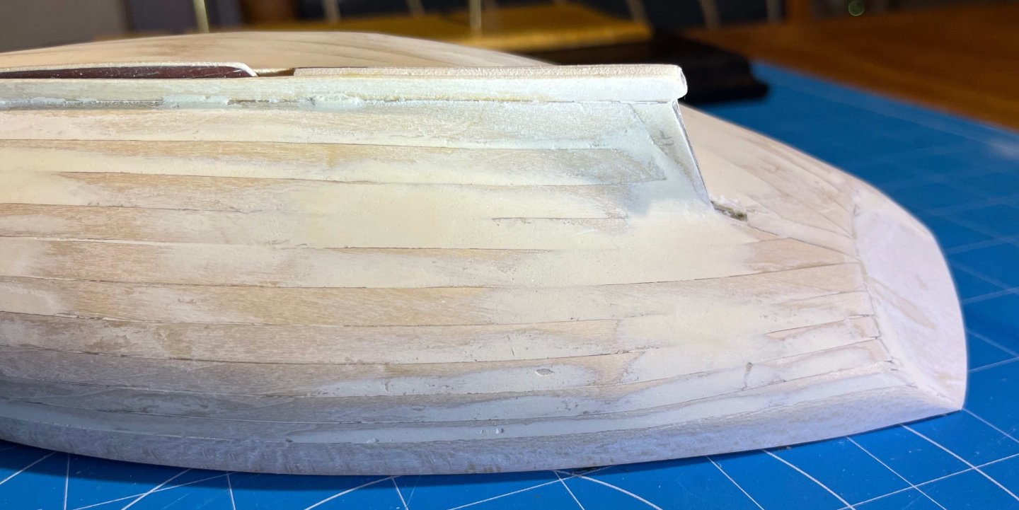 Thank you both for your kind comments! Workboat, yes. So the strakes should be evident as strakes, but without a step between one and the next -- each section essentially a series of flats, whereas the outer faces of a yachts planks would more likely be shaped to a curve, to make a smooth surface. Still, I do need to reduce the steps between some of the strakes. JC: I am not (so far) worried about the surface finish of the sheerstrake. Maybe that will cause me some grief but I'm expecting sanding and priming to be enough. Trevor