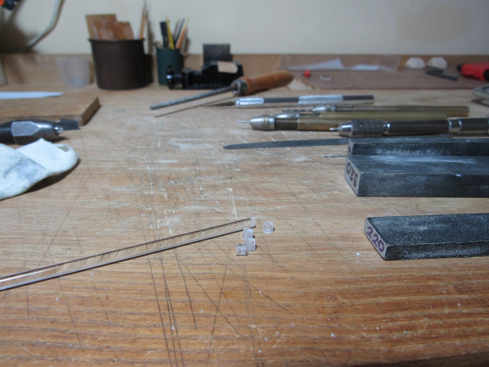 To get the keel (0,75x0,75mm plastic strip) straight I made a straight edge and glued the strip with polistyren glue. I have most problems with the frames and getting them aligned. After several failed attempts I made a plug/core of the boot and cut it at the intervals of the frames. So using these mould parts as a template I managed to fix the frames exactly aligned and square to the keel. I press the plastic strip (0.25x0.75mm) to the mould and let tiny drops of CA to penetrate at the side. One by one and step by step.