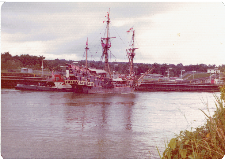 There was a replica of the Golden Hind built during that time and they brought it through the canal, lashed to one of the tugs.