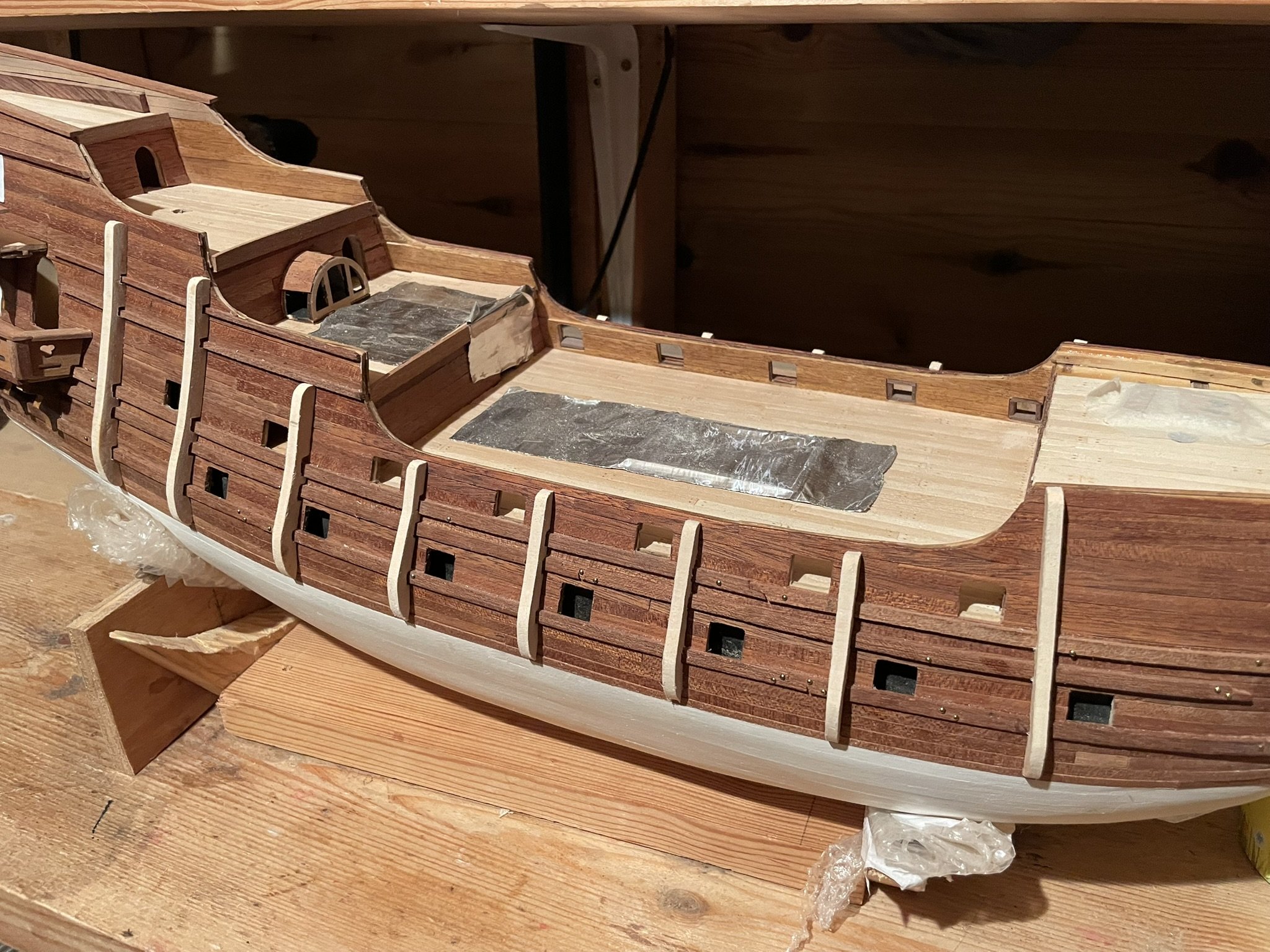 Finished the planking above the wales, but looked too light, I had tested samples of African walnut with a coloured Danish Oil and it looked perfect just about dark enough. Coating the ship with this oil and what a disappointment every blemish, wood glue stain was revealed. Lightly sanded down and reapplying no better, tried staining with medium oak no better. Everything had to come off, continuing without being happy with the hull would be a killer. Looking at my San Martin, covering with mahogany and finishing with diluted poly u varnish has aged well so that’s what I did. Going for the chunky finish using the grain and the texture of the planking to give an old galleon look. Looking on the bright side I can remove planking on hulls and decks quite easily and redo.