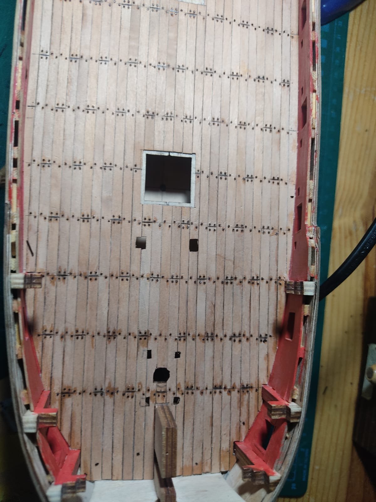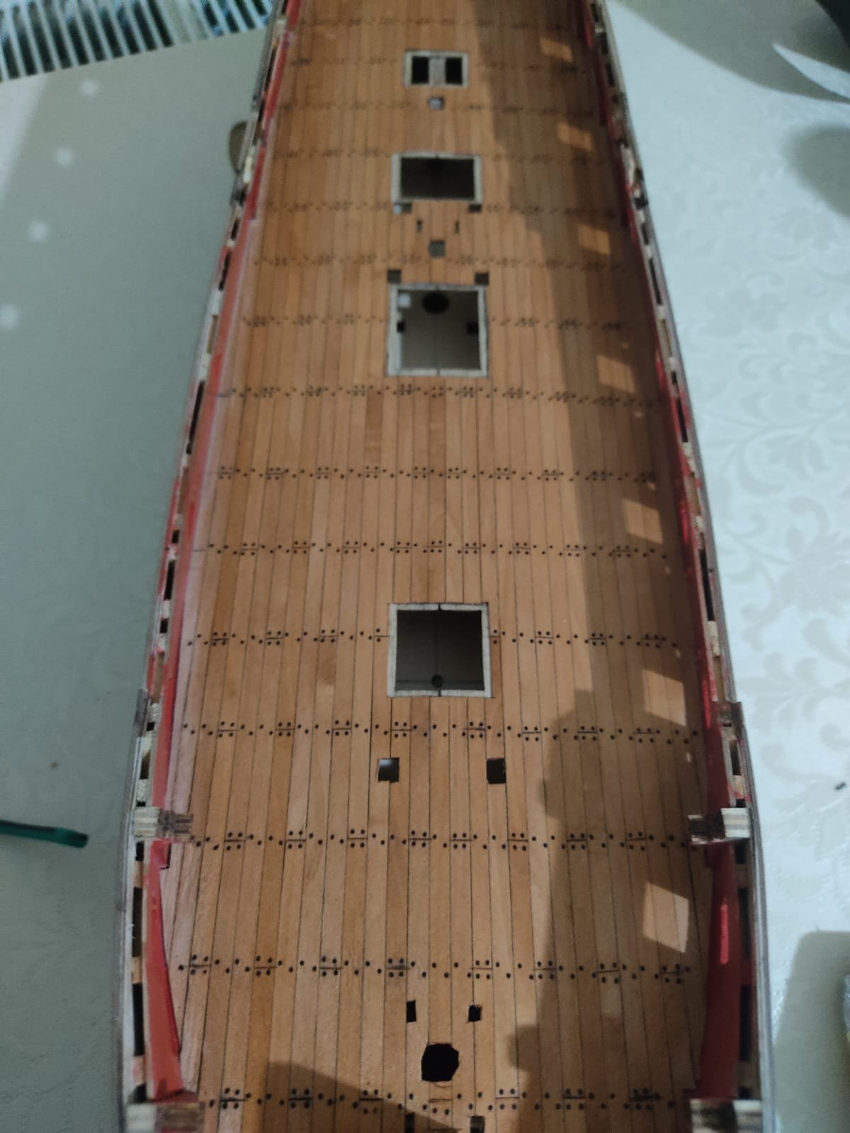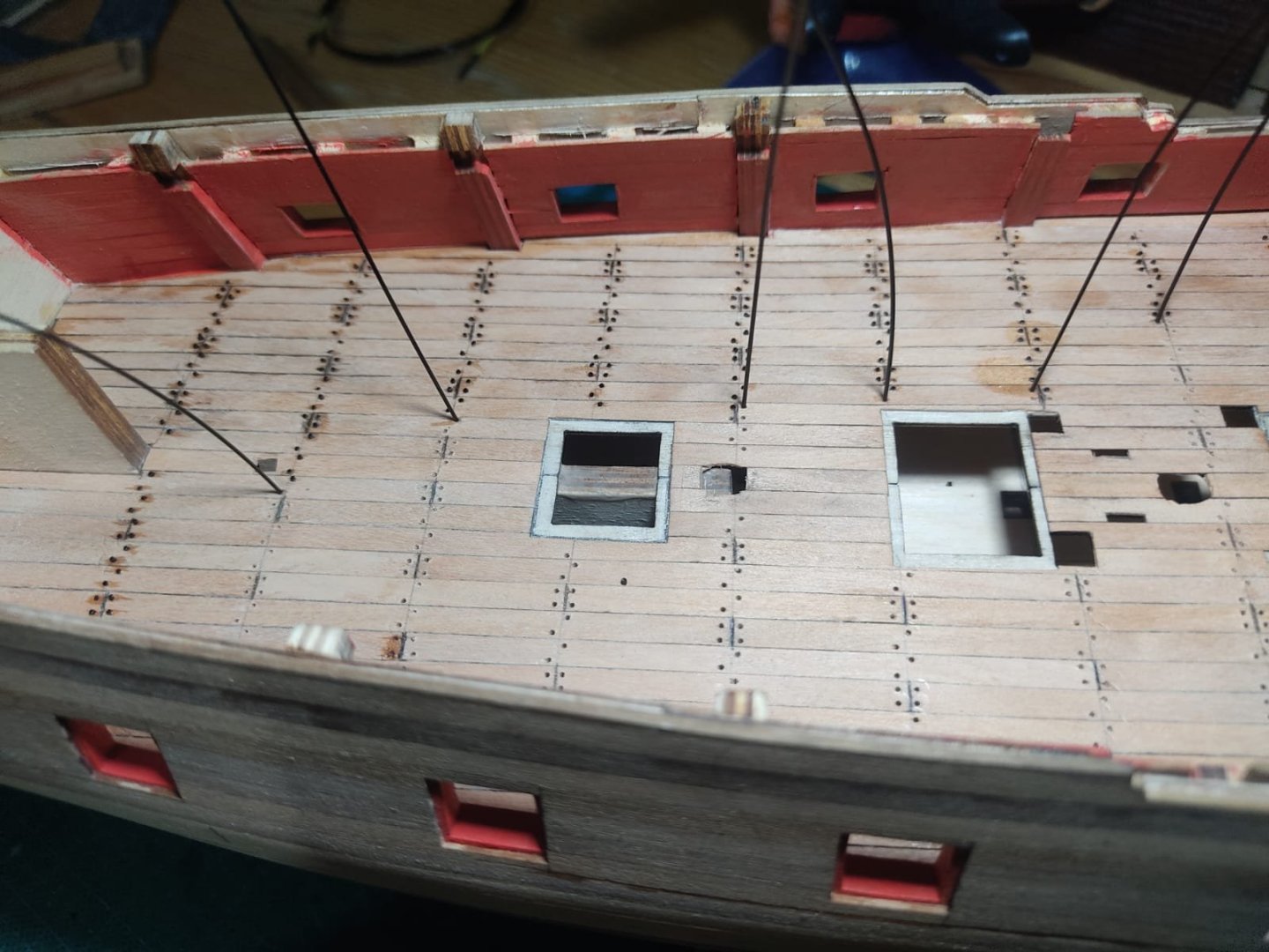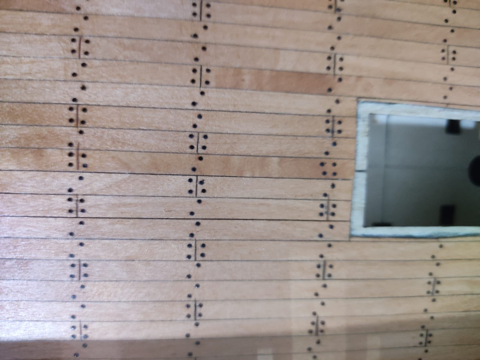 deck coating finished. linden tree was used. the nail effect was given in pencil. I started the stem nails. With 0.5mm brass wire.