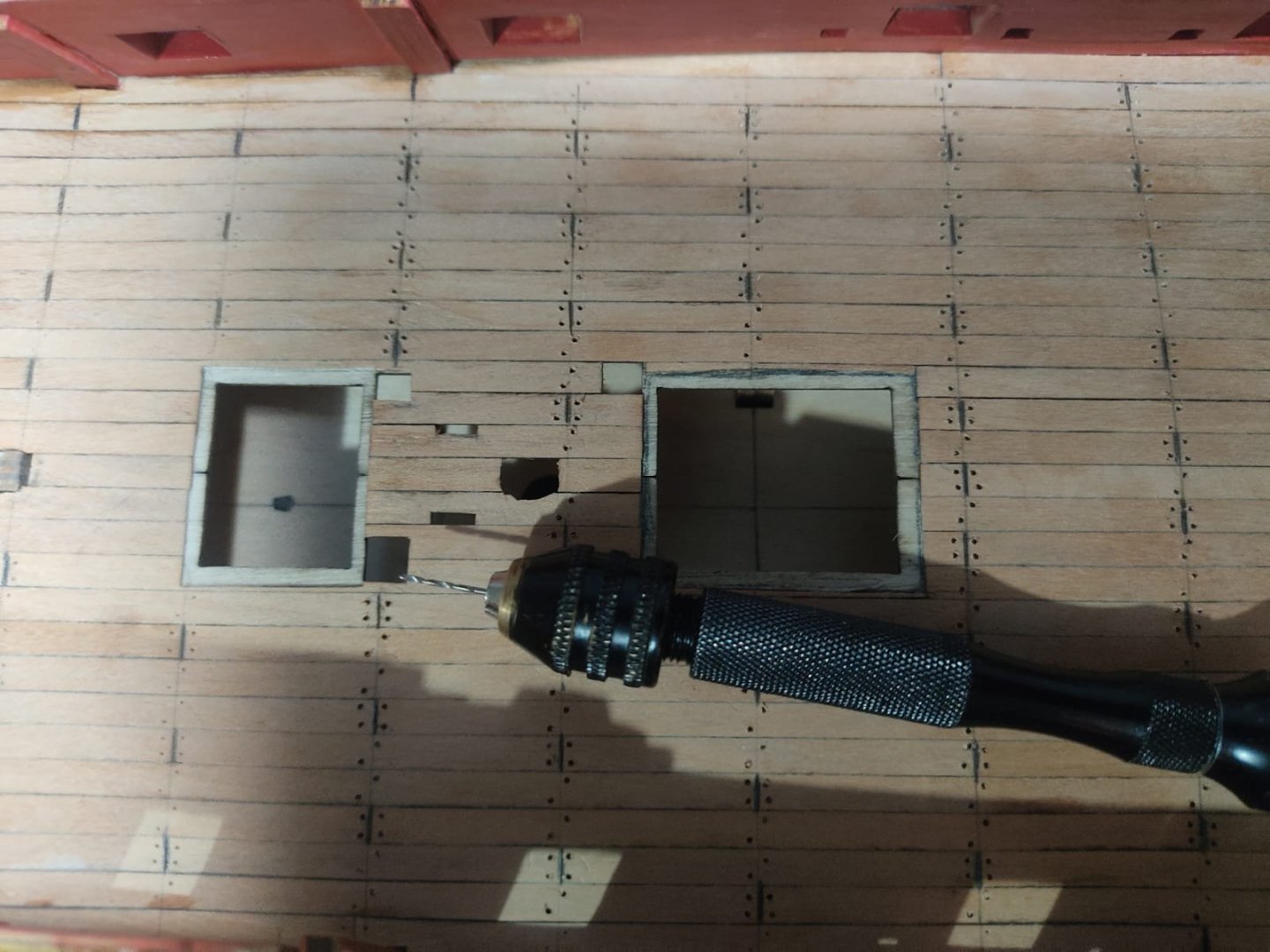 I filled the interior with 1.5 mm thick material and lined it with the walnut slats provided in the kit. However, I didn't like the gun mounts, so I sanded the edges again and framed them with 0.5 mm thick veneer. The interior and exterior cladding is finished for now. I've started on the grilles for the deck cladding. For the deck cladding, I will use 4 mm wide pear-shaped planks instead of the 3 mm wide material provided in the kit.