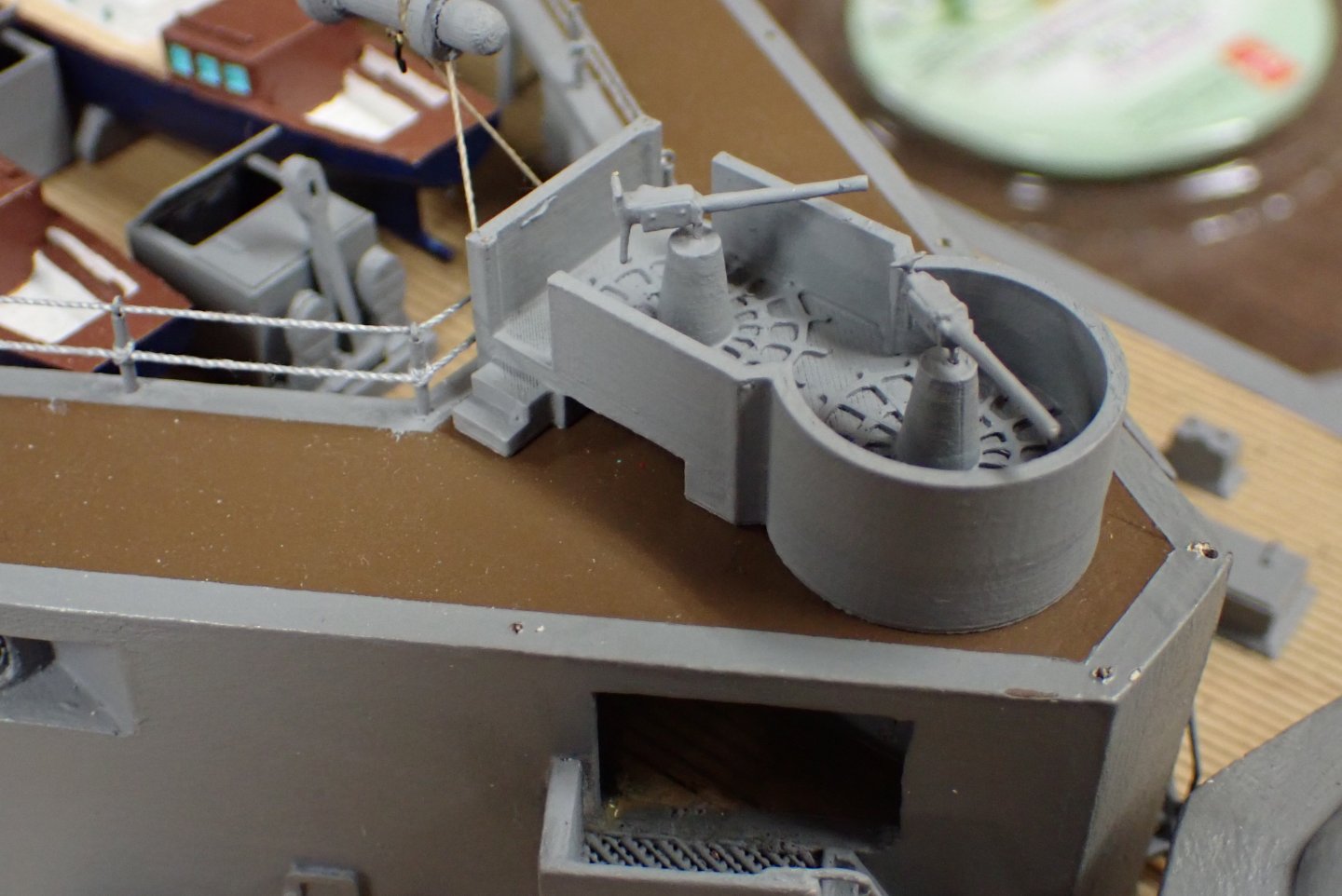 Working on the torpedo net booms and rigging. I've been putting this off for a long time and it is as tedious as I expected. Here are a couple of pics on the port side, with the booms' forward and aft topping lifts and jackstay rigged. I just tied the lifts to brass etch eyes glued into tiny drilled holes in the hull. Strictly speaking the booms' ends should reach right up to deck level since the torpedo nets were "always" laced onto the jackstays, but I need to lift off much of the deck for access and the torpedo nets will come with it, hence the booms cannot be attached. I copied teenage Ian's simple solution of bending the tubes 90 degrees and inserting into drilled holes in the hull rather than trying to produce a set of 32 tiny U-joints or such. I'm now down to a dozen brass etch eyes and ordered yet more which I will need for the starboard torpedo booms' rigging, and the main deck railings. Also made some prototype Hotchkiss guns out of brass tube, some scrap brass etch, and evergreen, to mount in the 3D printed enclosure. Also worked on QF-3 Vickers guns of which she had four. I made two prototypes of slightly different sizes, neither of which I can find now. They consisted of a micro brass tube barrel inserted through a 3d-printed base and a two-piece breech assembly. They looked pretty good, planning some additional brass etch detail, but the reason I made two different ones is I couldn't decide on the size appropriate for crew members. Difficulty is I have no dimensions for these Vickers guns. I searched yet again for some crew figures and this time found a lovely set of 10 resin-printed Royal Navy WWII bridge crewmen, available in several scales, on Etsy of all places. In my case the ship is 1/150, and the nearest of the many available scales are 1/144 and 1/160 representing men of 6ft and 5ft6in stature respectively. Decided on the 1/160 set. The CAD is very impressive; makes me wish I was making a 1/48 scale corvette. They would be awesome. Waiting to see how they look at 1/160.....🤔. They are from WWII not WWI but at this scale who's to know? I'll be lucky if I can paint them half decently. When they arrive I can decide on the Vickers gun size and whether to change the height of the Hotchkiss guns and/or enclosure. They are here: https://www.etsy.com/ca/listing/1424701804/wwii-royal-navy-the-bridge-10-figure-set They're pictured on a WWII Flower Class corvette. Speaking of which, there are two guys in my RC club with 1/48 Flowers. "CGTrader" has 3D print files for an entire 1/48 Flower, less some detailing, for $50, and the same for a "Castle" class corvette. I thought it might be fun to print a Castle class to cruise with them, but at 1/48 this larger ship would be 63" long with the concomitant weight - 9" longer and much less narrow than "Lion" which is already a bit unwieldy to carry. I might buy the file and print one at 1/64 ("S" scale) which would be 47-1/4" long, much more manageable. ........... If I ever complete already queued projects. 😏