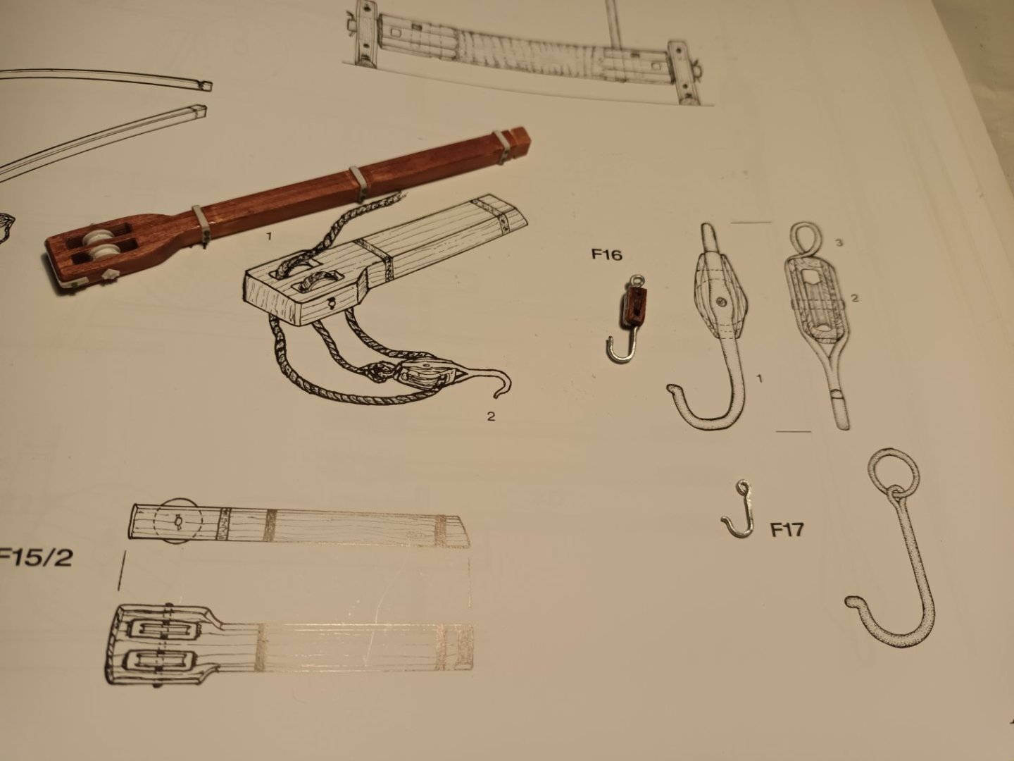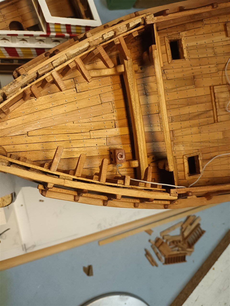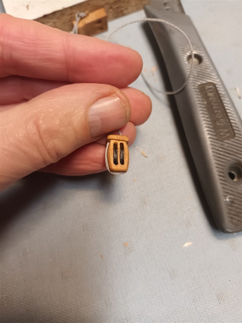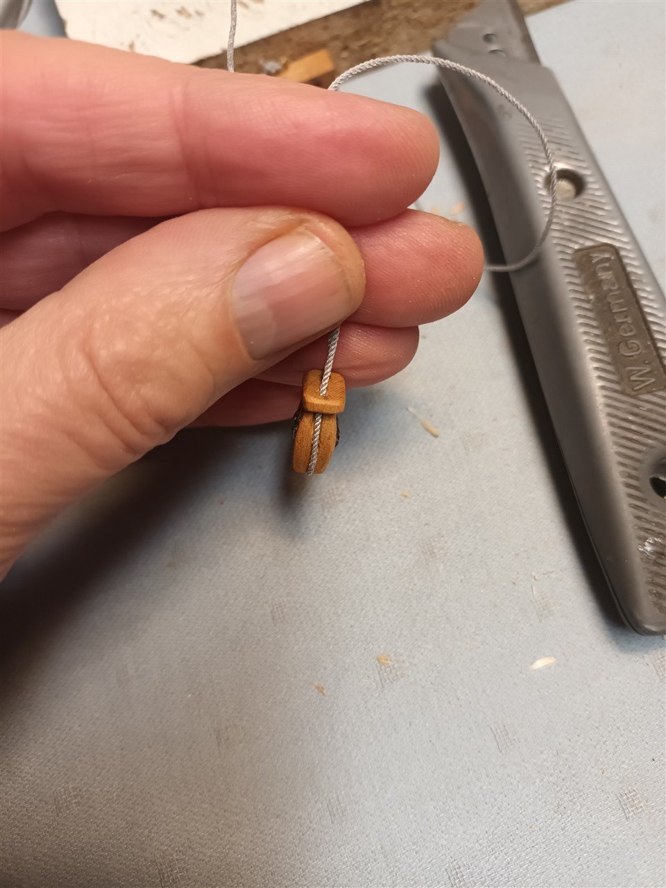 Welcome back, The Corel yacht is finished (learned a lot of new things) and the problem with the foresail knight is solved. 2026 started with "demolition work". And overtired staff (again). But, a knight (basic), a block and rope was made. Early 16yh century blocks are "special" and complicated to build. Knight in place (with the screw) Test. This setup can be operated with the capstan. Deck one back in place Deck two also Mary Rose is back on track