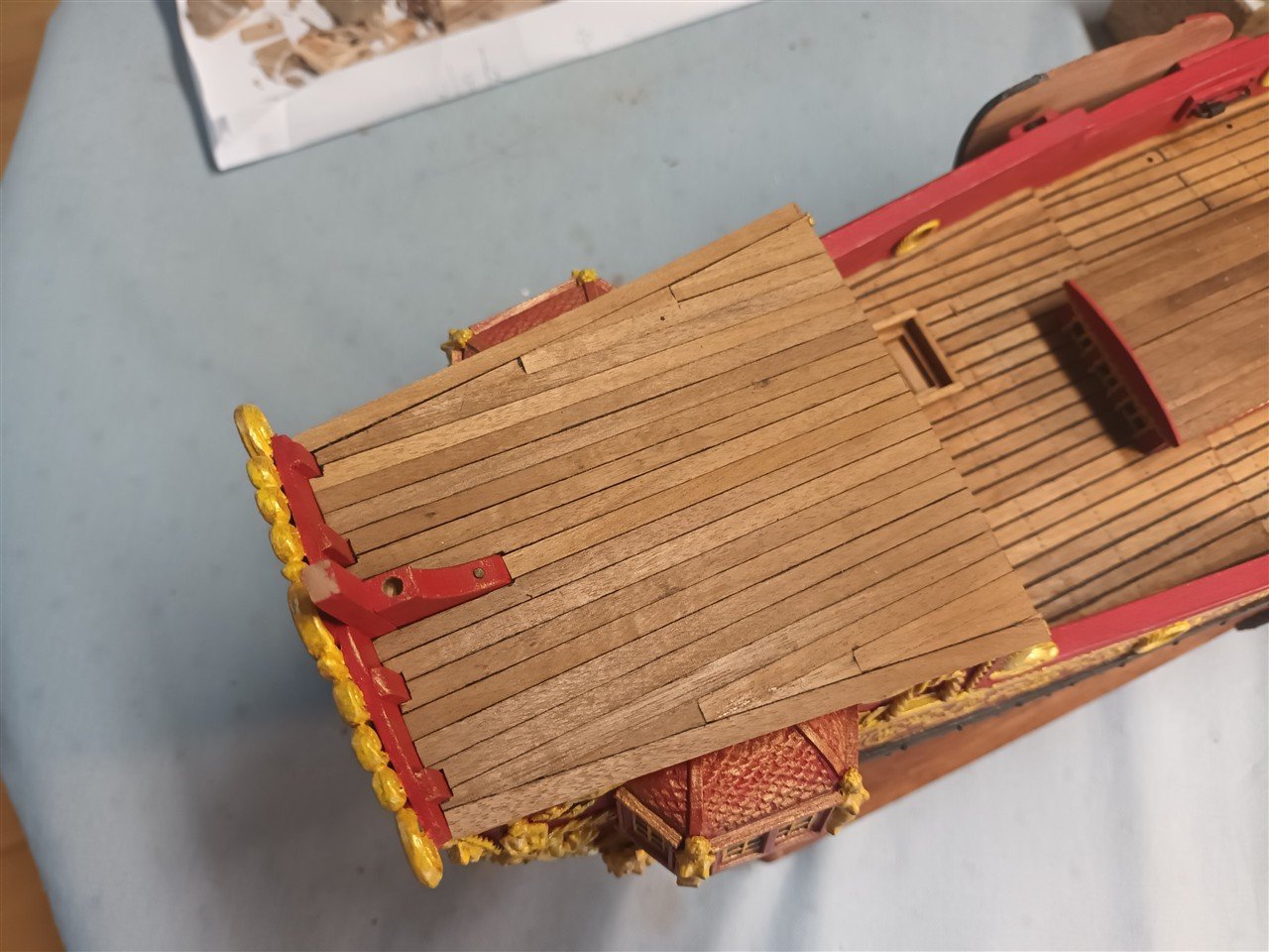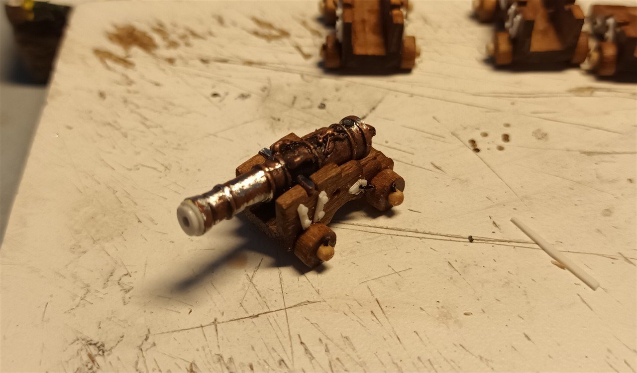Cannon production Step 1: prototype Step 2: carriages painted and barrels in place Step3: ready for last painting Step 3 ready I didn't like the first method of planking in this area. So I cut the 2mm planks from the kit to 1mm. And planked again.