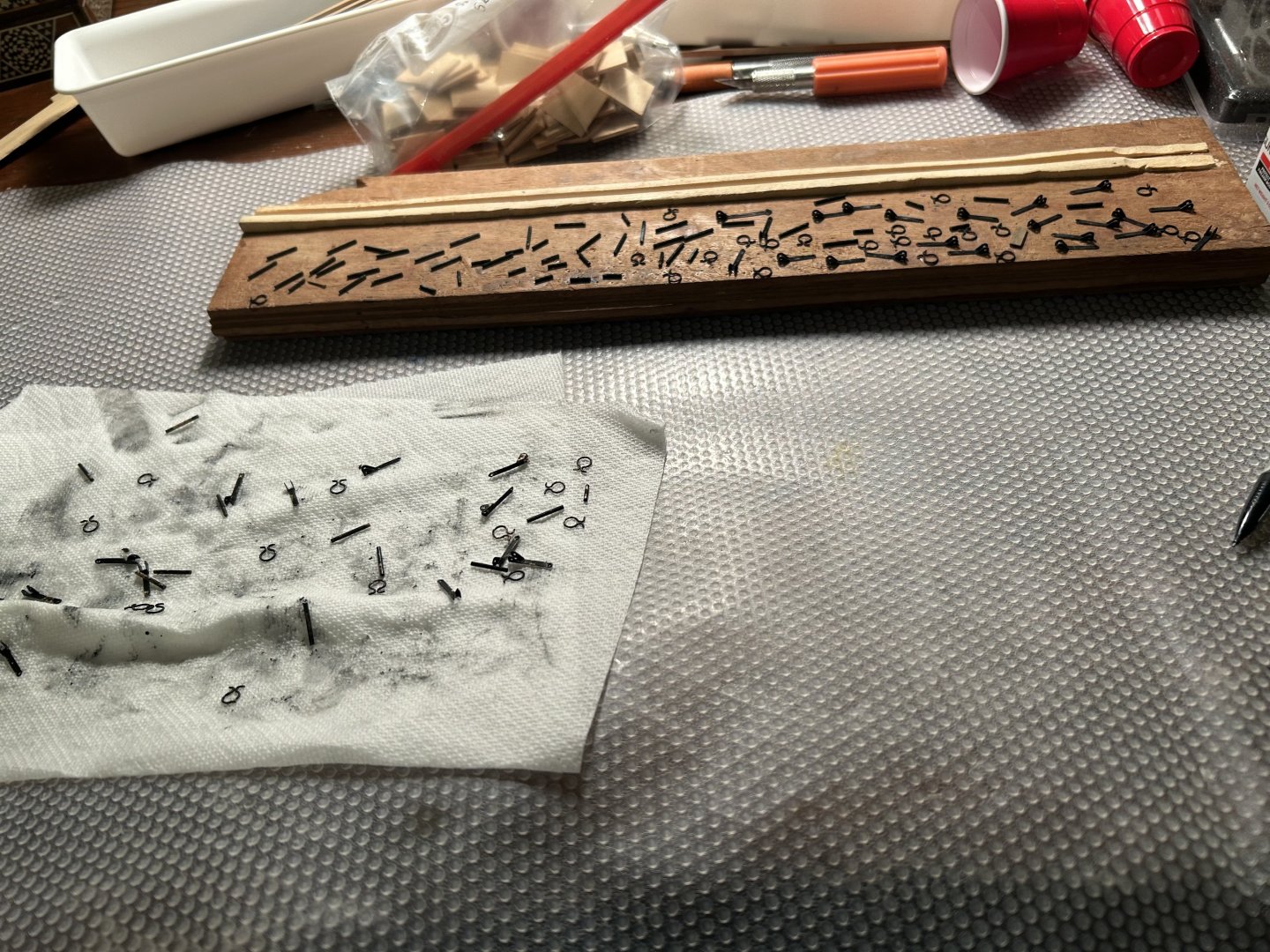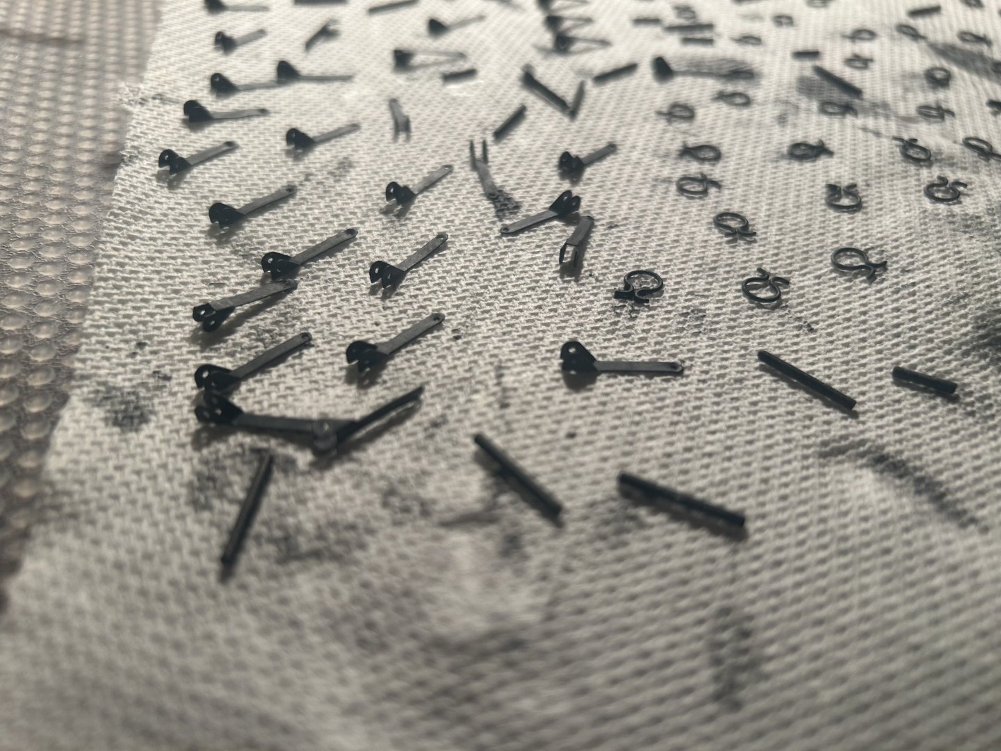 Hey y'all, I've returned at last. I didn't like the brightness of the brass on many of the ship's pieces, so I blackened them all with Birchwood Casey Brass Black. It generated a cleaner result than painting them. The process was arduous. I cleaned them off with steel wool and denatured alcohol, soaked them briefly in brass black, let them dry, then coated them all with Birchwood Casey gun stock wax. The resulting color is impressively solid, and it's not worth going back to fix the few small problems. If someone else chooses to use this method, they should blacken the brass in small batches. I think that gives a better result.