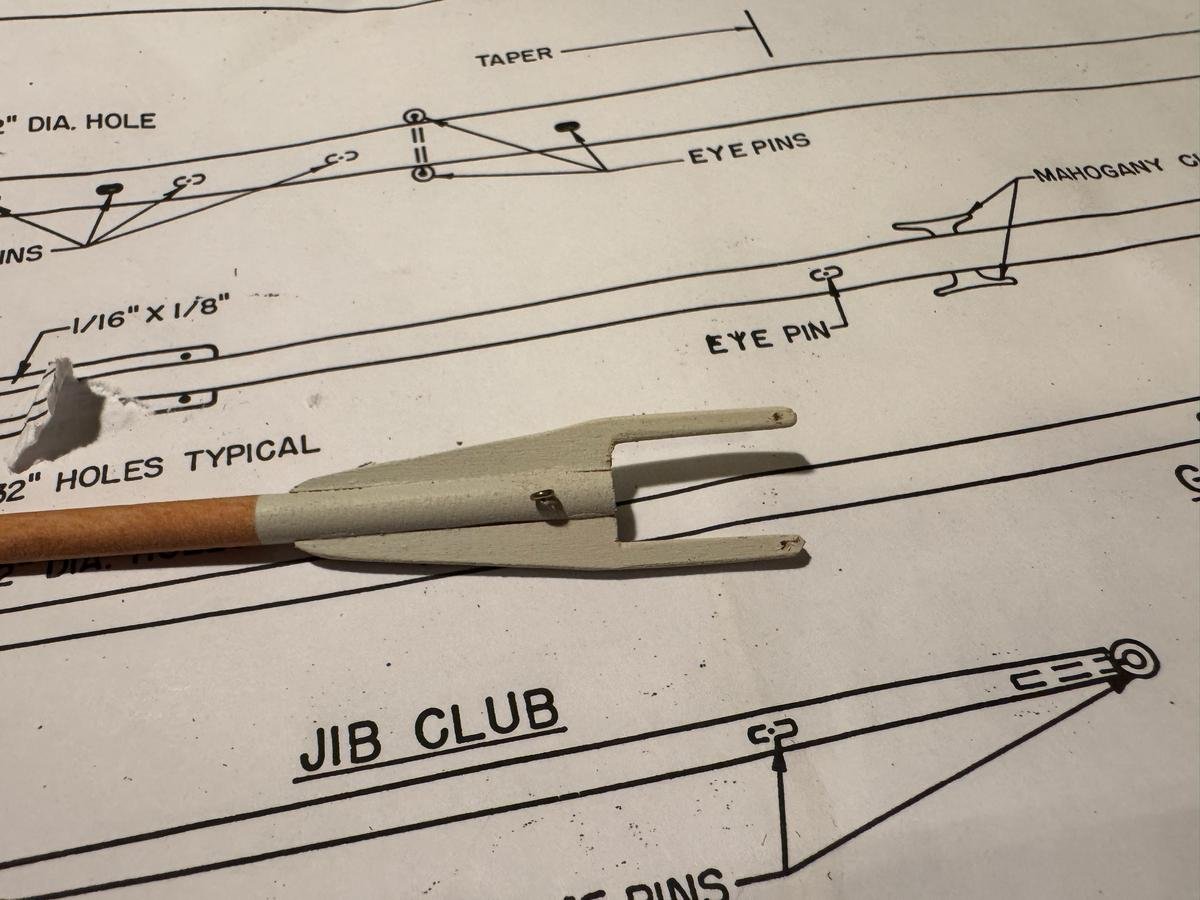 This time with some pictures. Continue to work on the mast and spars and the mast rings. Similar to when I built the America, I am making wooden mast rings. I start with shavings created with a small plane that naturally curl, wrap them around a circular object and coat them liberally with diluted PVA. More details below. First, I start with the shavings and the jig/former. For the shavings, I used a small plane on some of the leftover 1/16th x 1//8th mahogany. They tend to be pretty rough but I am hoping I can smooth things out adequately. As for the former, I have exploited at least 1% of the potential of 3d printing by printing this tube that is 5/8ths of an inch in diameter, to wrap the shavings around. The mast is 1/2 inch in diameter so this will allow the mast rings to fit easily over the mast. Here you can see 5 rings wrapped around two formers, and three rings that I have removed from the formers. To wrap the rings, I start by using CA to glue on end of the shaving to the tube, then wrap it around securing the end with more CA. If I need to add more layers, I grab another shaving and secure it with CA just on the ends. Once satisfied, I brush on a bunch of highly diluted PVA and let it sit over night to dry. I then sand the outer surface of the rings while still on the former, try to remove the ring from the former without breaking it, then carefully sand the top and bottom surfaces. Below is the main mast, the end that goes into the deck on the left. The picture shows the boom rest, created similarly to the mast rings, as well as one pin rail. There is a second identical one on the other side. And finally, the end of the gaff with its jaws, as well as the simple jib club. I still need to do the main boom....the dowel needs to be cut and tapered and then jaws added. then all the spars need to have some holes drilled and eye pins put in place. I also still need to figure out exactly which parts will be painted vs stained.