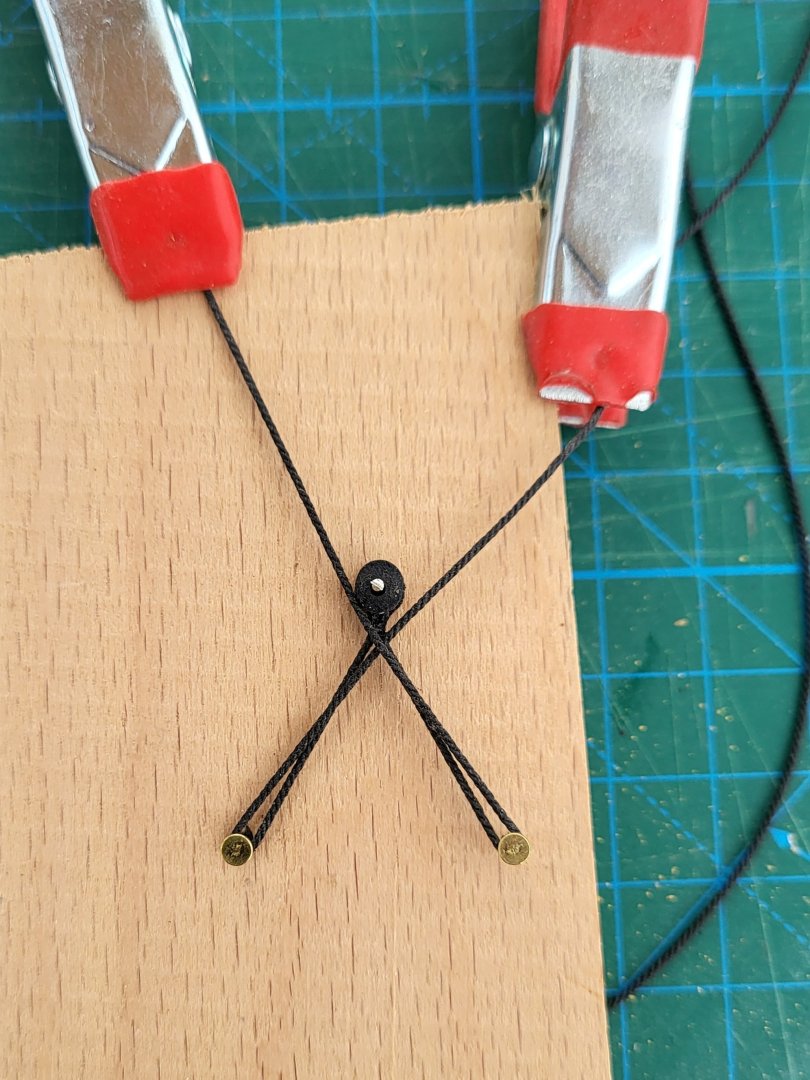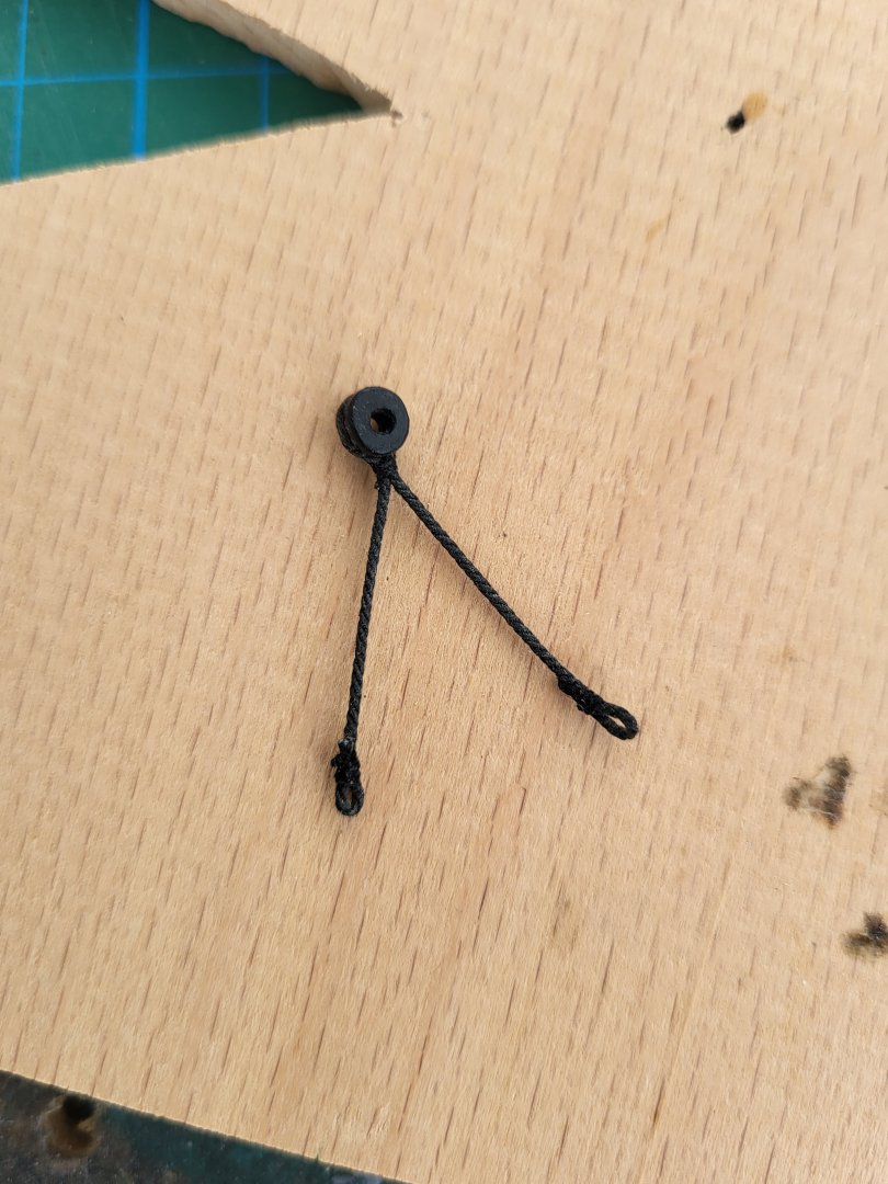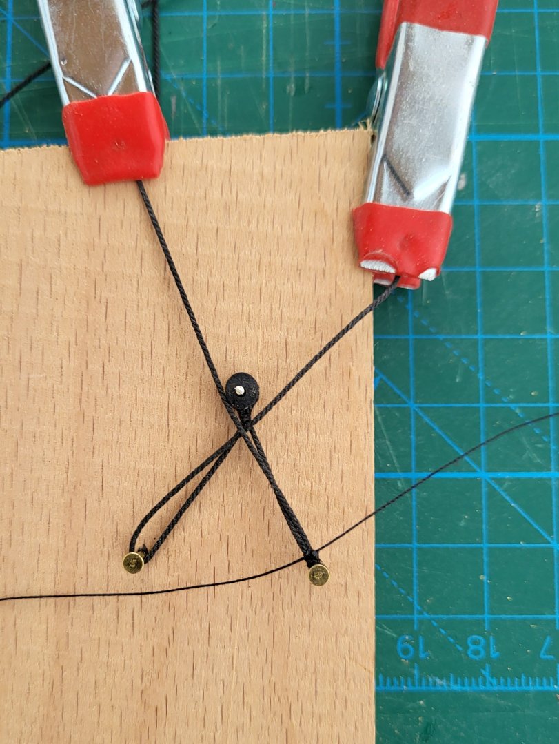 Peter, I attached the deadeyes the same way you did using brass wire; after feeding the free end through the hole in the fighting top, I bent it into a small loop underneath. -