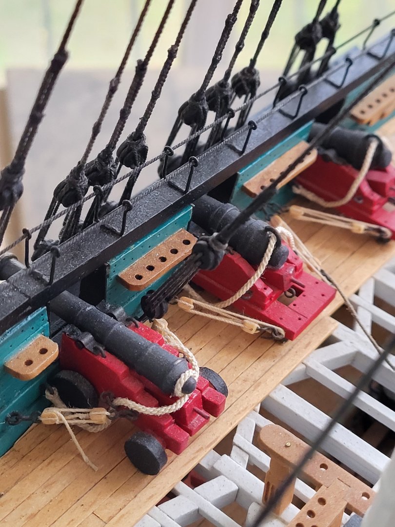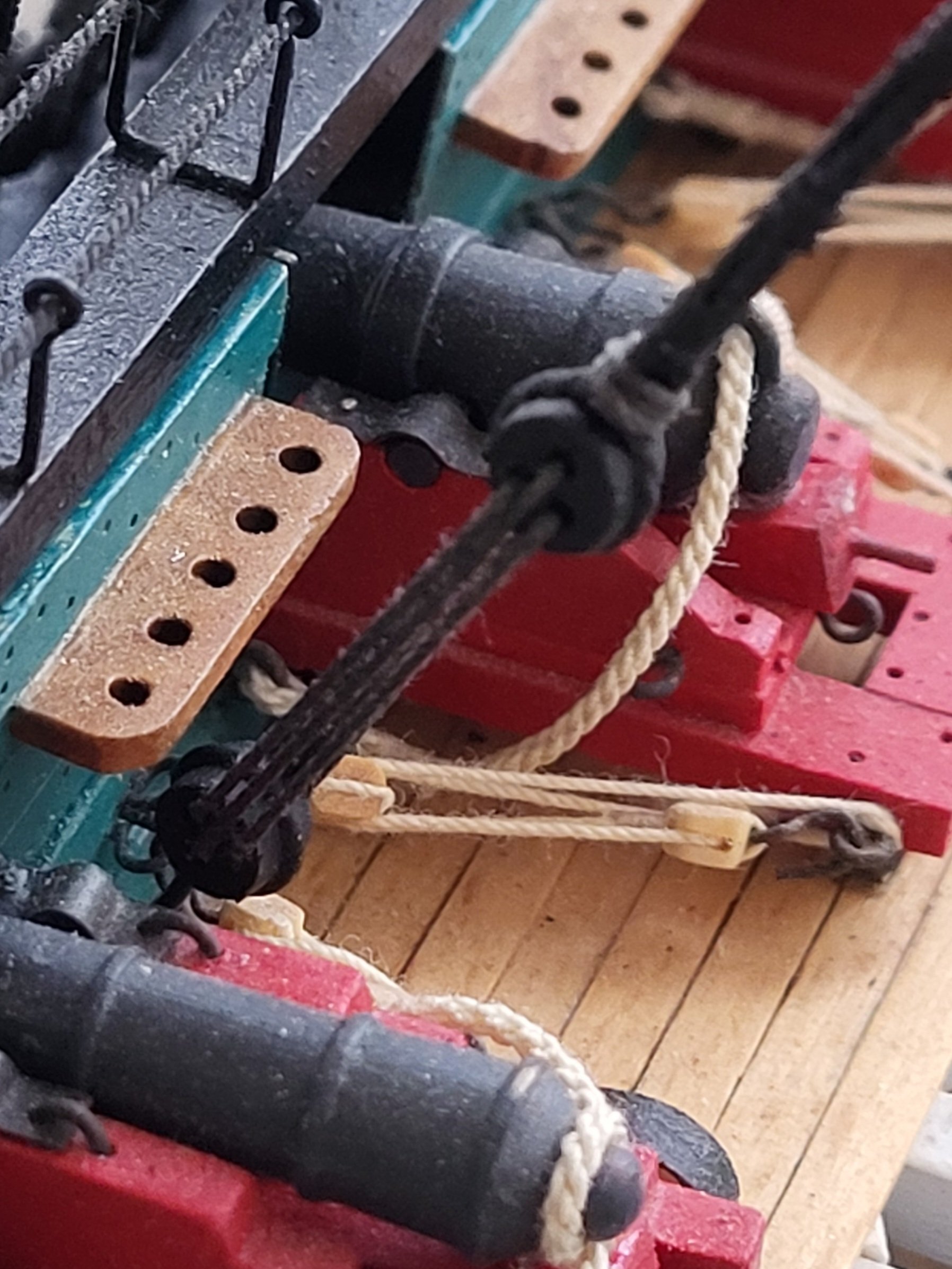 Jon, in the photos of the real ship, the triple block is connected to the eyebolt on the channel via a hook. I'll add a hook to the block as well. -