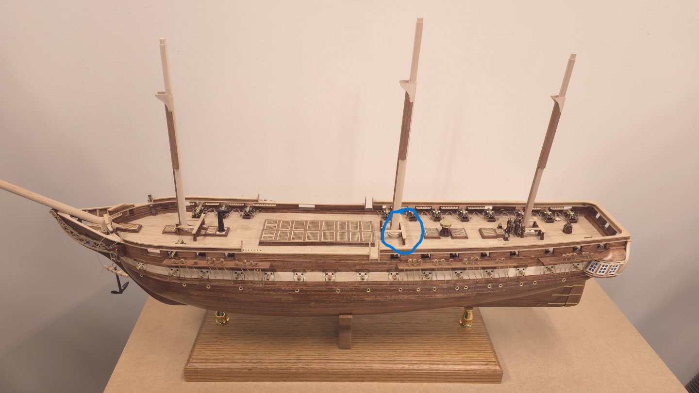 Nice work on the chafing fish, Peter! Just a heads-up—the space between the main mast and the fife rail looks pretty tight in the photo. You’ll need room there for three stays coming off the mizzen mast, which get tied down to the deck with bullseyes. On my build, that gap was really small too, and I had a tough time securing the mizzen stays. Hopefully you haven’t glued the fife rails yet. Also, before you set the masts in place, it’s a good idea to get the eyebolts around them installed first.