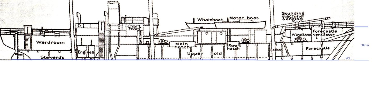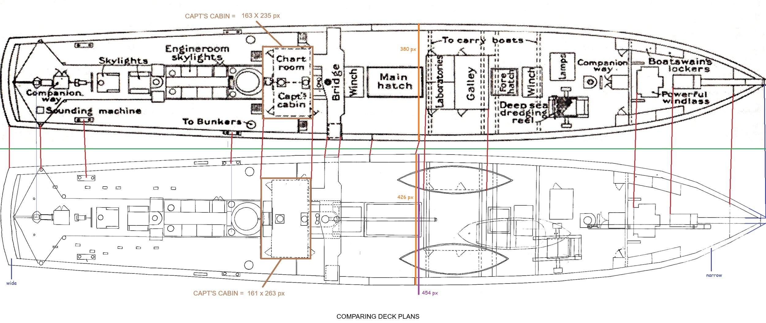 According to resources, the ship was built in Scotland, and they would have been using imperial measurements. So, instead of a 50m base, I am going to use the 165 feet (stem to stern) by 30 feet (beam) as the base measurement. 165' = 50292mm, and 30' = 9144mm The plans I do have are slightly different from one another. I scaled both plans to 2500 px = 165 feet. In this case, the beam ought to be (2500px/165') x 30'=454.5 px. Both plans fall short, or in other words, both beams are too narrow. I am going to widen the beam to 455 px (114mm). So, the plan is to build a ship to 1:80 scale, or (165' x 12 x 25.4) / 80 = 628.65mm. Since the whole thing is an estimation, I will make it 630mm (stem to stern). The waterline to the stem deck is about 230px (58mm). Hence, I need to carve a ship from a 630 x 144 x 58mm block/sandwich of wood. Other deck items have different sizes. I have trouble understanding how plans of the late 19th century can be out of whack. Anyway, I will do what I can without going overboard and drowning in my own confusion.