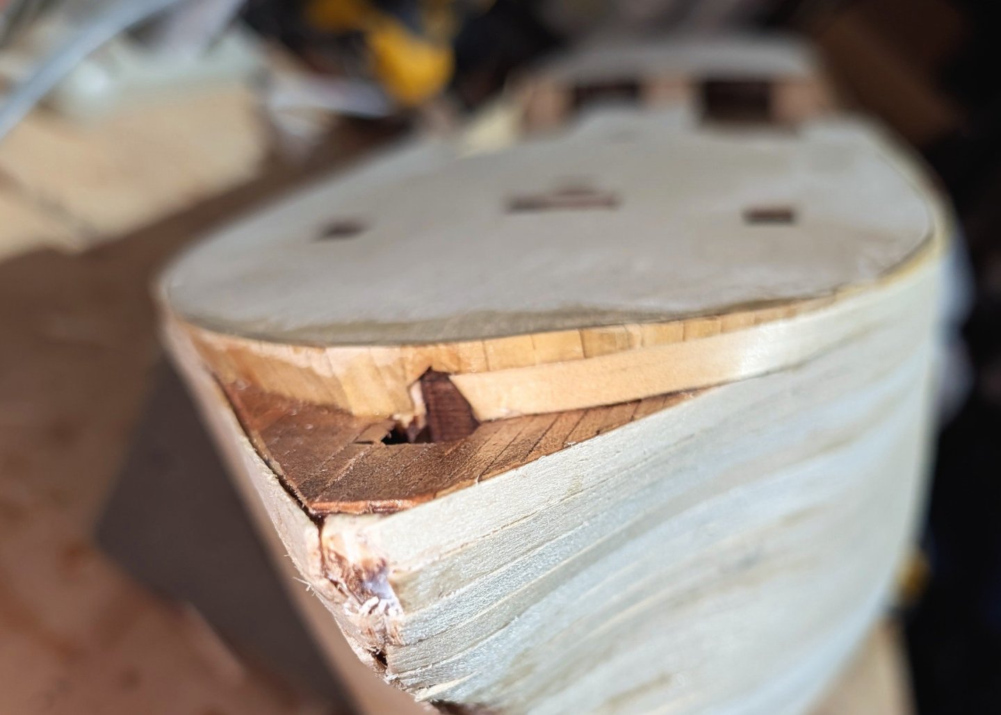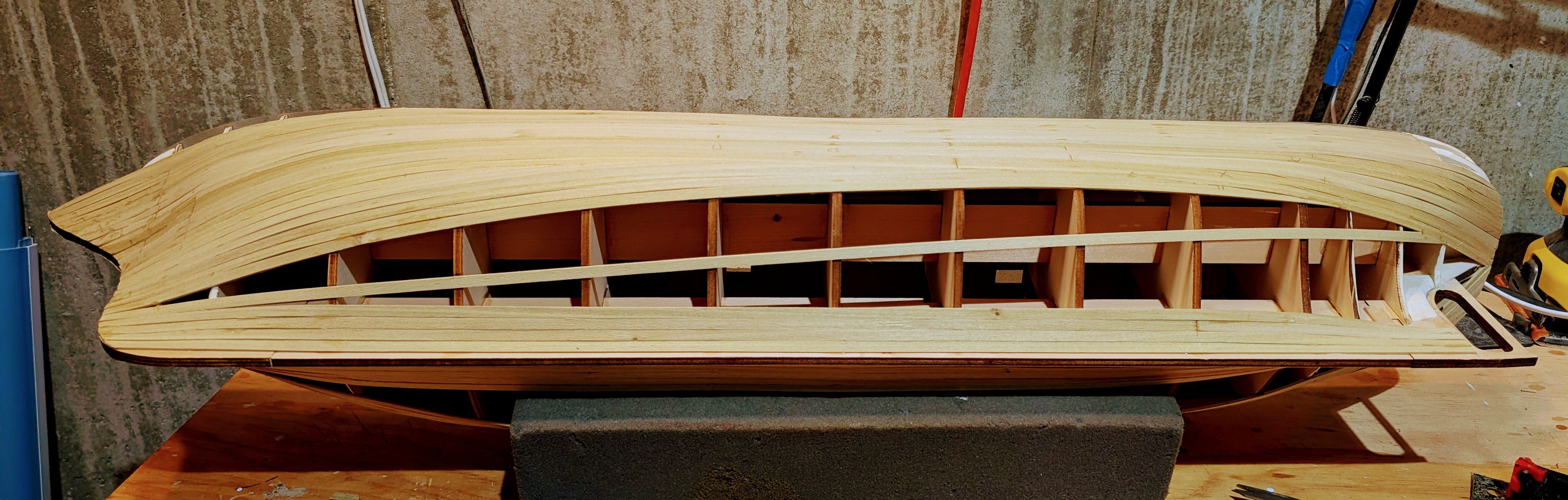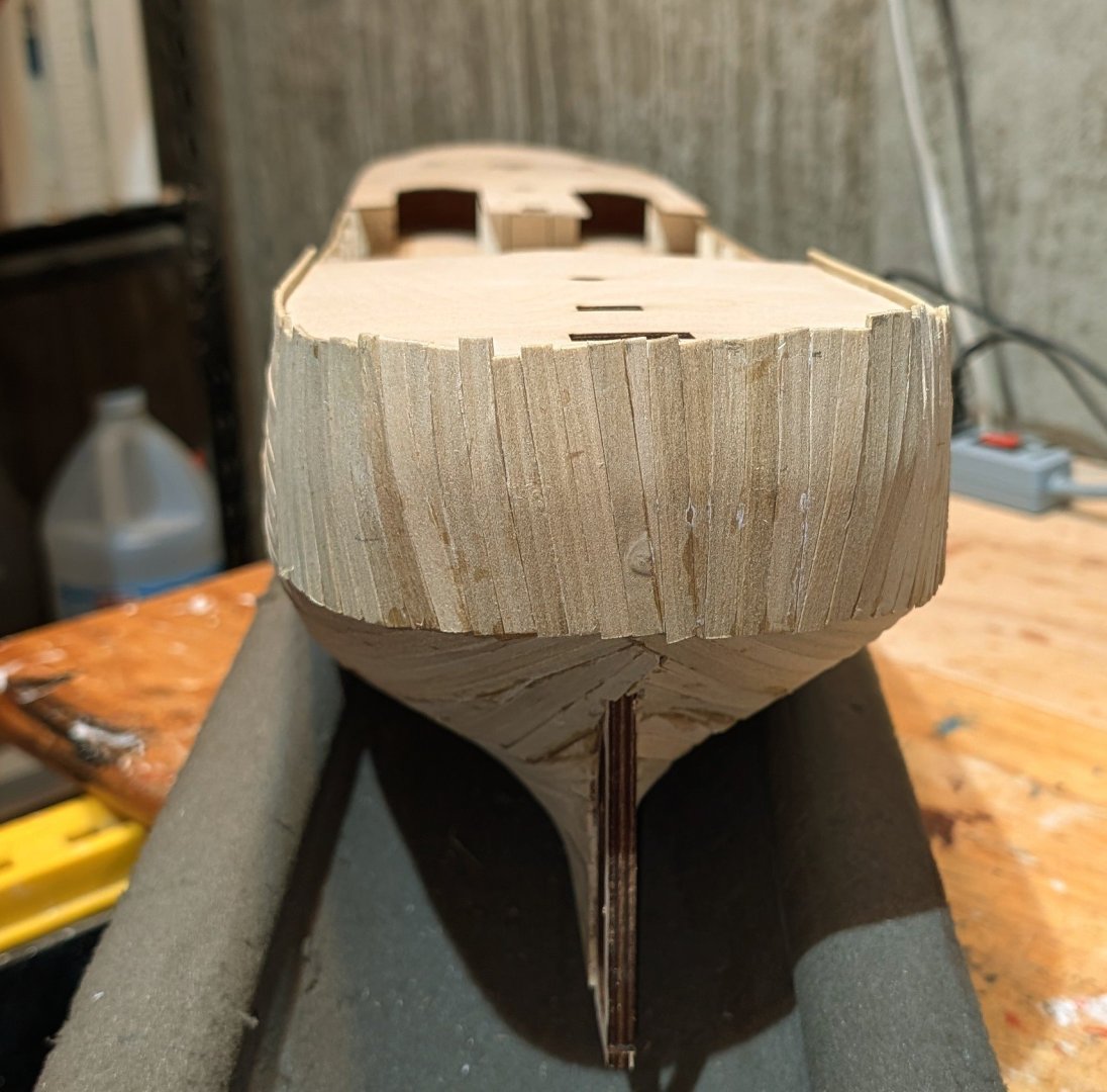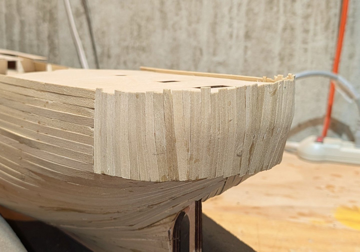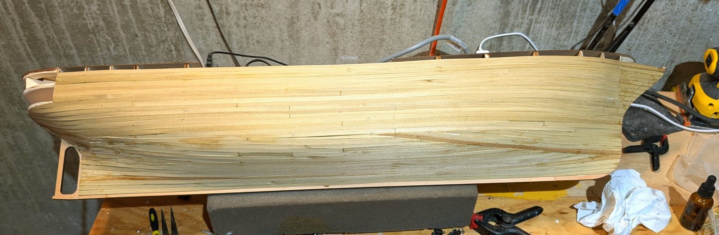 This is kind of a first for me in planking. I've tapered lots before, but I felt like I was running out of tapering and curving room, so I carefully dropped in this diagonal plank, which I can now work from both sides. Think of it as multiple massive stealers going in now. Hopefully this will work out OK. Regards, David