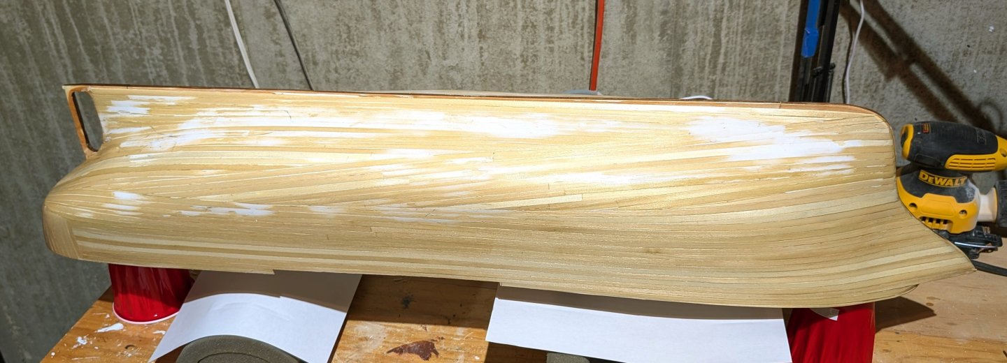 I'm able to use horizontal planks at the bow because the second planks are very flexible (with steaming), and only two rows will be needed. At the stern, I don't think horizontal will work because the curves would require lots of stealers. The stern is easy to sand smooth -- the bow is difficult to get to, which is another argument for horizontal planks. On the right, it looks in the photo like the plank has buckled, but it's actually a smooth curve. Regards, David