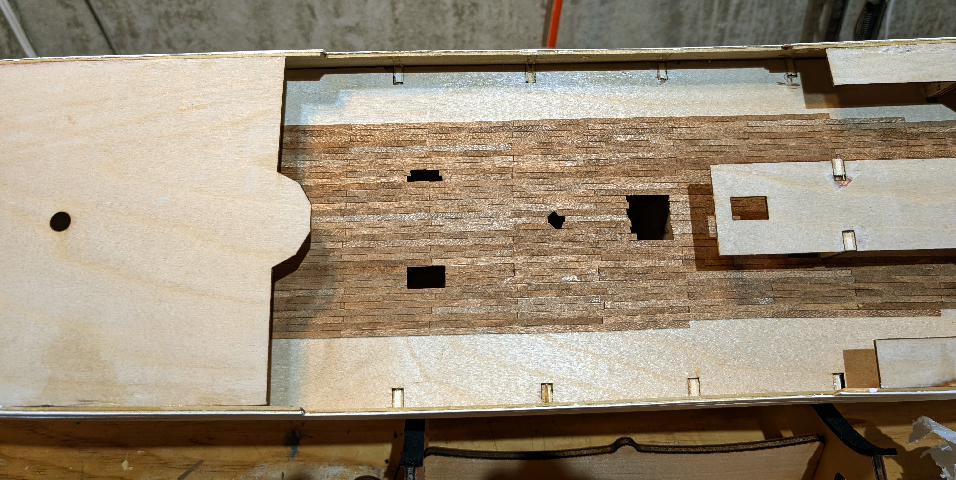 Here's deck planking in progress. The strips have to be stained (as noted above for the small bow section), and I think the deck will look pretty good when varnished. I'm going to have to test to see what kind of sanding will work, as I'm concernd that normal sanding will take off the stained layer. But without sanding, a slightly weathered appearance will look good. Regards, David