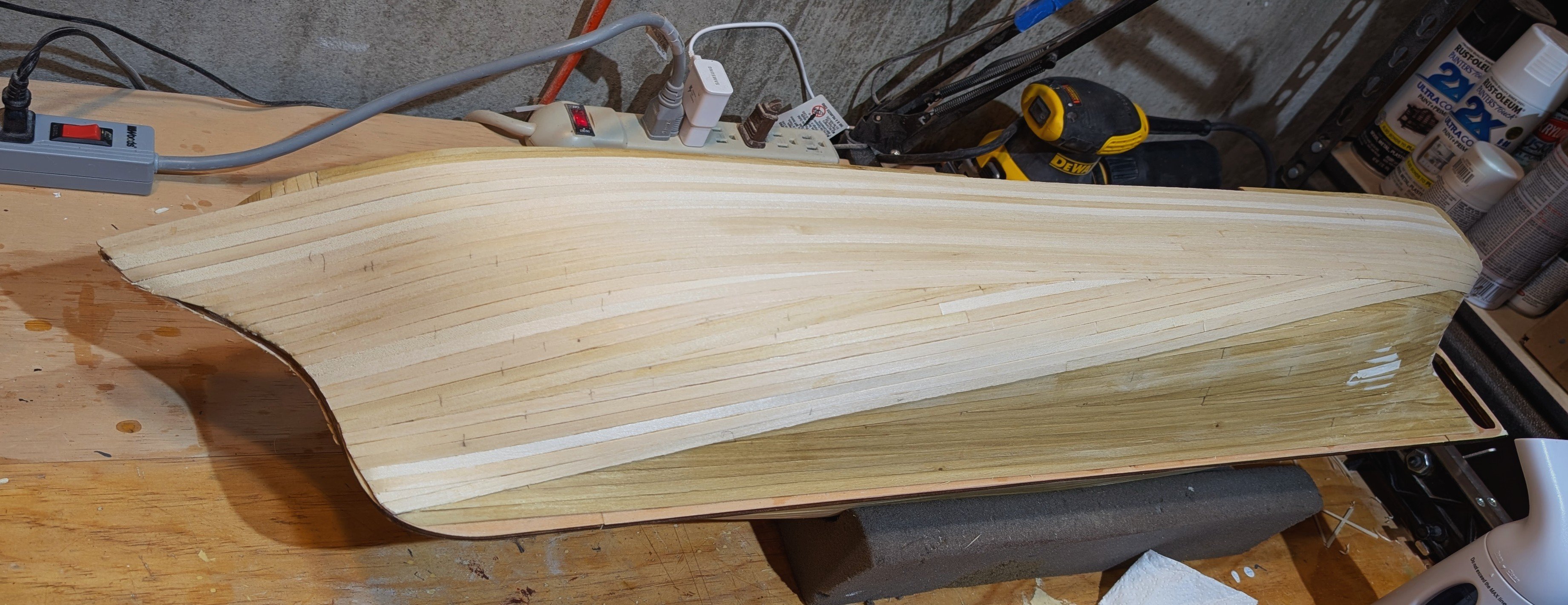 This is kind of a first for me in planking. I've tapered lots before, but I felt like I was running out of tapering and curving room, so I carefully dropped in this diagonal plank, which I can now work from both sides. Think of it as multiple massive stealers going in now. Hopefully this will work out OK. Regards, David