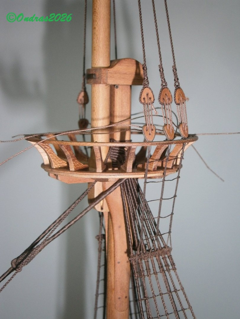 Bowsprit equipped with blocks.. Ready and tight Stays.. Added Ratlines metal crossbar (Futtock stave).. Ratlines knot tying begins.. -
