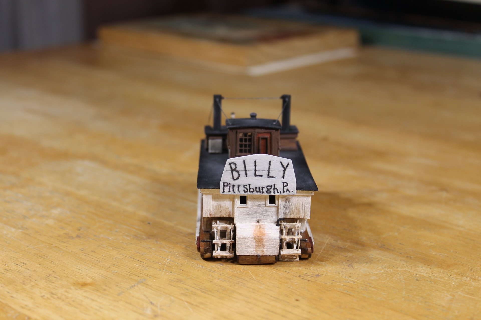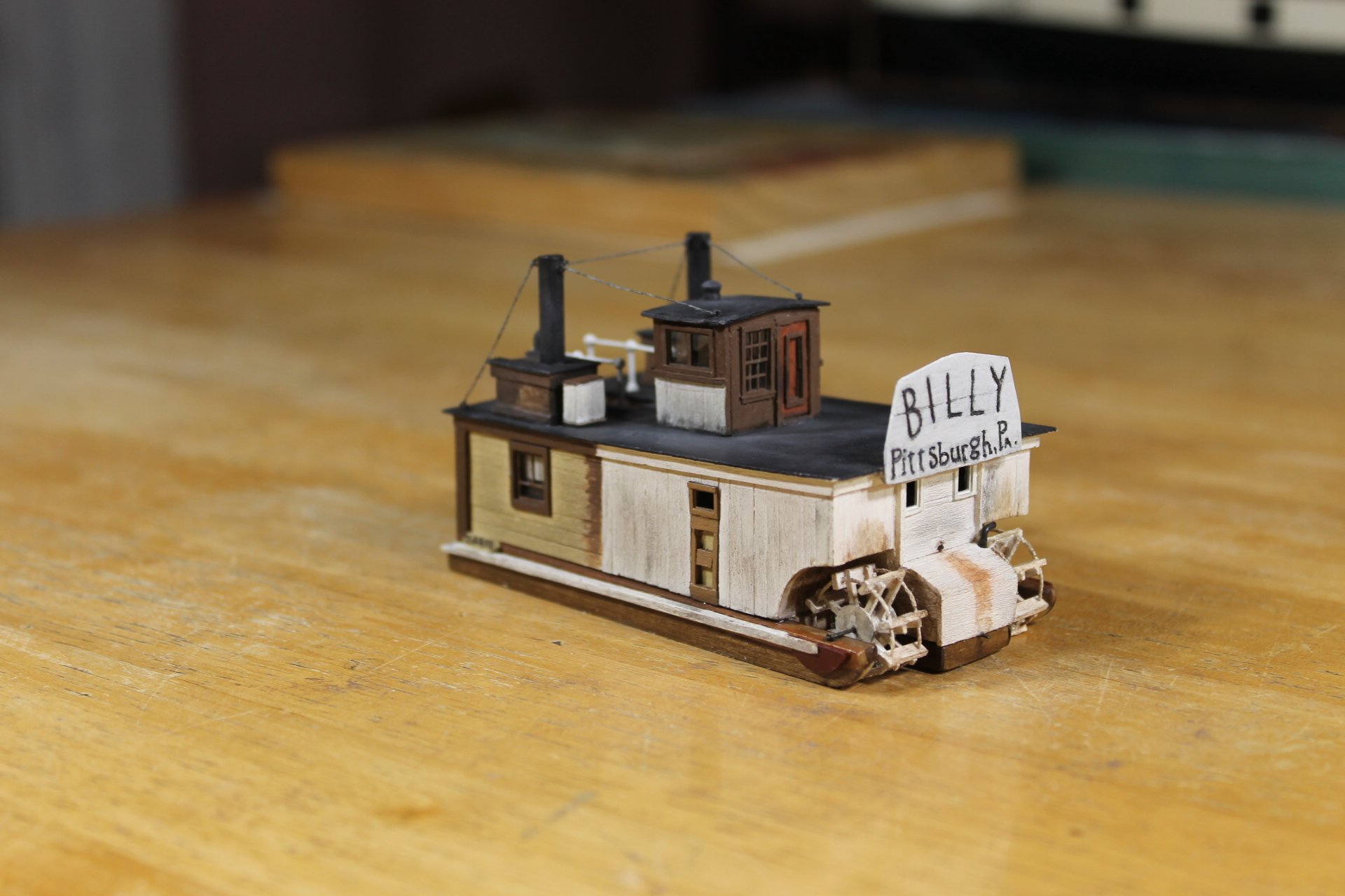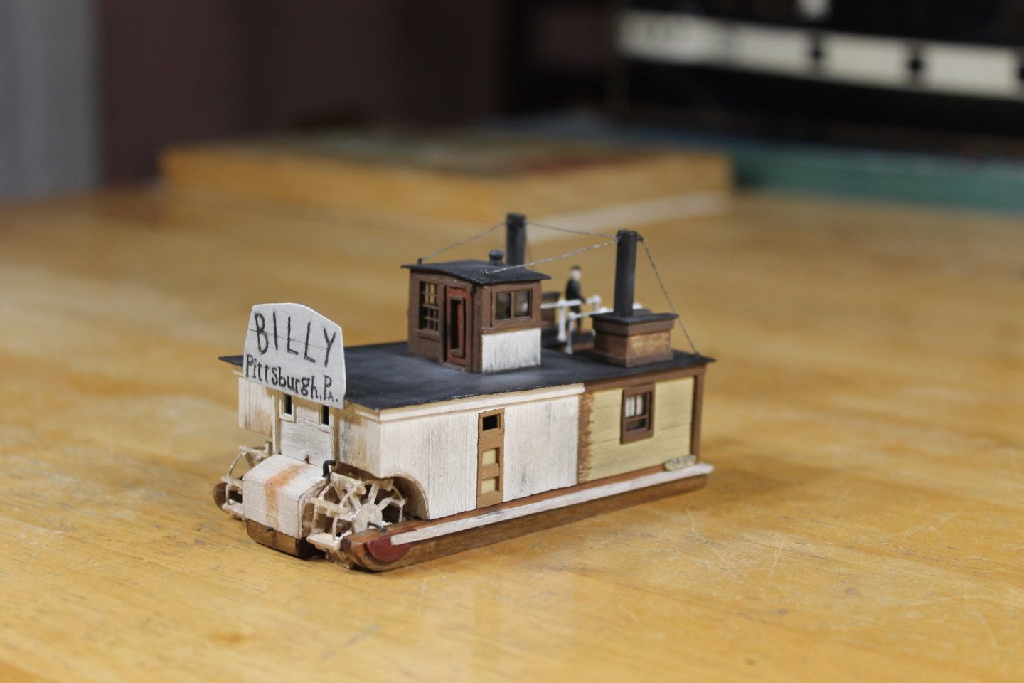 A huge thank you to each of you for following along, for the likes and the kind comments. Your support kept me going when difficult times arose during the course of the build. Billy is finished. After a mere three months my journey with Billy has ended. It started with a chance discovery on eBay of the press photo and press release and I was immediately enthralled by Billy's quirkiness. I've viewed thousands of historical sternwheeler images and Billy is unlike any sternwheeler I've ever seen. I knew instantly that Billy was a subject I wanted to try and model. I tried to adhere to Billy's photo as best I could till it came to adding the dummy stacks, I made the stacks straight. In doing so I moved Billy's timeline forward ever so slightly to a time when A. O. Engel would have had a chance to straighten them. It's here I have to admit that the straightened stacks was vanity. I dare say in time Billy will become separated from the press photo and I didn't want someone in the future thinking I couldn't manage getting the stacks straight. All I could hear in my head was, "the guy was a pretty good painter, you would think he could have managed to get the stacks straight". Once I had moved the timeline forward, at the end of Billy's build I decided I wanted Billy to represent Capt. Engel's finished dream of how he saw Billy in his mind. No lumber or junk on the boiler deck, everything nice a tidy with Capt. Engel at the bow taking one final look forward before entering the wheelhouse to start the journey south. I've enjoyed my time with you Capt. Engel, I feel like I've gotten to know you and you've become a friend separated by time. Fair journey and may the river run smooth before you. These aren't very good photos, I blame it a low camera battery. I promised Keith Aug I'd take and post photos of my working fleet, hopefully the photo of Billy and the rest of the fleet will be better. Again, thank you. Keith