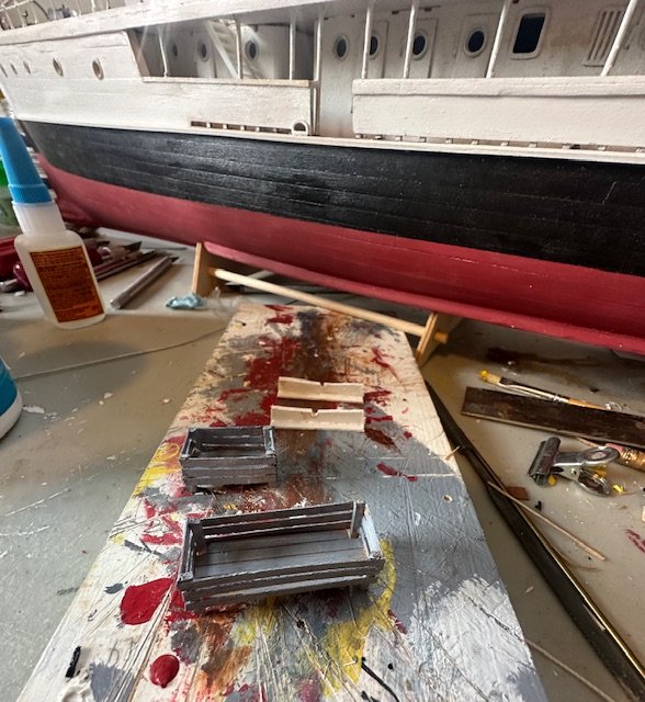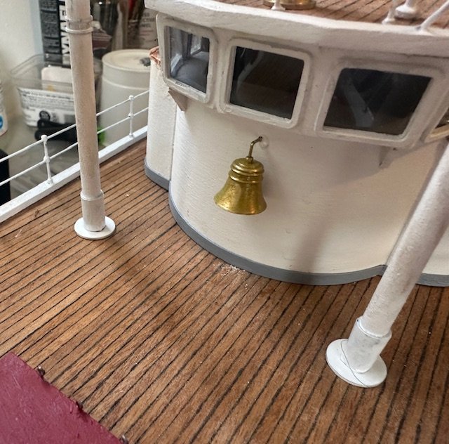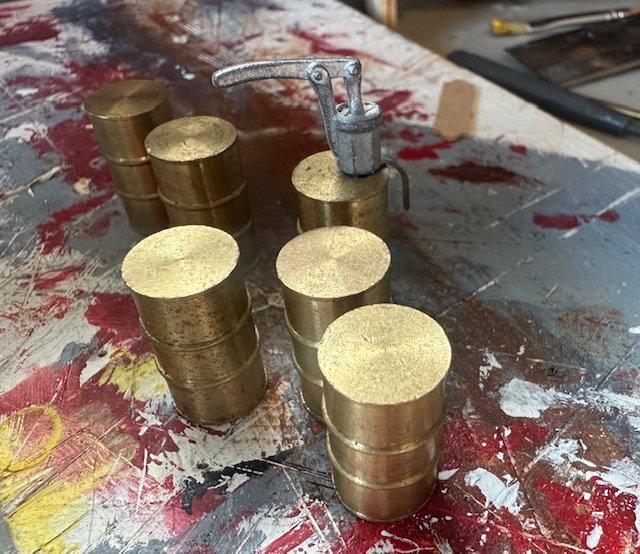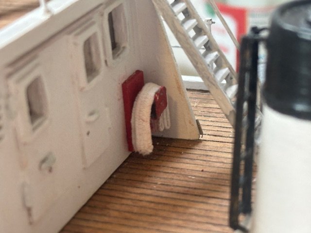 I had the time to do a few small detail projects this week. I received an aftermarket bronze bell and antiqued its shiny surface and installed. Painted the cradles for the runabout boat and constructed the wood slat storage bins and painted them gray. Then made a hanging firehose detail. Still need to add a valve. I believe my next step will be painting these beautiful brass barrels and making cradles to hold them. I have added an aftermarket handpump to one of the fuel barrels. .
