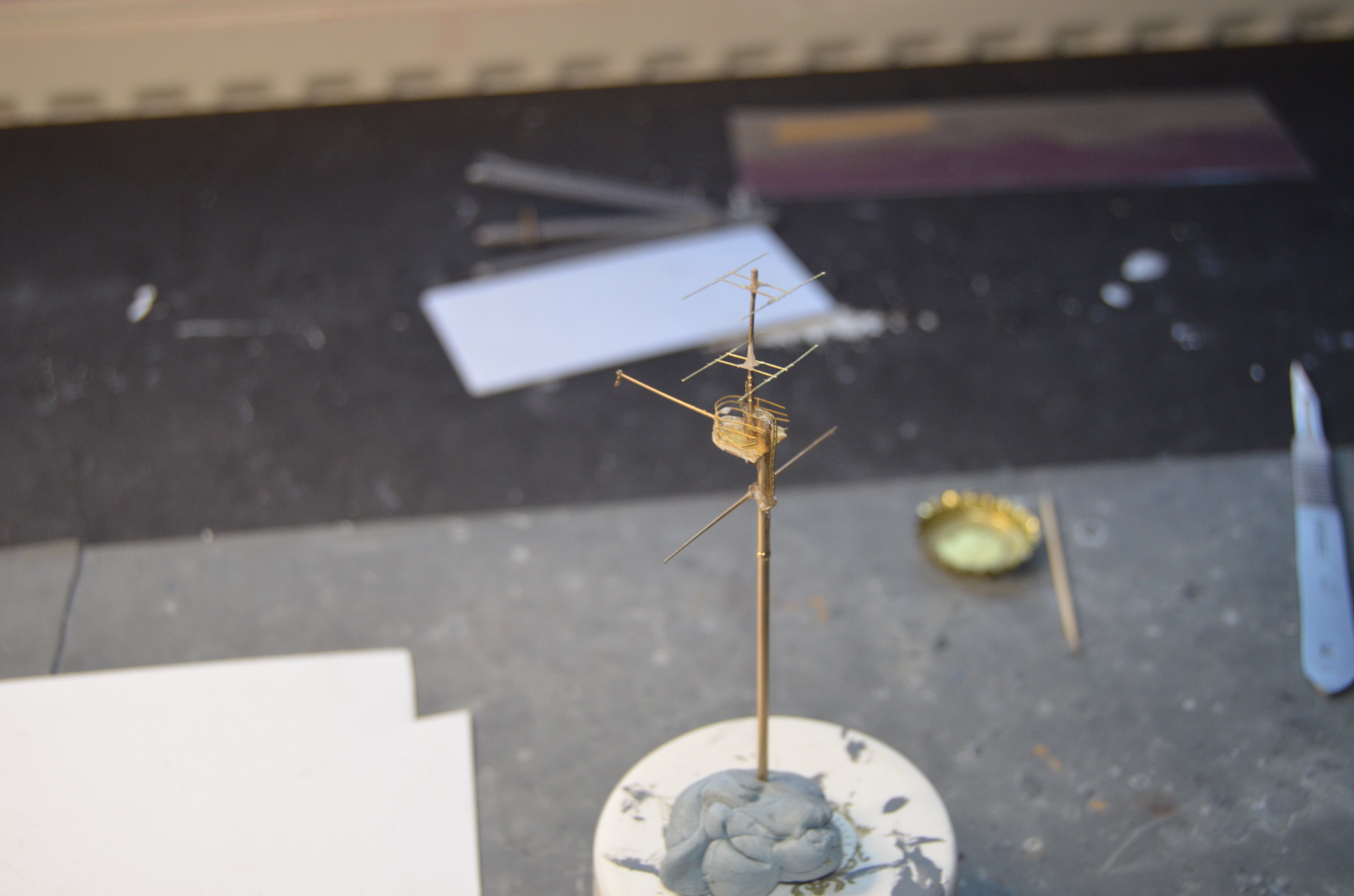 The bridge and masts completed and in place. This was a real problem because the masts fitted perfect when I dry fitted them. However once I added all the parts they would not hold in place with CA glue because of the tension in them. So I have glued them in place with Araldite. This has glued them in firmly. I then realised I had not added a part that goes below the starfish and holds the spar in place. So I have had to add half of it and luckily it does not show up to much. Just have to work out the rigging now and decide how much to add. My problem now as the Doctor is always telling me when I bring it up is the age related hand trembling. Tring to tie off rigging in close quarters makes it appear as if there is a earth tremor going on. I will also see is I can add some of the funnel stays. Although I should have done so before adding all the parts around the funnels.