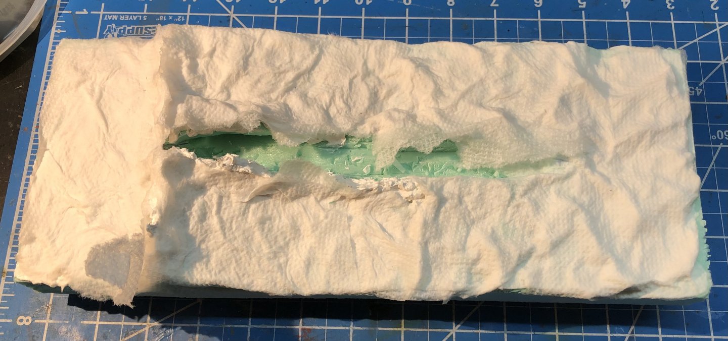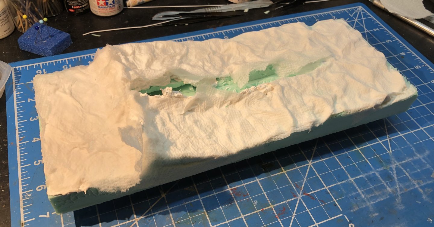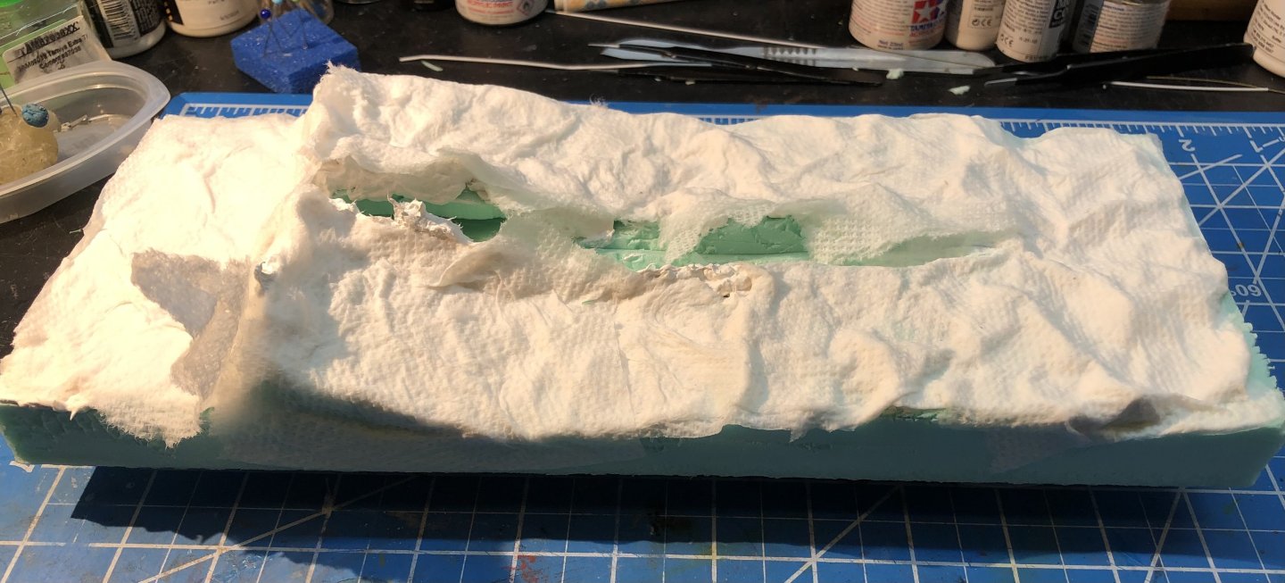 Today I used torn paper towels soaked with diluted white glue to soften the scuptamold surface and then pushed around the wet paper to form smaller surface details. Some edges have been left to help the modeling of the wakes around the hull. This is now drying. I may add another layer tomorrow. Thanks for looking in, the likes and the comments Alan