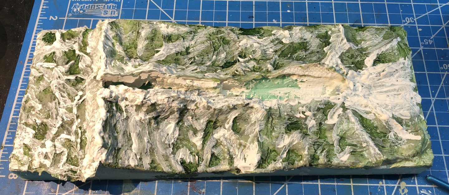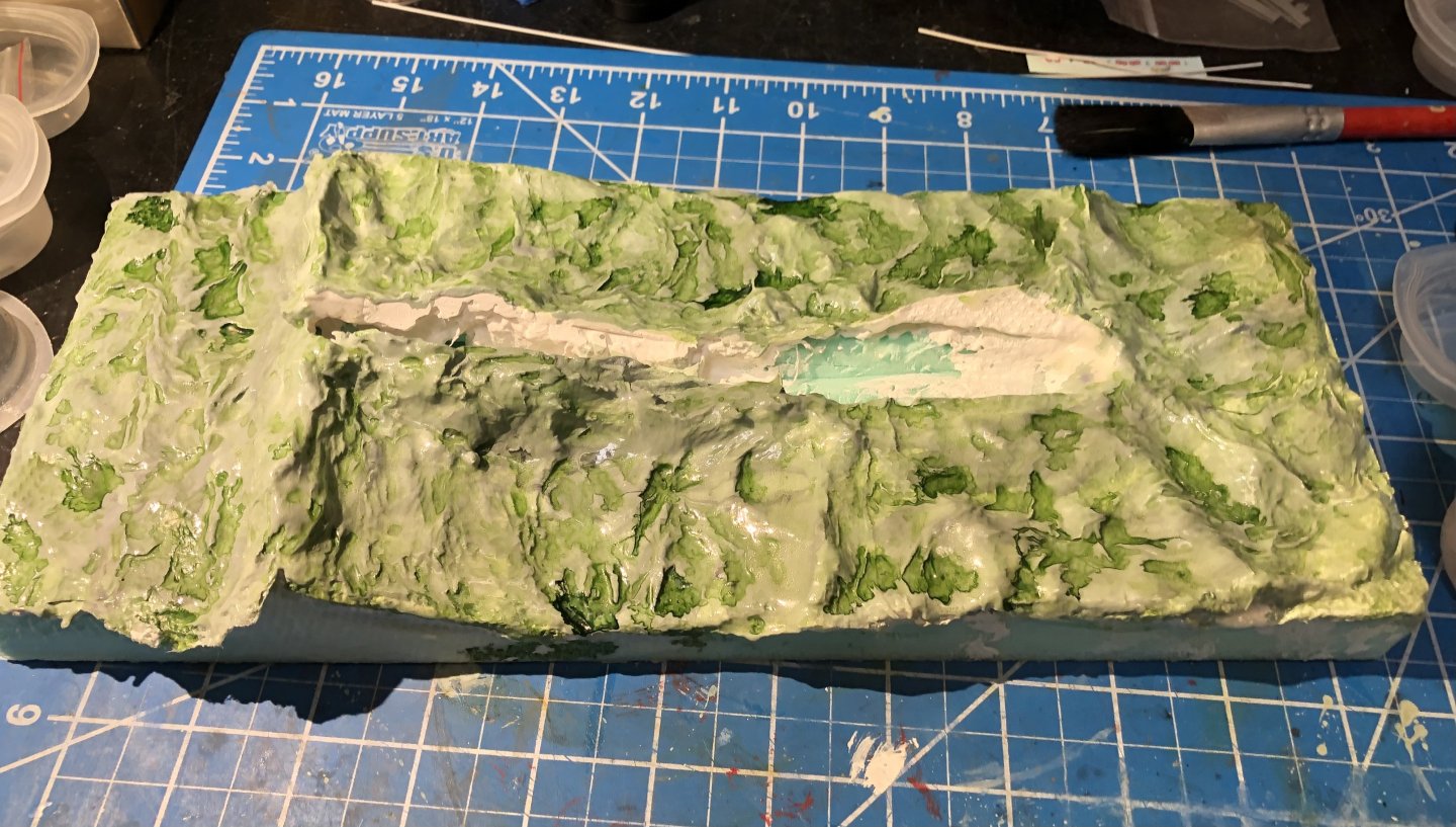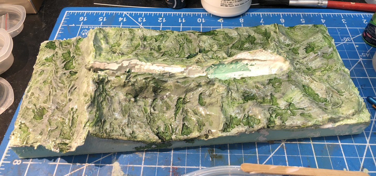 I seem to have been very slothful during the Christmas period with not much getting done on Monmouth. I added a slightly darker wash in the shadows of the waves and painted a coat of gloss medium over the whole thing. I’m still undecided about the overall color being too light and I thought the gloss might help me decide. I’m tempted to start adding the wave crests and foam and see how it shapes up. I’ve been looking for the bag of teddy bear stuffing that I used for my Flower corvette but I can’t find it anywhere so Ive ordered more. I’m writing this sitting in Atlanta airport waiting for the flight to Manchester. I will be in Europe for three weeks so no progress until later in January. Happy New Year all alan