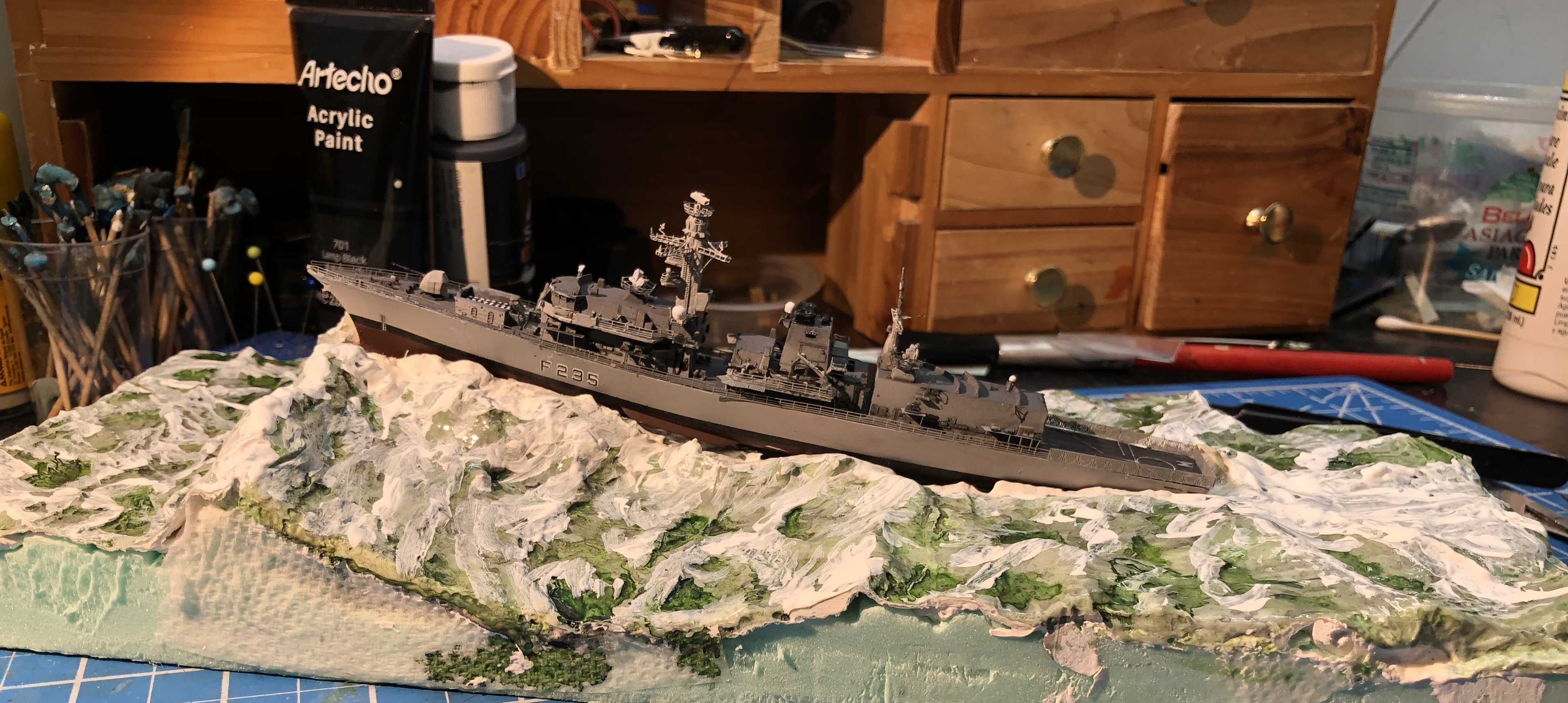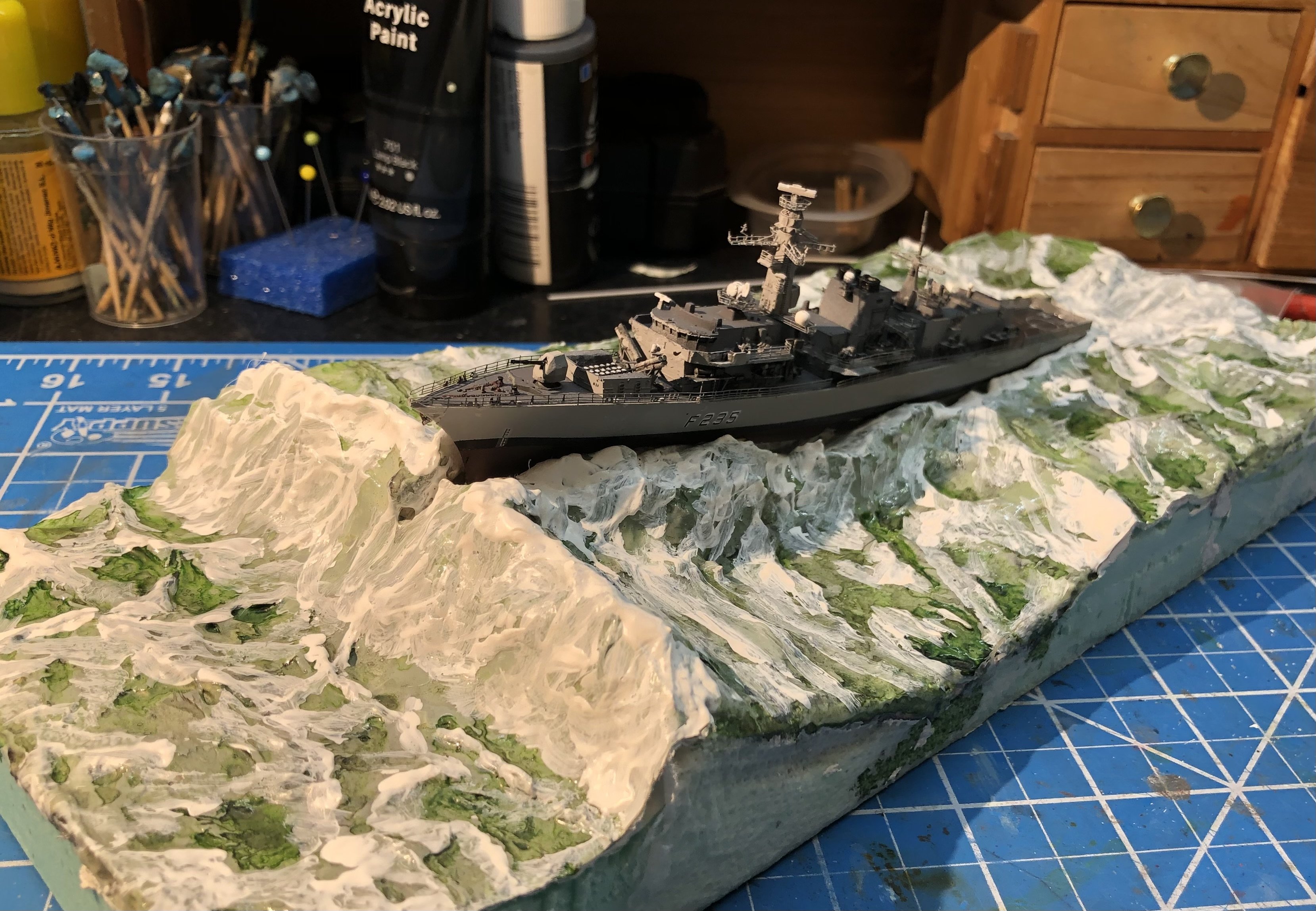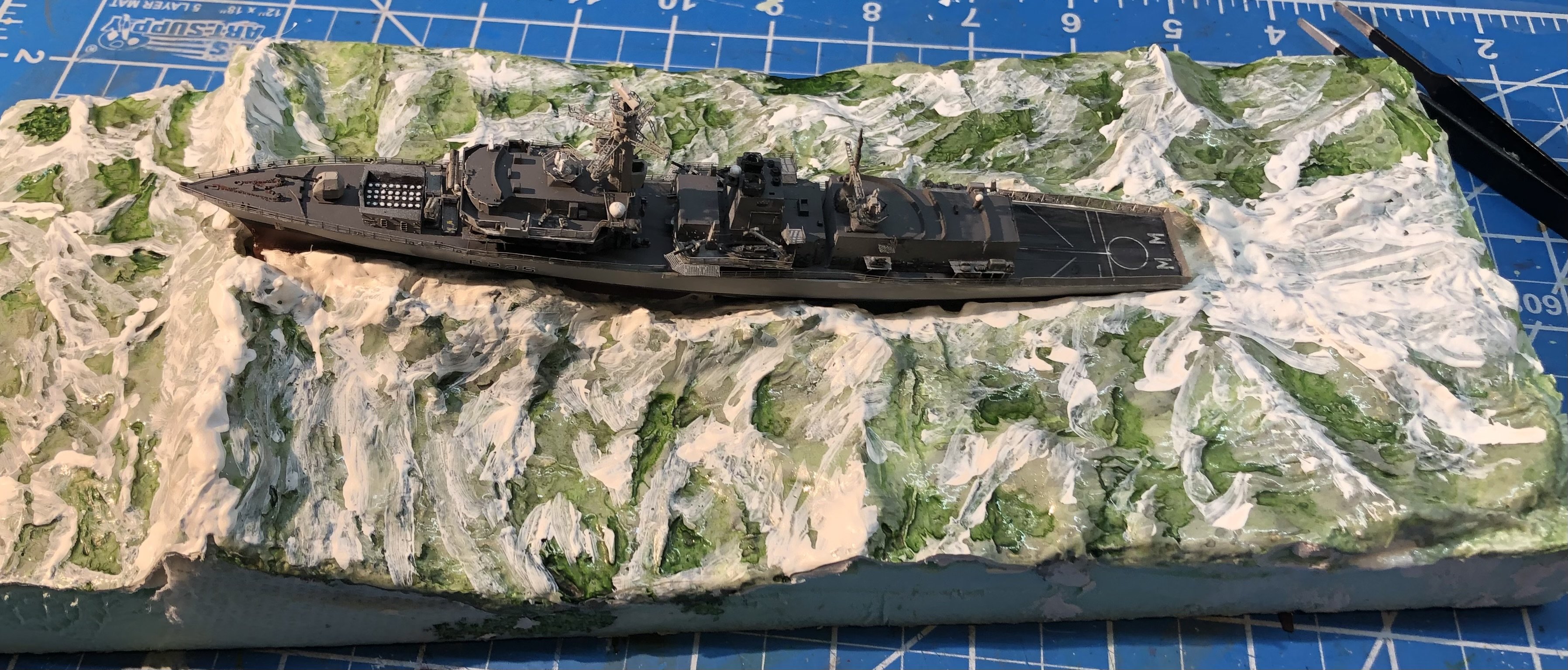A belated happy new year to everyone. I’m finally back home and starting to pick up where I left off. i got to Amsterdam in time to get stuck there because of the big winter storm. I was there for five days with flights and rail service cancelled. Luckily I found a very nice hotel in the city centre and made the most of the time. Finally I was able to get to Berlin by train to visit old friends about to leave for Japan and then back to the UK to spend some time with my dad. I missed out on some time in Poland but managed to pick up that awful flu that is hitting Europe hard. Yesterday was the first day I felt like getting off the sofa and doing something constructive. I spent some time looking at the seascape and decided I didn’t like it, they were colours were too just a dull series of grey and not convincingly watery. I gave the whole base a wash of heavily diluted sea green acrylic ink and allowed it to puddle in the low spots. I think that’s going in the right direction but it’s a bit too green now so I added a wash of diluted black acrylic ink which toned the green down nicely. I then added a mix of Liquitex gloss medium with some acrylic white paint stirred in and started working on the wave tops and areas of foam. it’s a bit rough still but it feels like it’s got a bit of life now. I checked the fit of the hull and decided to add Monmouth to the base. It might be a bit premature but the PE on the model makes it very fragile and I think it’s safer on the base. As it was I managed to knock two pieces of the flight deck netting off My next task is to start working the teddy bear stuffing into the spray and foam but I can’t find the bag left over from the Flower corvette seascape. Hopefully progress will continue in the next few days. Alan
