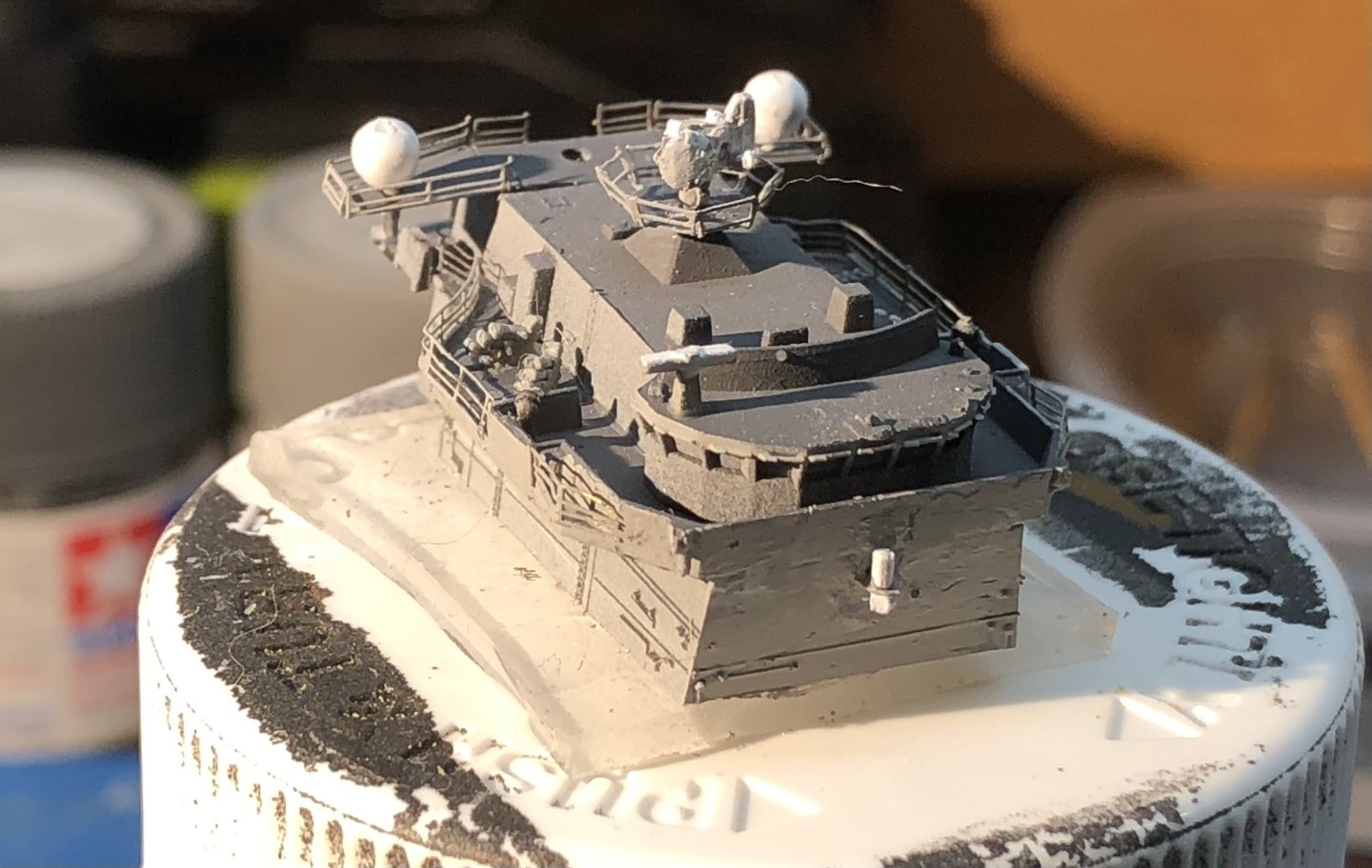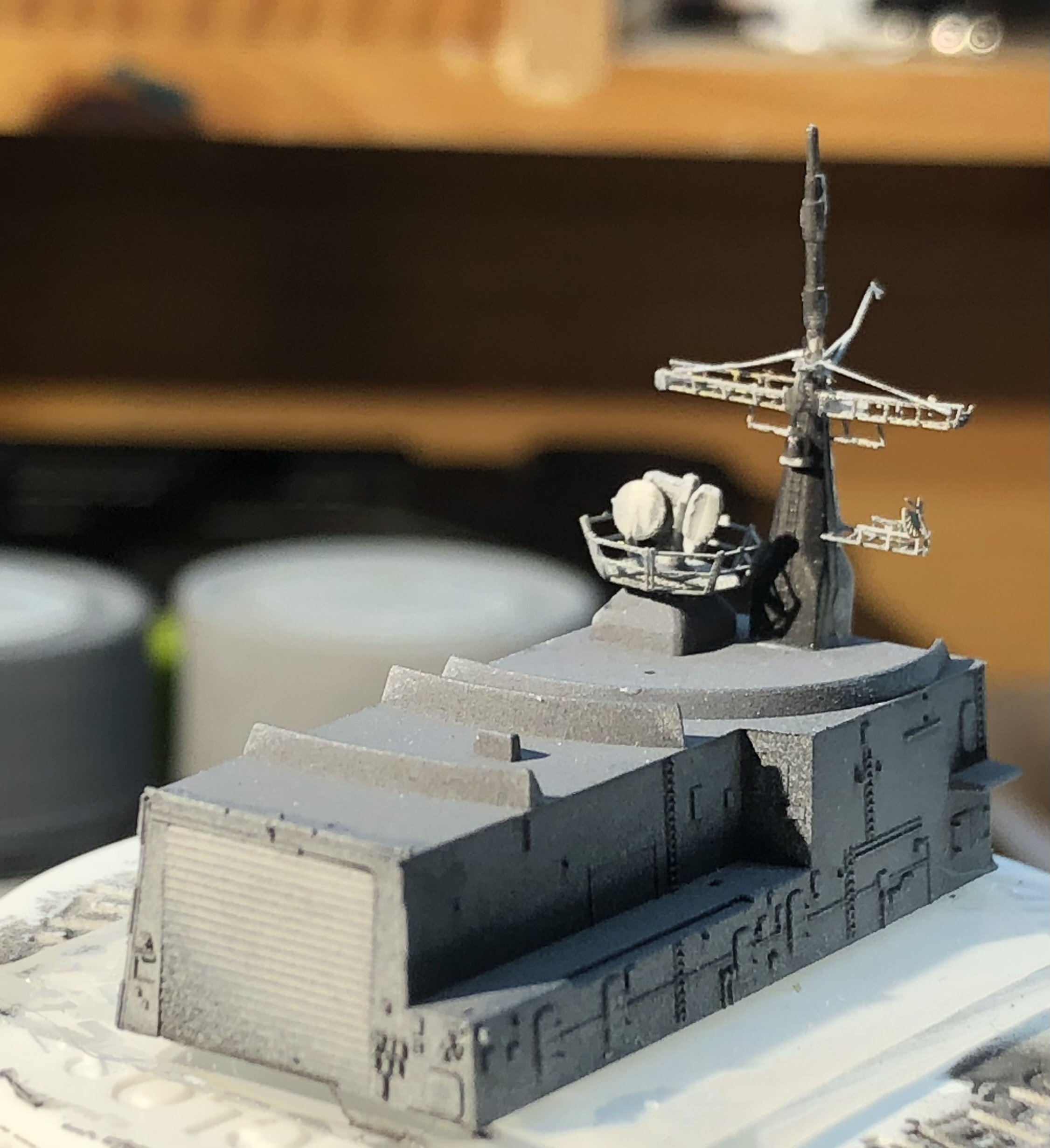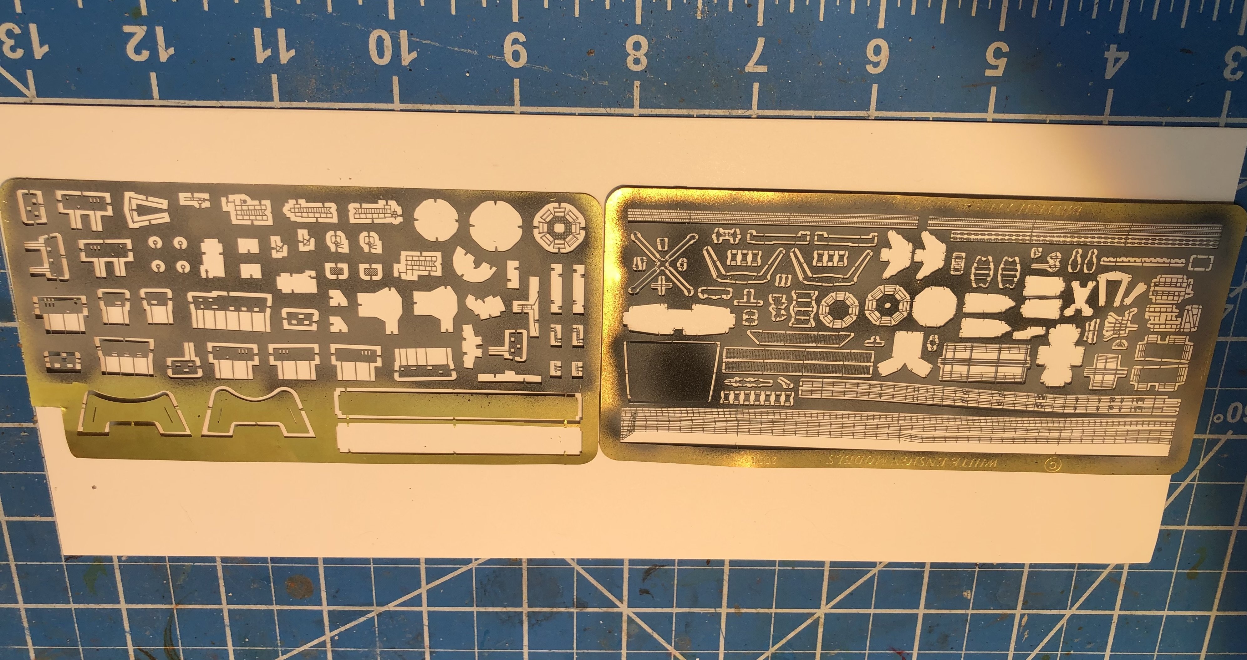 In spite of the lack of updates some work has been done along with some backwards steps. I’ve mostly in tiny PE world but thankfully I think it’s mostly done now. Heres the two frets showing the gaps. Trumpeter on the left. I still need to add the side decks but they will need to wait until the structures are added to the deck. And it suddenly occurred to me that I’m making a diorama around this model and that’s going to involve a lot of trial fitting of the ship into the seascape so I probably shouldn’t wait until Ive got a very fragile model to do that. So I think it’s time to address the seascape which will be light relief from tiny bits. i just finished making up the Harpoon launchers. The plastic kit parts are horrible so I used the WE PE frames and pieces of .020 diameter plastic rod. This was going quite well until I lost one of the PE frames. It’s taken me two days (really) to find it. It had jumped into the spares box somehow but meanwhile the workbench area is now the cleanest part of the house! plastic kit parts are shown to the right of the WE launchers. bridge structure is complete apart from adding the foremast which will wait until the bridge is secured to the deck. midship structure is also complete The hanger needs a few very small PE bits adding but the mainmast is thankfully complete. yardarms on both masts are a disaster waiting to happen. Every move I make seems to end up with me knocking one of them off. Luckily they are still the proper shape. it’s felt like I was making no progress but I think it’s going to move a bit faster now. Thanks for looking in, for the likes and for all the supportive comments. Alan