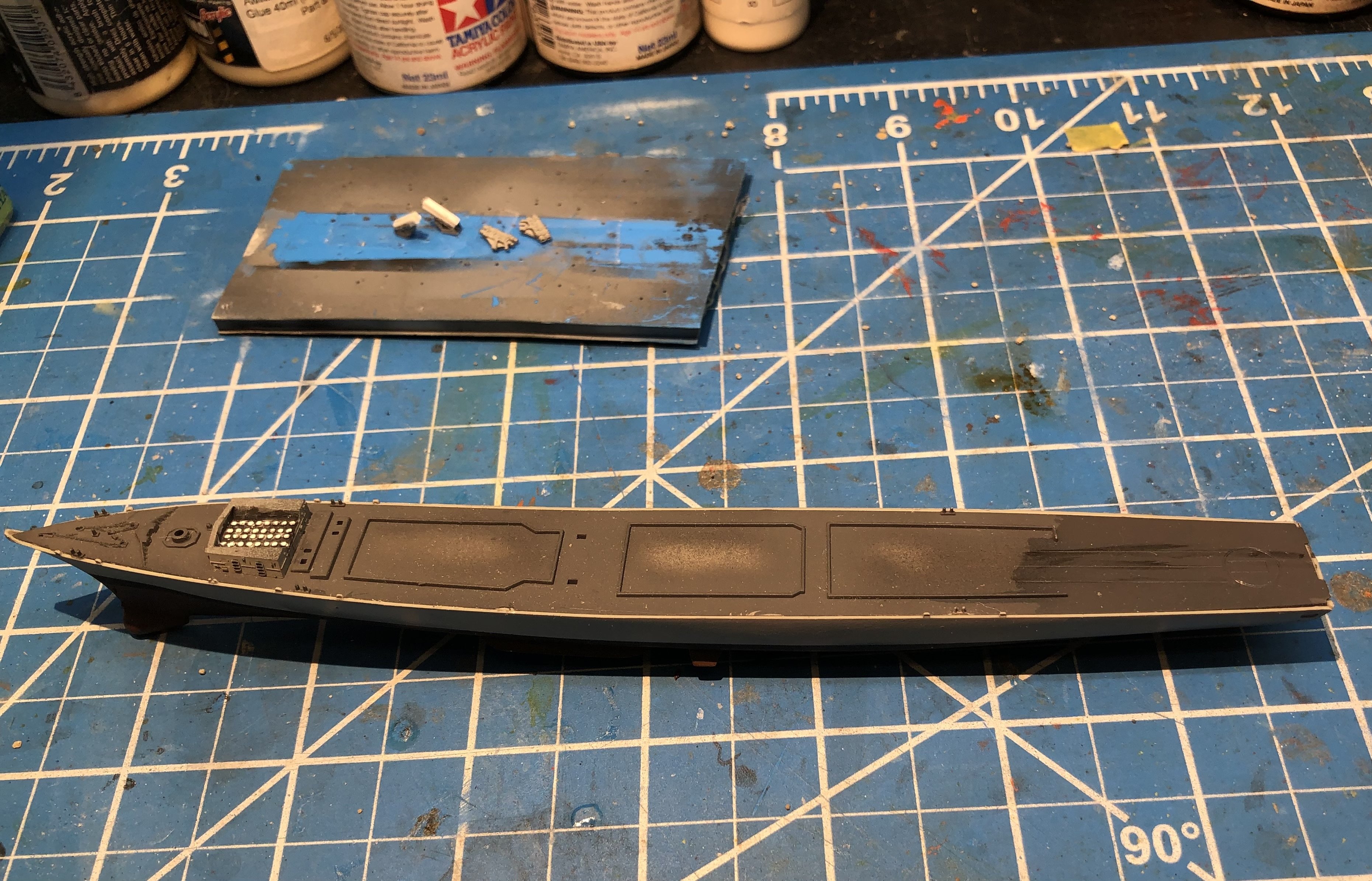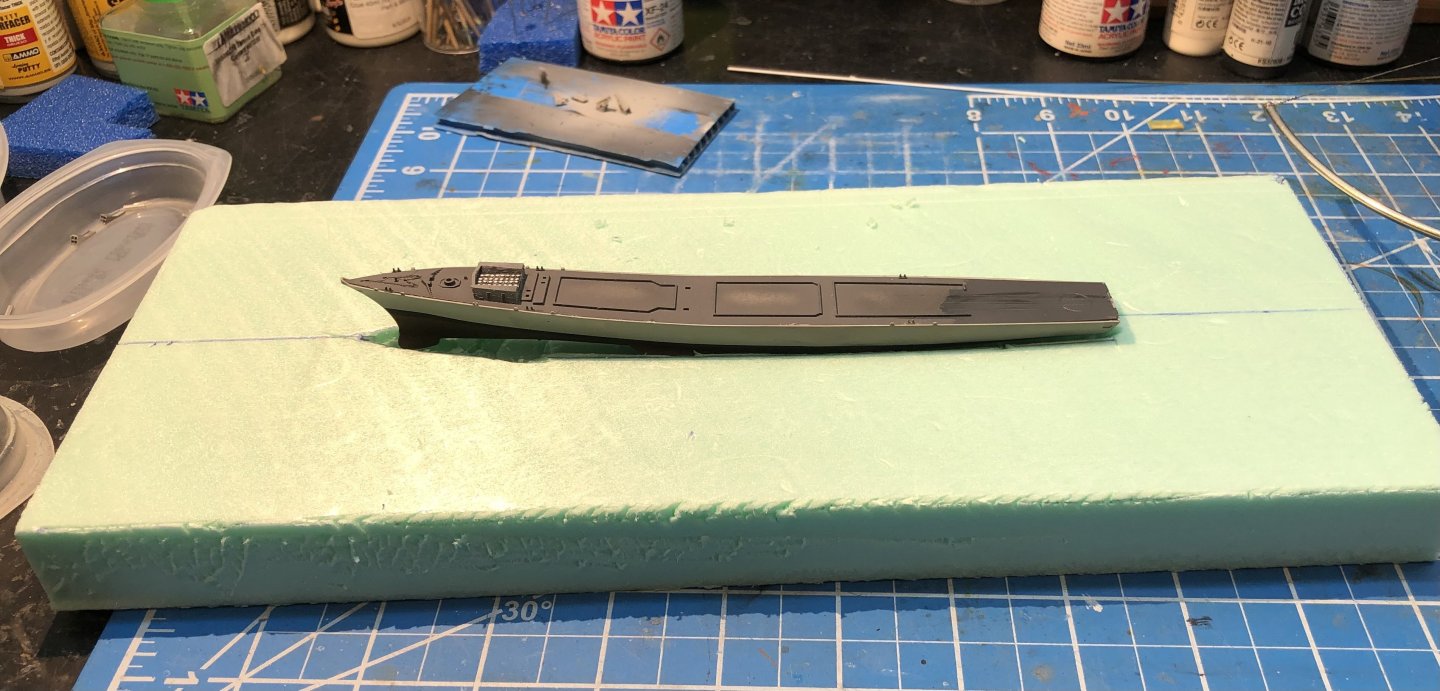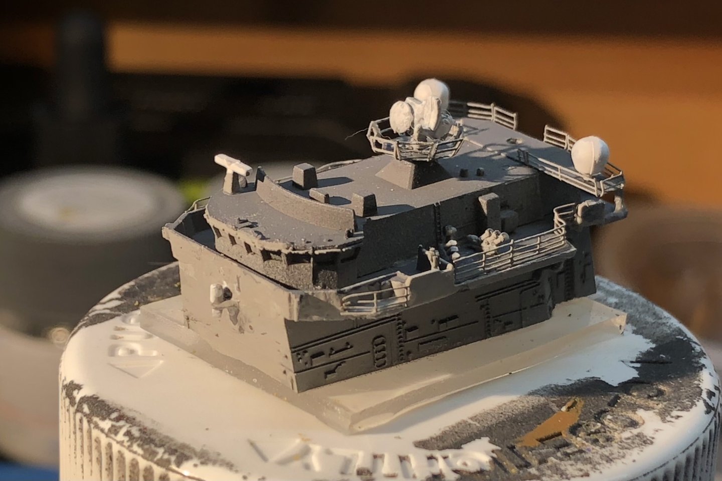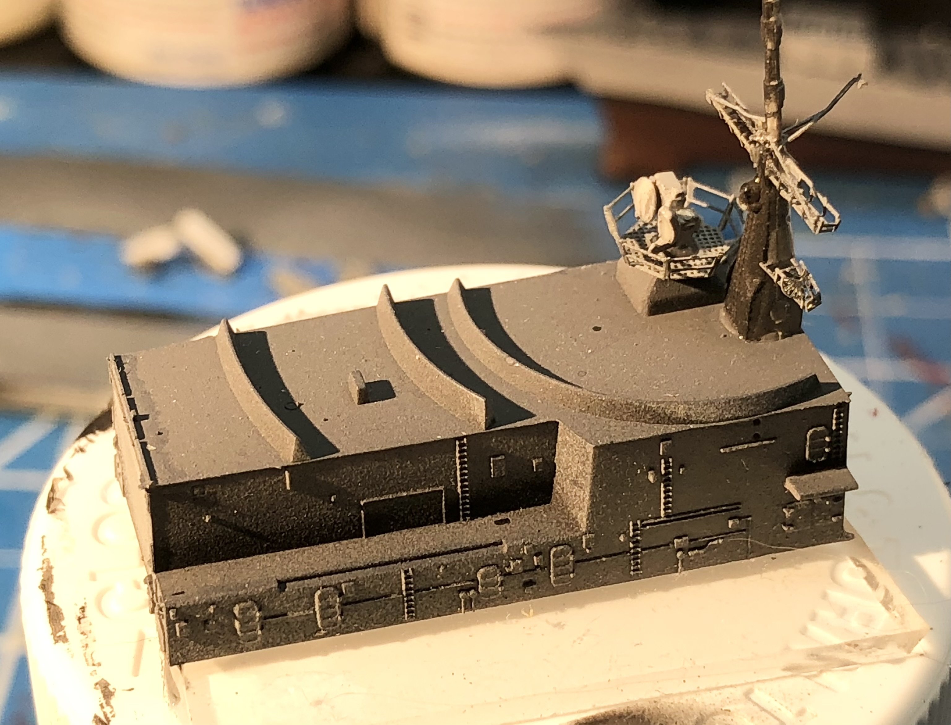 In spite of the lack of updates some work has been done along with some backwards steps. I’ve mostly in tiny PE world but thankfully I think it’s mostly done now. Heres the two frets showing the gaps. Trumpeter on the left. I still need to add the side decks but they will need to wait until the structures are added to the deck. And it suddenly occurred to me that I’m making a diorama around this model and that’s going to involve a lot of trial fitting of the ship into the seascape so I probably shouldn’t wait until Ive got a very fragile model to do that. So I think it’s time to address the seascape which will be light relief from tiny bits. i just finished making up the Harpoon launchers. The plastic kit parts are horrible so I used the WE PE frames and pieces of .020 diameter plastic rod. This was going quite well until I lost one of the PE frames. It’s taken me two days (really) to find it. It had jumped into the spares box somehow but meanwhile the workbench area is now the cleanest part of the house! plastic kit parts are shown to the right of the WE launchers. bridge structure is complete apart from adding the foremast which will wait until the bridge is secured to the deck. midship structure is also complete The hanger needs a few very small PE bits adding but the mainmast is thankfully complete. yardarms on both masts are a disaster waiting to happen. Every move I make seems to end up with me knocking one of them off. Luckily they are still the proper shape. it’s felt like I was making no progress but I think it’s going to move a bit faster now. Thanks for looking in, for the likes and for all the supportive comments. Alan