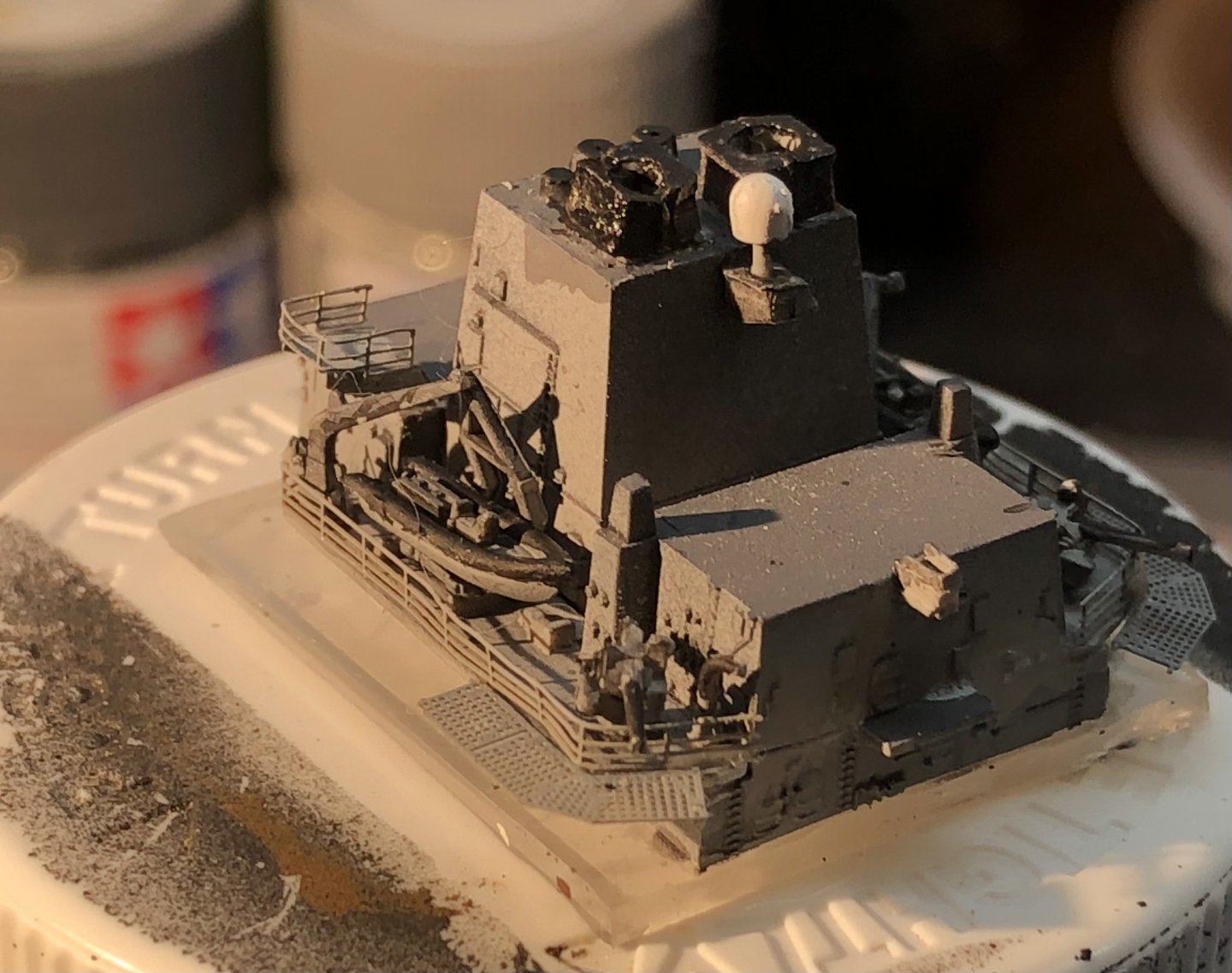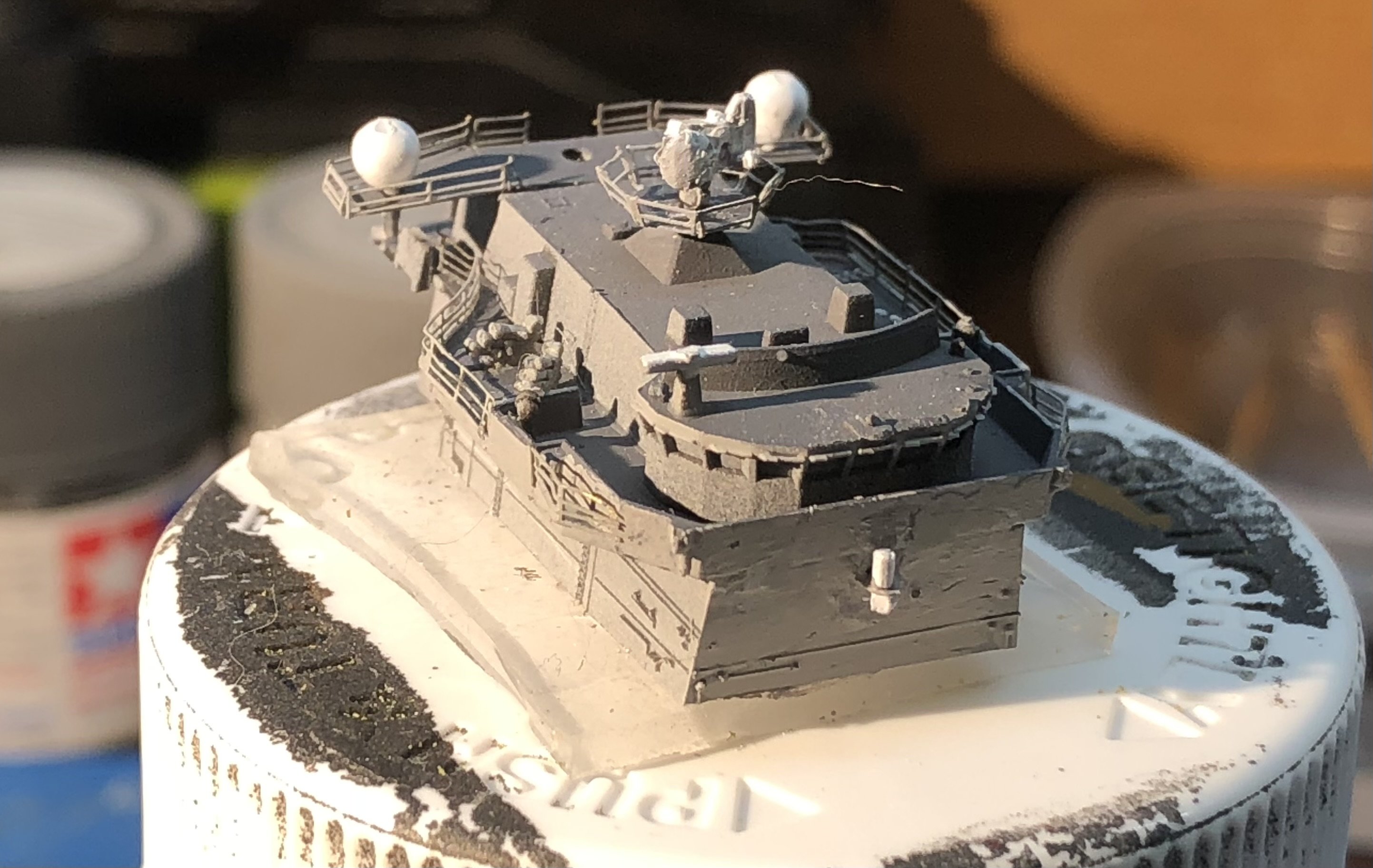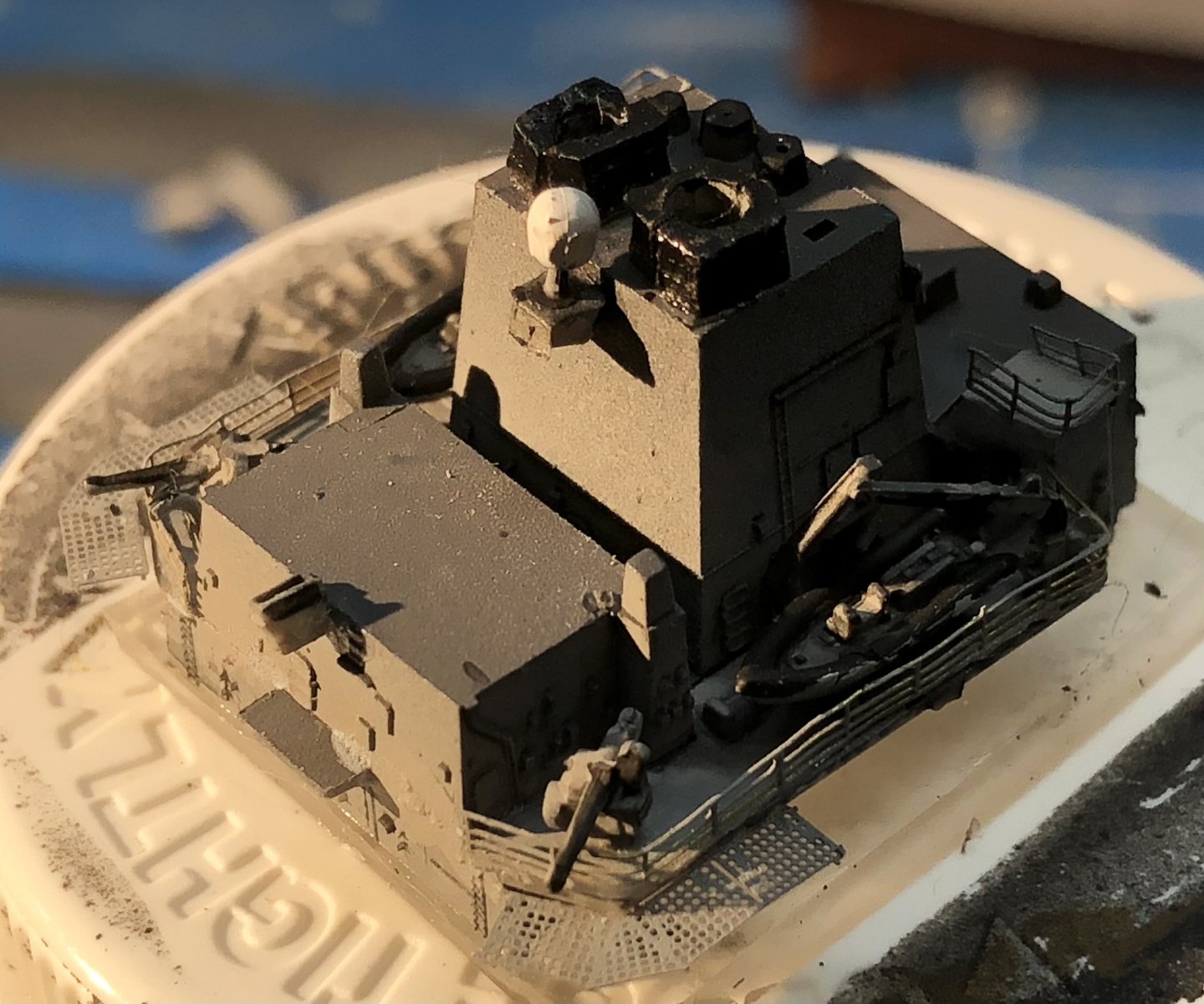 I’ve decided to move the WE PE over to the new kit and build that as a completely separate project. I only used one piece of the WE PE and it’s duplicated in the Trumpeter PE so nothing lost. In the spirit of inquiry after looking at online photos of Monmouth I had a go at making the last missing piece, the radar unit on the front of the bridge. A bit of PE fret and a bit of Flyhawk sprue and I actually think it looks better than the kit part. So I might just be building two Monmouths The picture quality is abysmal but you get the idea. I’ll see how it looks with a bit of paint. Thanks for looking in, the likes and comments. alan