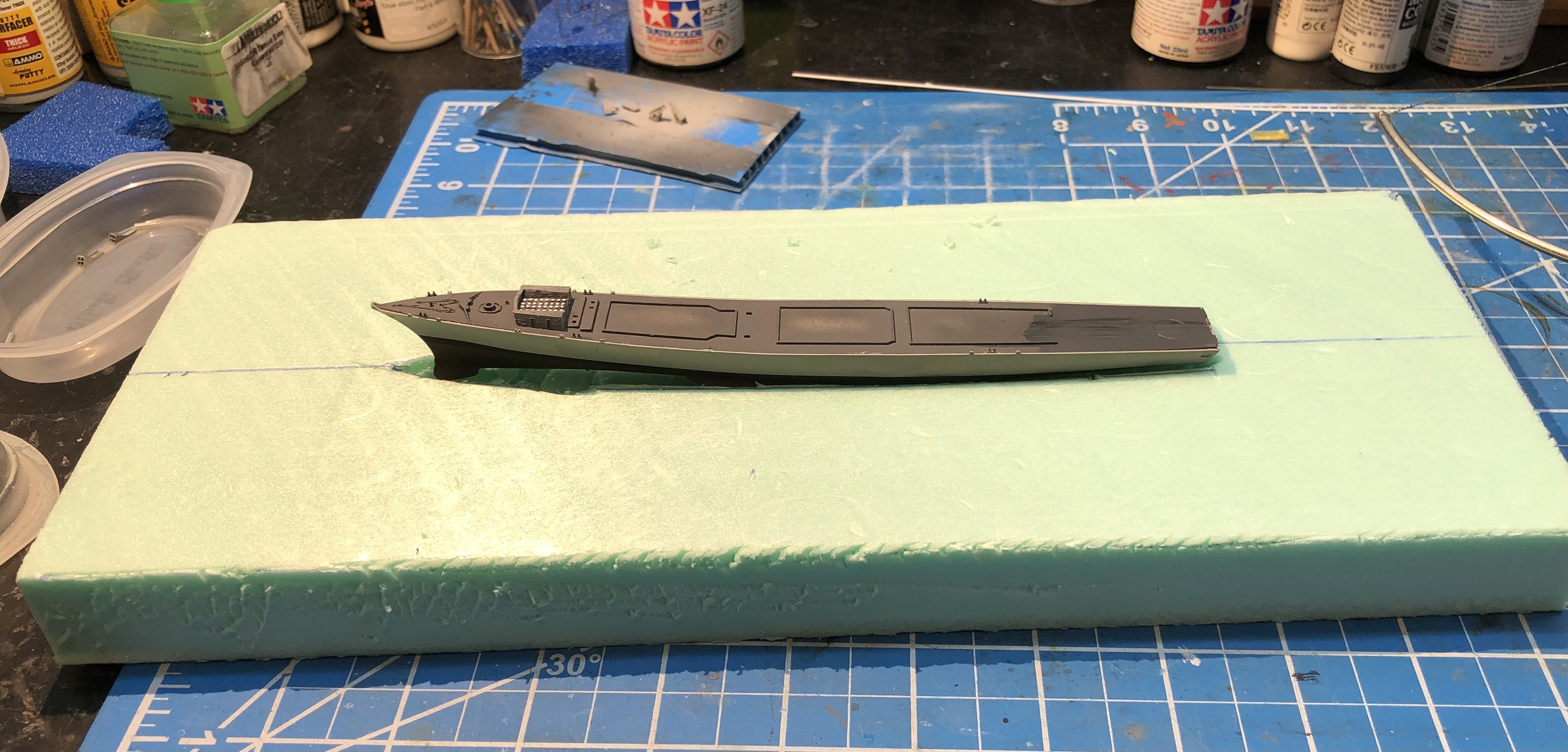 Hi Mike, thanks for the information, very helpful. As you can see I’ve been using old pill containers for holding hulls and assemblies. The child proof top means you can rotate the model without any risk of unscrewing the lid which I find useful when painting the miniatures. I usually fill them about three quarters full of water which helps with stability. I’ll look at the Dspiae vices, that may be a better solution. The idea of tracing the hull outline to use as a template for the seascape is a good idea, I’ll give it a go. I need to start some serious planning for the seascape. Thanks again alan