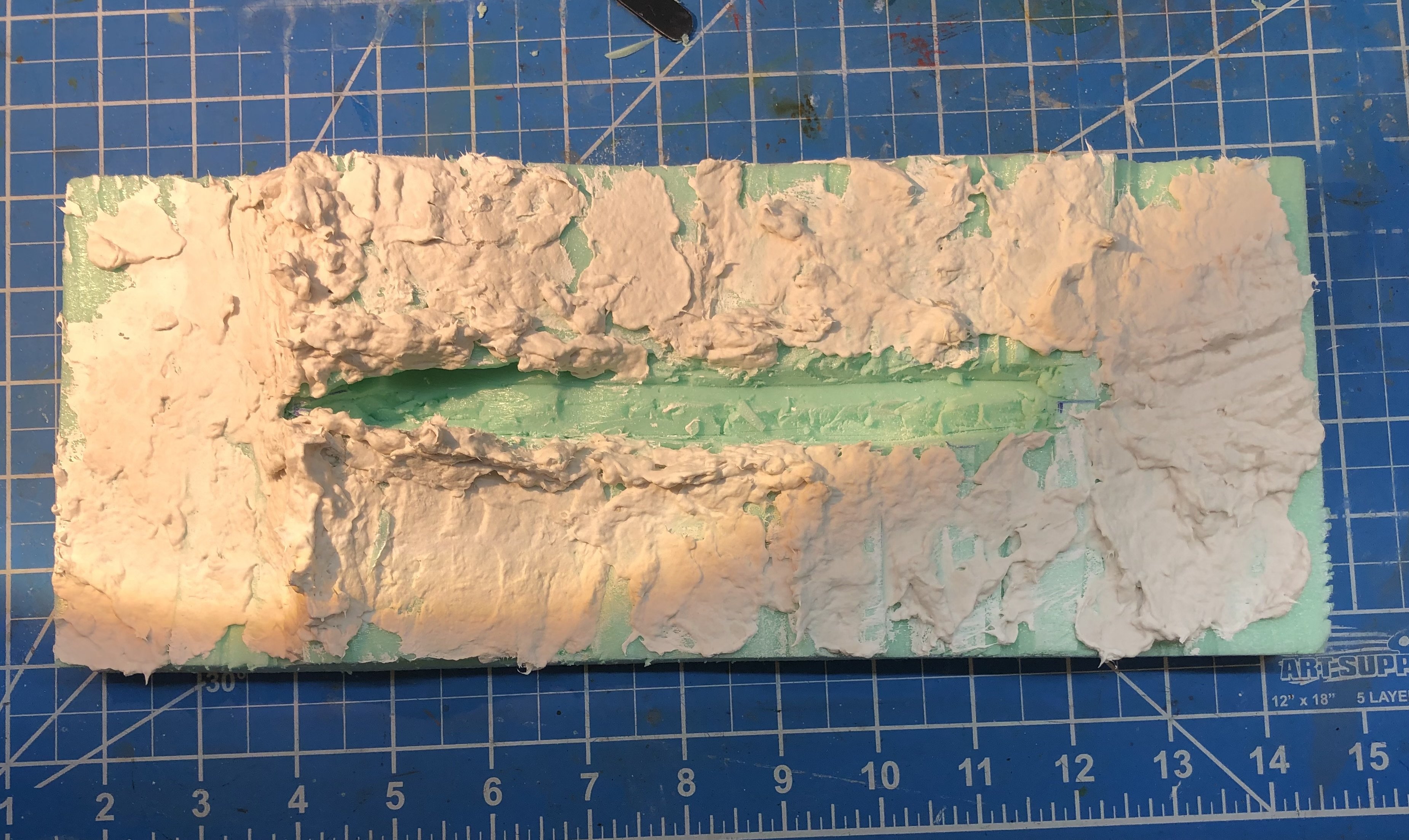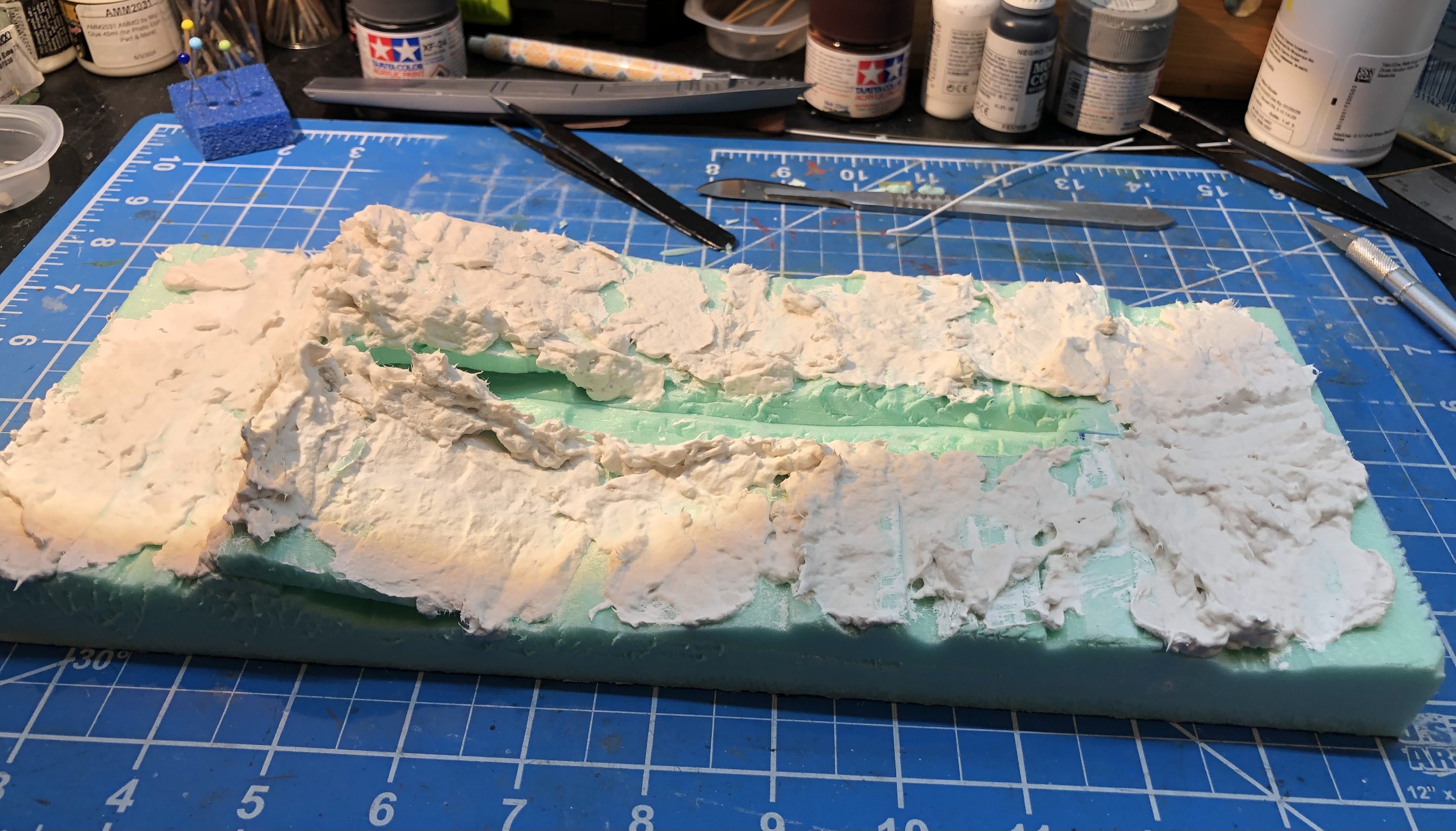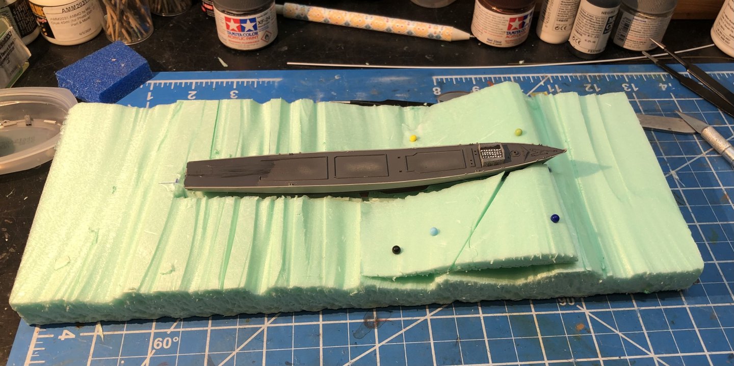 I don’t think I can progress Monmouth any further until I have the seascape ready to take the ship. So, onto the seascape! I’m using my usual one inch thick extruded polystyrene sheet, bought in a twenty four inch square and now cut to five by twelve inches. I find this material much easier to cut and shape compared with expanded polystyrene. I used a scalpel to cut out the outline of the hull. Then I used a hot wire cutter to carve the rough wave shapes I want. According to my ancient copy of Allard Coles “ Heavy Weather Sailing” a seventy mph wind on open seas can be expected to generate waves of around 65 feet. So at 1/700 anything around an inch would be acceptable. The dressmakers pins are holding pieces together while the glue dries. Then Sculptamold was added to break up the flat and smooth surfaces and to further define the waves. Once this has dried I will add torn up paper towels soaked in diluted white glue to refine the surface and build small waves. As always this is very experimental and may evolve in unplanned ways. Thanks for looking in, the likes and comments. alan
