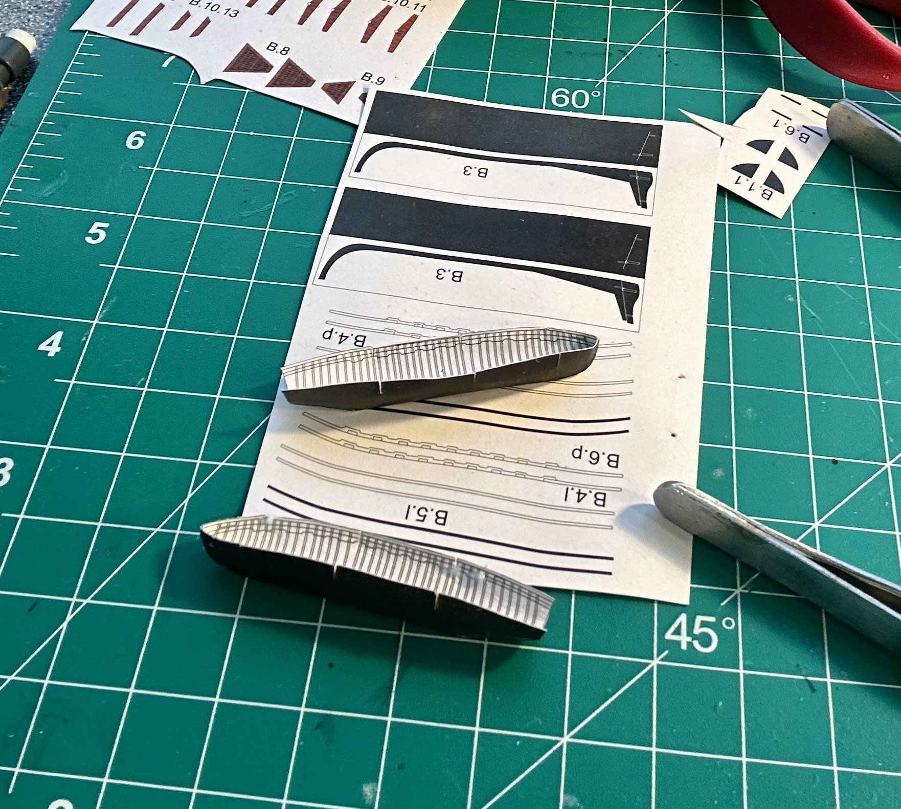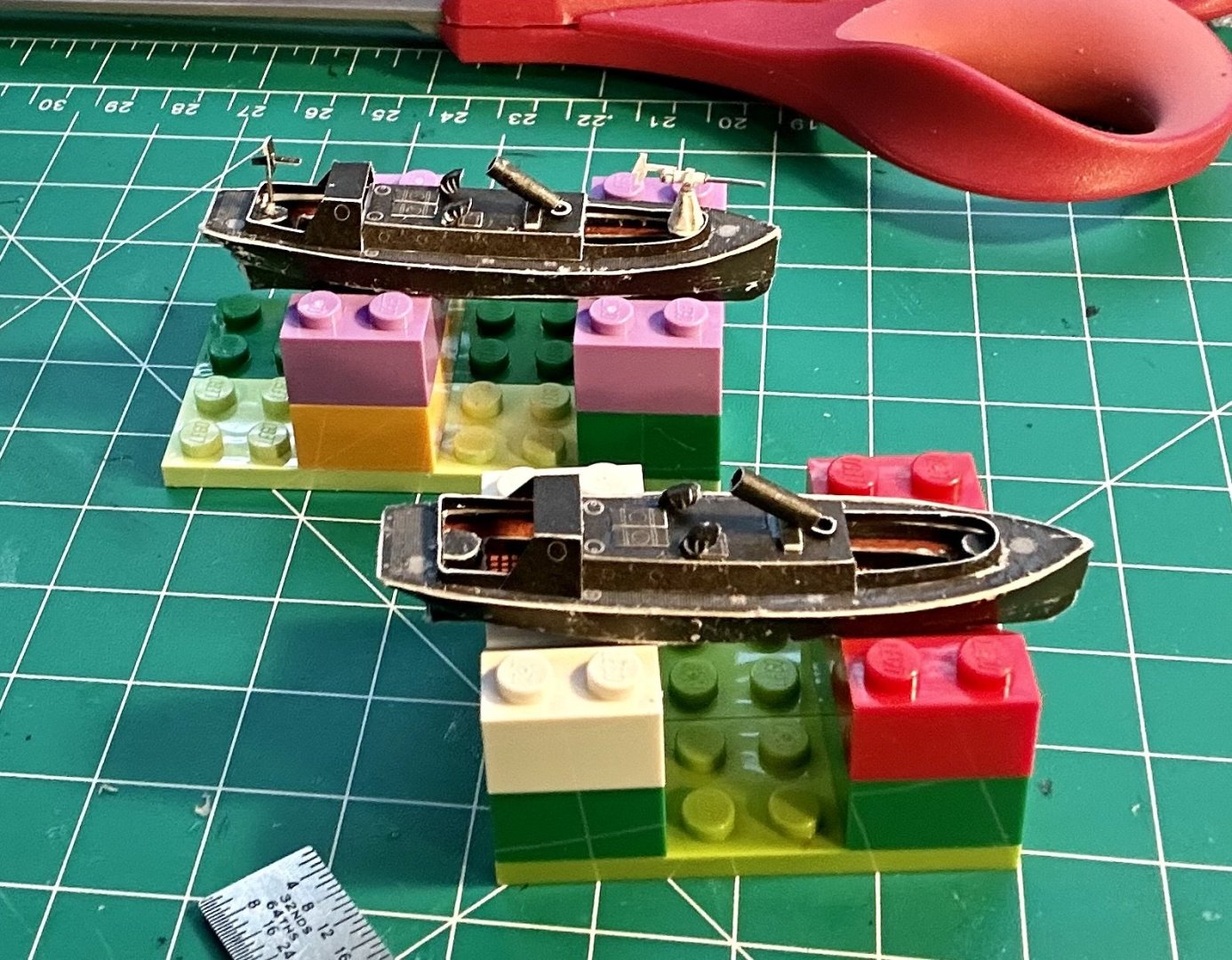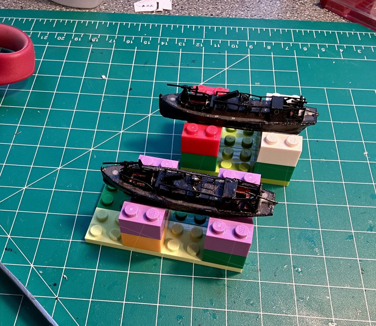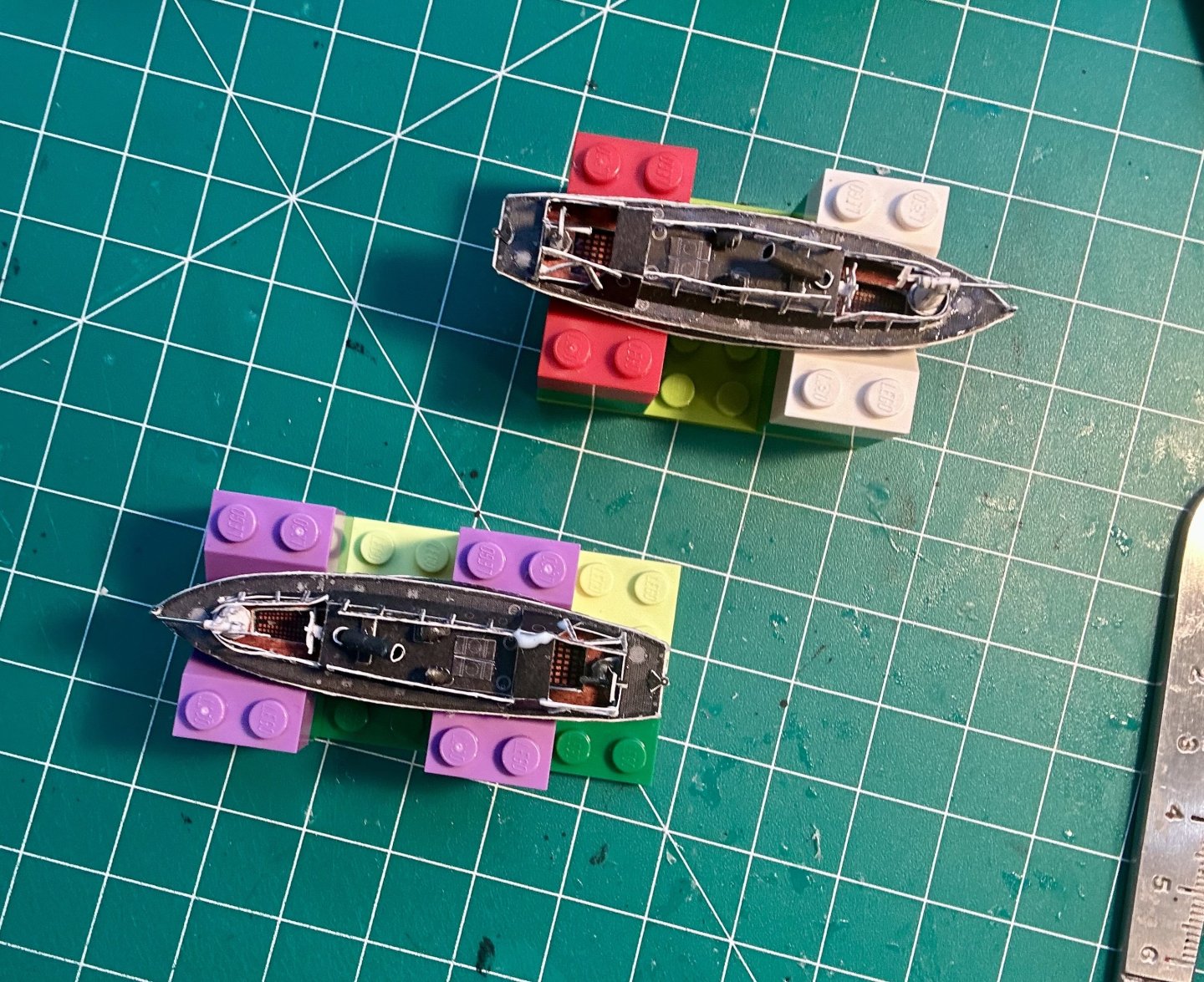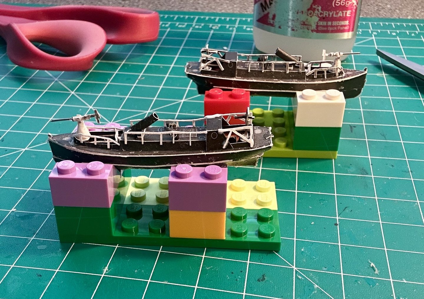Making good progress on the 40’ mine launches: It didn’t come with the keels/rudder assemblies, so I just made my own: I still need to make the bilge keels and a bunch of railings. Maybe I’ll make a couple of quick three bladed props while I’m at it.