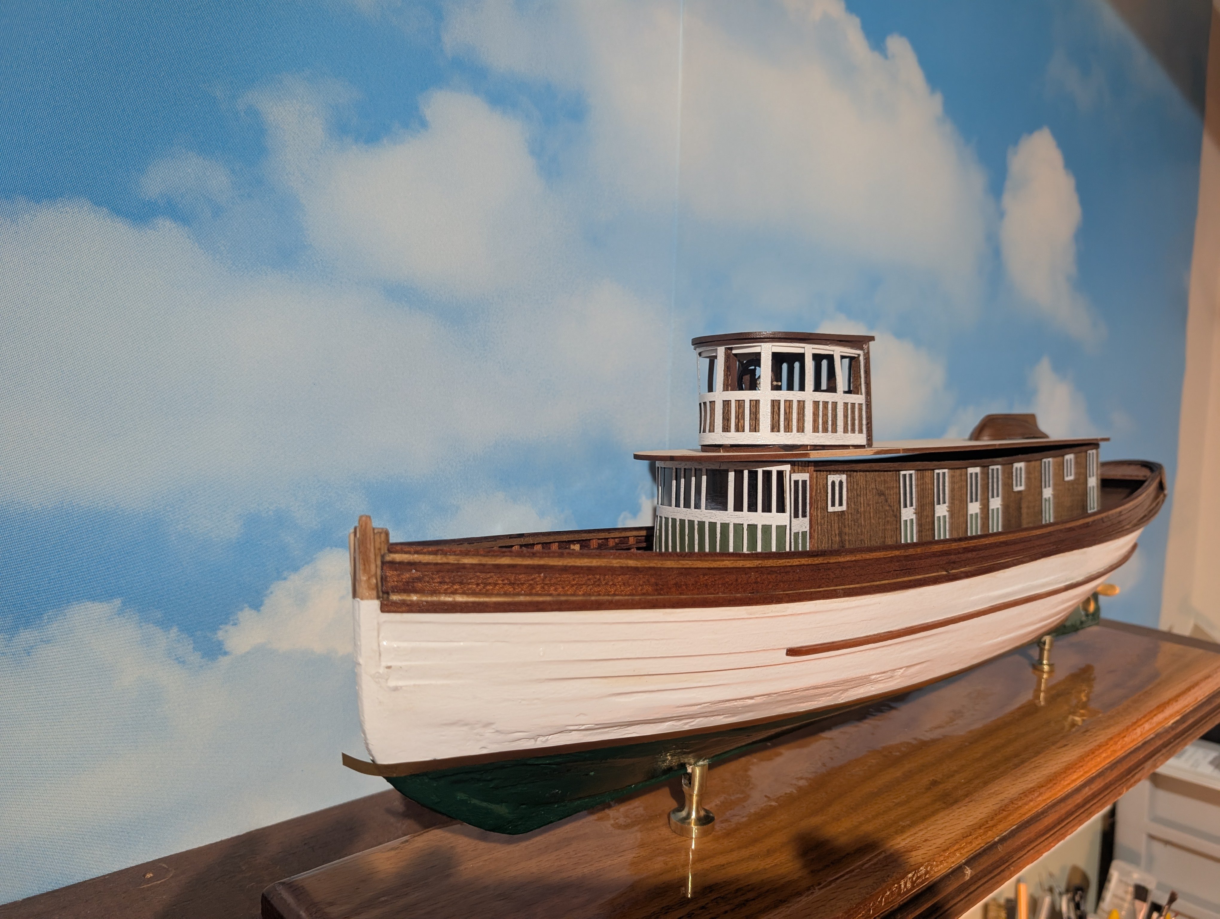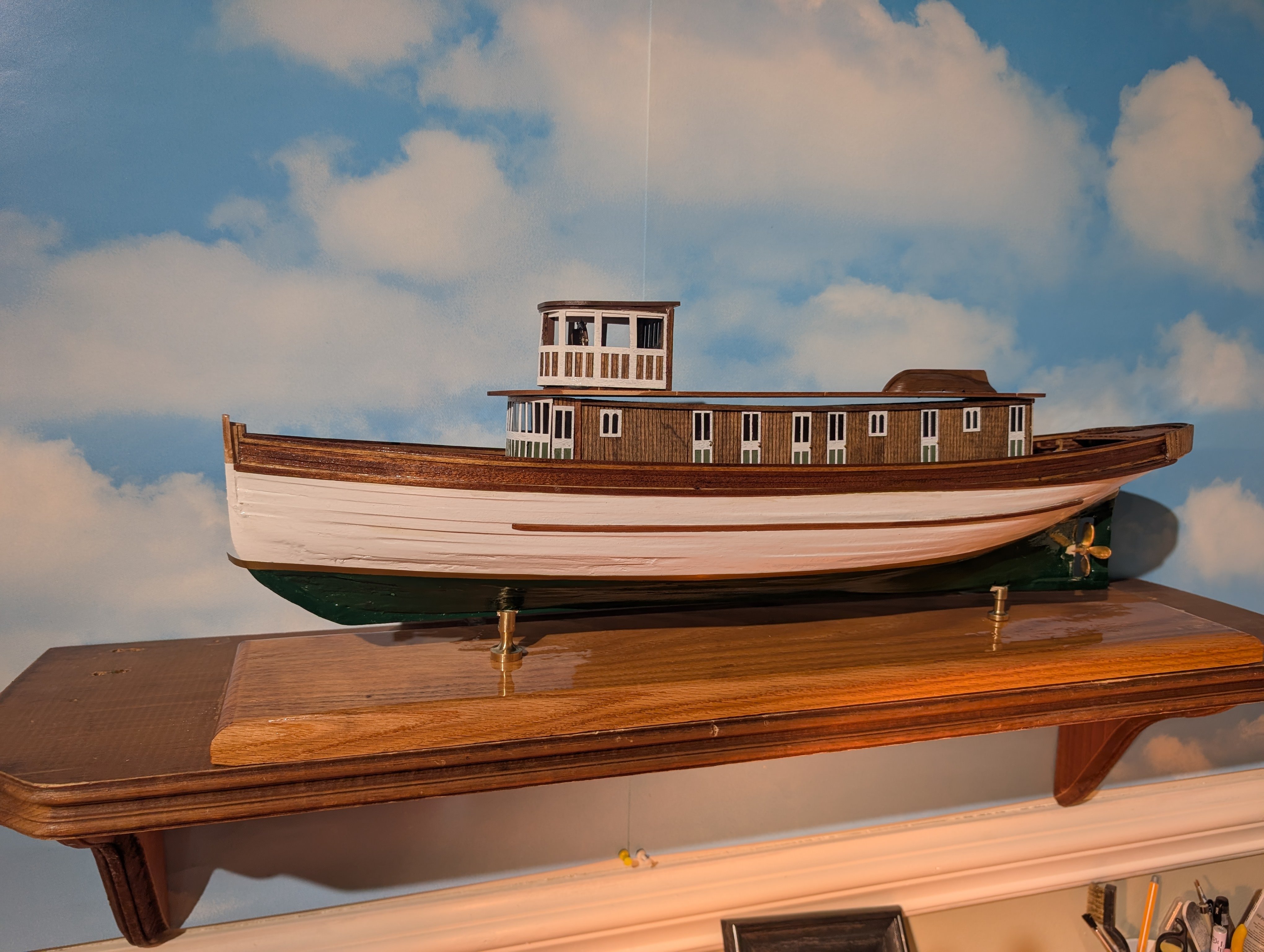 Here's a few more pics of the Seguin. While waiting for parts I mounted it on the oak base I made. The front pedestal is a little taller than the one in the back. I did it that way because the sheer makes it look like the stern is either to high or the bow to low if you use the same size pedestals. I added a length of Pactra gold trim tape at the waterline. Little brass pins worked for door knobs. Stay warm. Phil (In freezing cold NC)