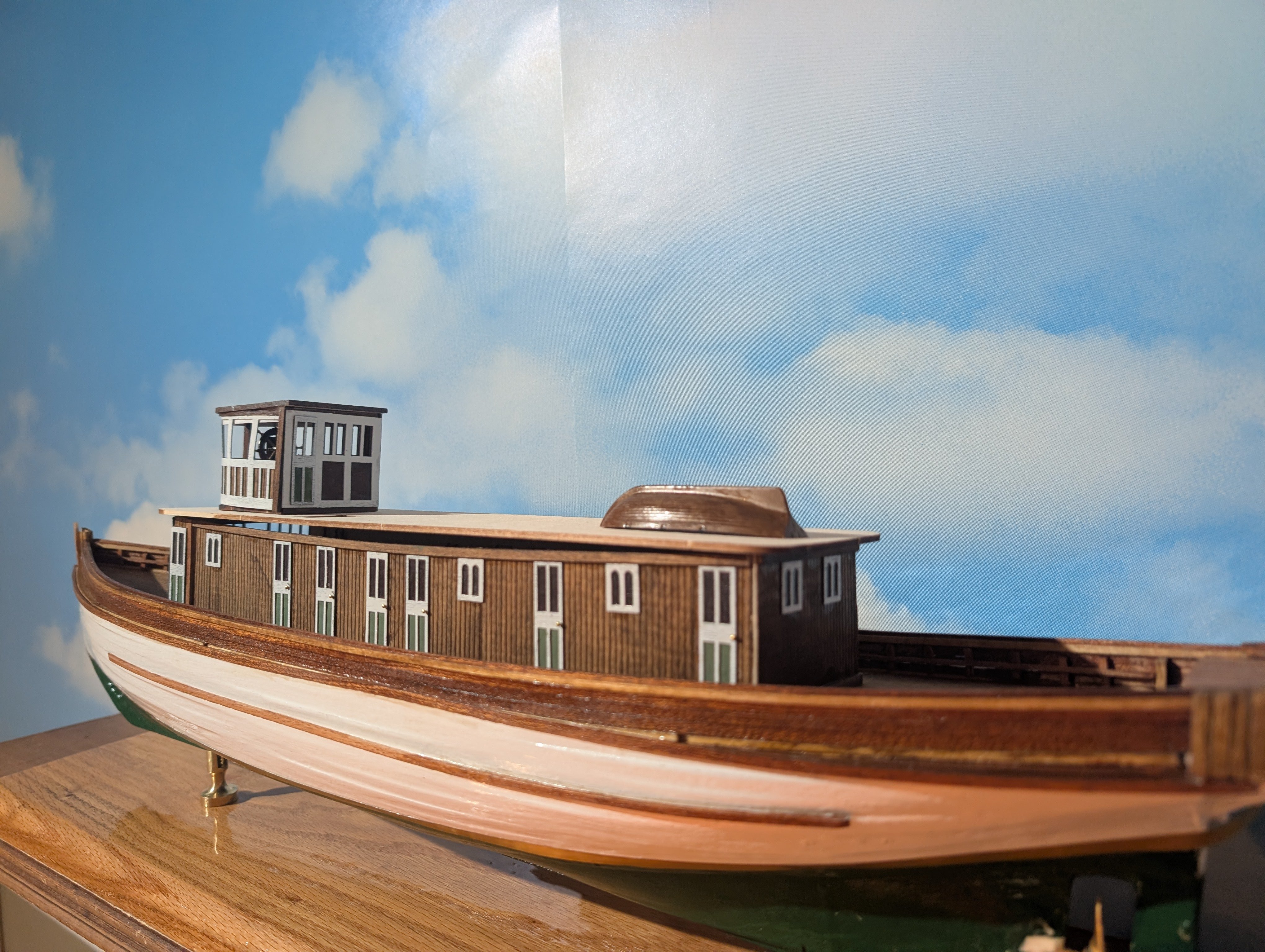 As a scratch builder/kit basher ( which is code for can not follow directions) I have taken a few liberties with the Seguin build. Installing the siding horizontally around the windows and doors on the deck house was more effort than I was willing to put in to it. Not only that, I knew the results would be dubious at best. So instead i installed the siding vertically, covering the laser cut window openings. I glued black paper to the backside of the doors and windows. When I needed a window or door I just cut them off the paper and glued them to the bulkhead. I know its probably not historically accurate, but at least it got done. (Thanks to John with his helpful editing instructions) Phil