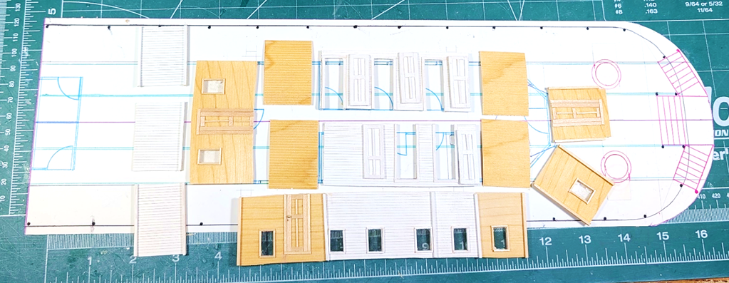 I have been working on the walls for the staterooms, saloons, &c. This is what the walls look like for the boat interior. And the reverse side for the exterior. I continue to use mica to simulate the glass in the windows. This really works well compared to the clear plastic that I used in Thistle. Again, thanks for the suggestion. I need to create the furnishings before I can assemble the superstructure. I will use a modified description of what was used on the sister boats, Leander Choate (II) and Paul L. This means a women’s saloon, a men’s smoker (these were both 15 by 15 feet), a galley/kitchen, three staterooms for the Captain, Cook and Engineer, and lastly a multipurpose office used by the purser, captain and small mail and package storage.