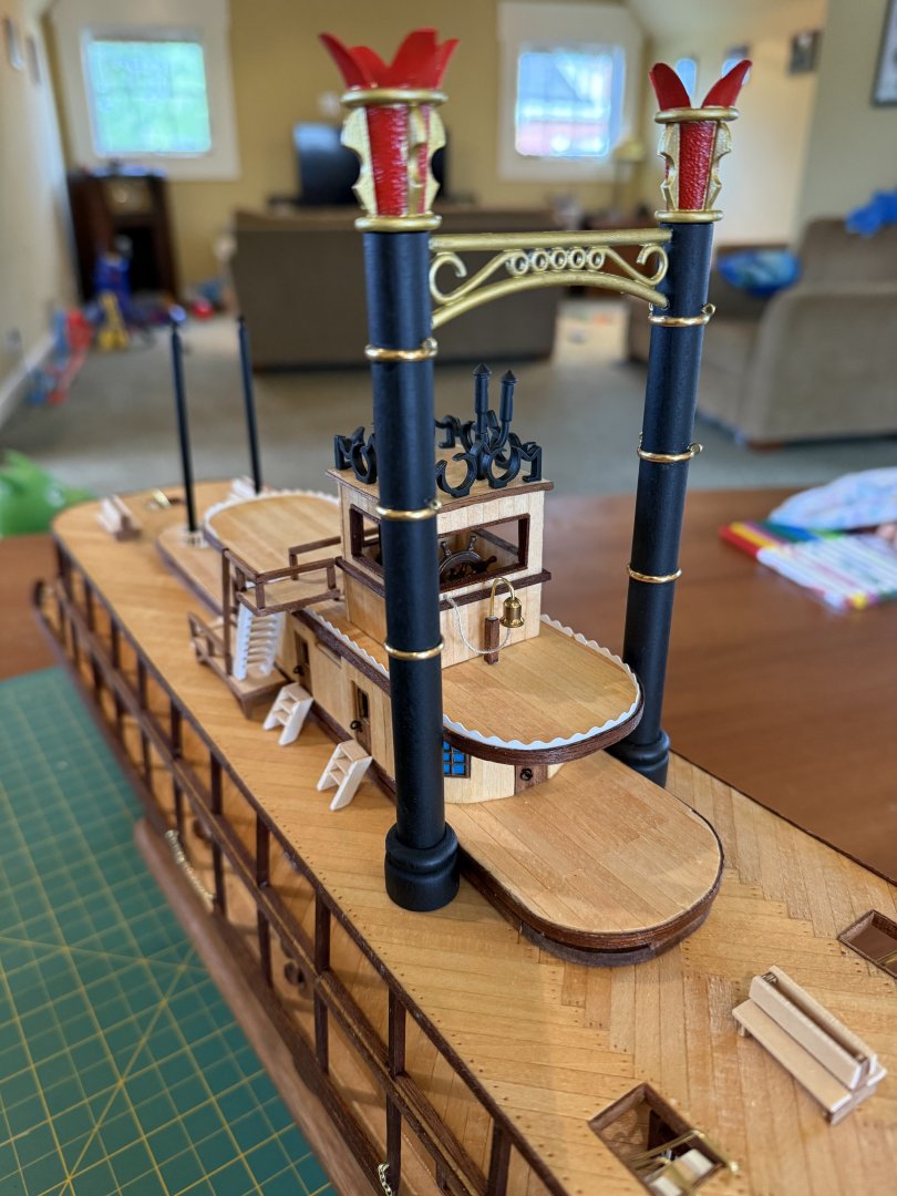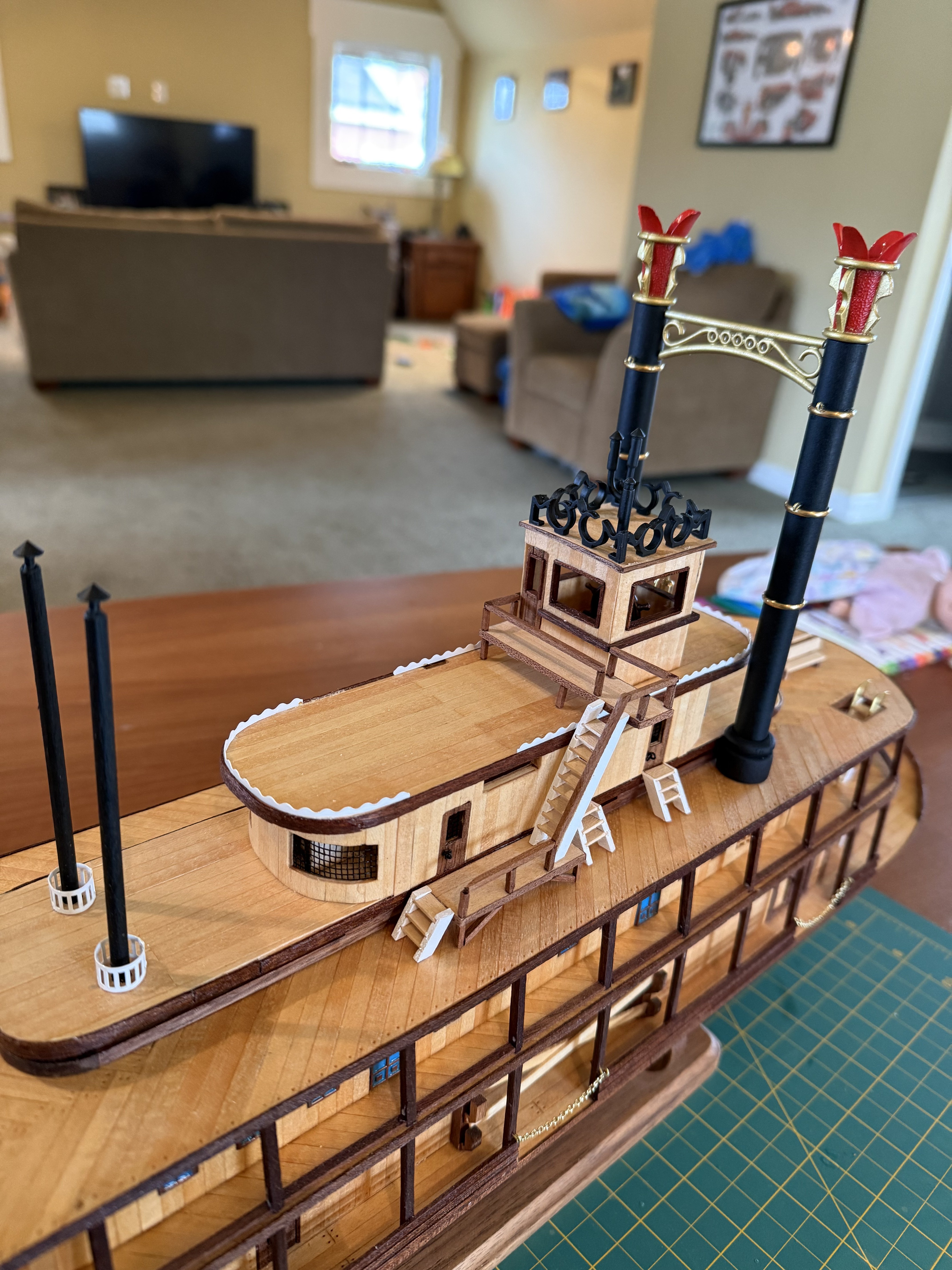 Well this is discouraging, the first major hiccup I have had with any of my builds this far. I just finished getting the smoke stacks all finished, I put them in place and not only is the supporting hole beneath the top deck off alignment by about 3-4mm (causing a fairly large forward tilt) but the small piece of wood that goes around the dowel at the base of the deck also hits the deck. An easy fix will be to not use the supporting holes and file a flat spot on the bases so there is room for a deck. I have not gone back to other build logs to see if this is a known problem but I have triple checked my assembly and everything seems to be correct.