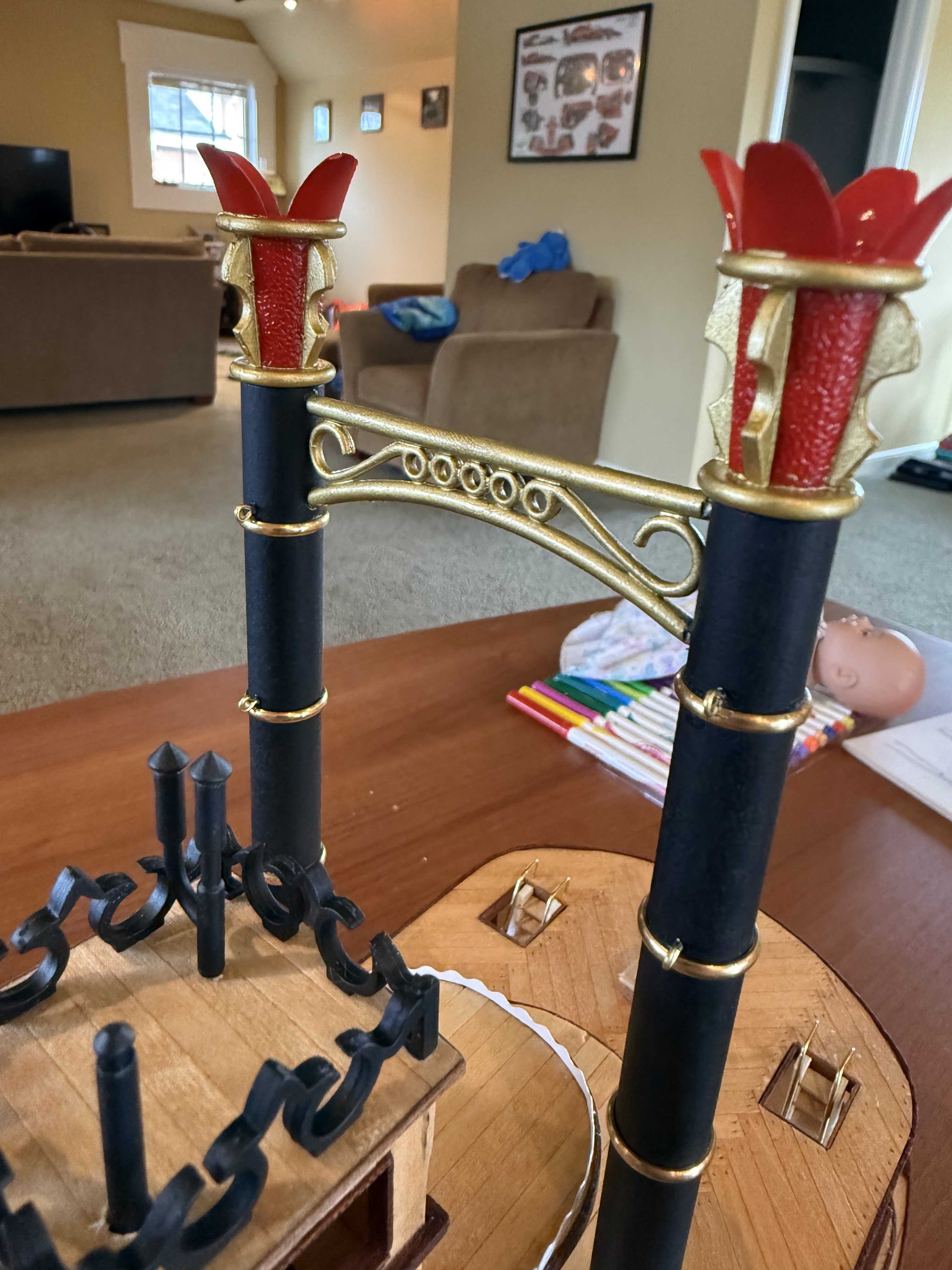 Finally glued the second level deck on and started working on the support beams. The instructions say 42mm height but mine varies from 42 to ~44mm. The directions were not clear on how to start for placement, so I looked at the blueprints supplied. They are all spaced 35mm apart and this is also the width of the double doors located on the first level. The prints show there are no posts blocking these doors, so that’s where I started. Making 2 35mm space blocks to use as I place each one. they are currently just sitting with a tiny dab of glue. Once I dry fit them all I will remove them, cost with tung oil, and glue permanently.