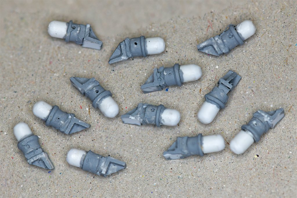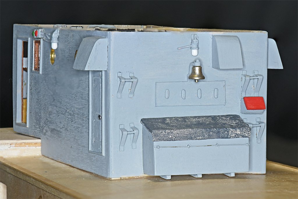Still working on the small details for the O1 deck house. The bell bracket was made from 0.030 inch (8 mm) brass. The bell is from Bluejacket Ship Crafters (1/4 inch, part F0483). I have made bells from scratch, but it was much easier to order the bell while I was also ordering the propeller. The parts on the right are brackets to belay signal halliards. Here are a couple of photos of the signal bridge. the flag bag (flag locker) has a "canvas" cover. It was made from some of the scrap silkspan I had left over from the topsail schooner build. It was painted off-white for the schooner sails so I brushed on some Tamiya "German Grey" (XF-63). This is what I will use for the O1 and O2 level decks. A board with cleats for securing halliards is above the flag bag, with the halliard belays on either side. The thing with the red top is the shore connection box where the ship was "plugged in" to shore power while docked. There are three vent hoods from the fan room at the aft end of the O1 level house.