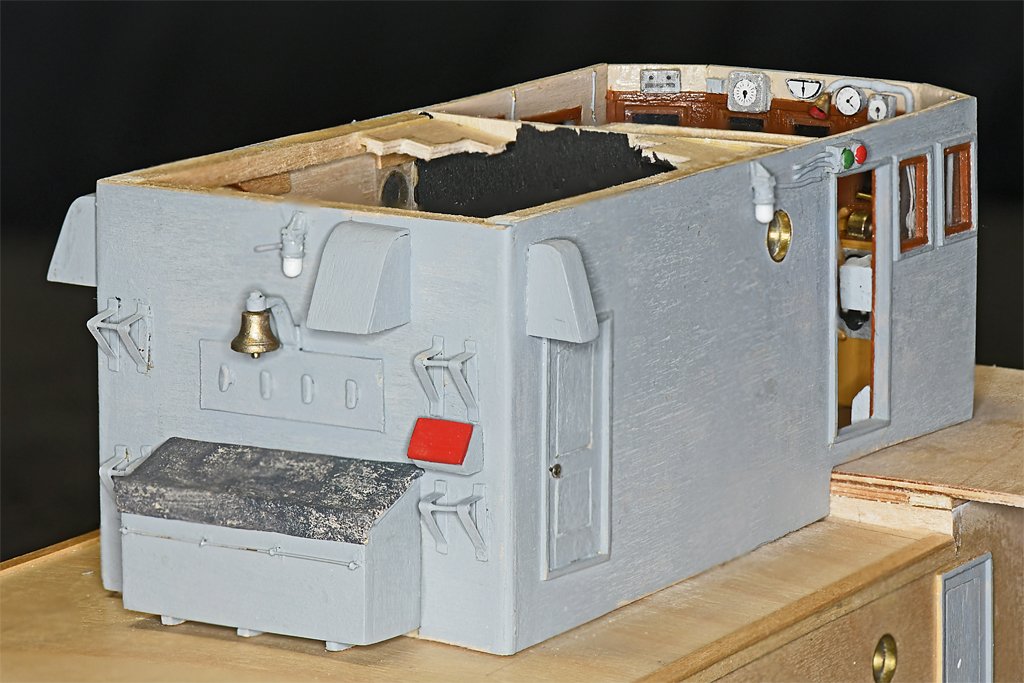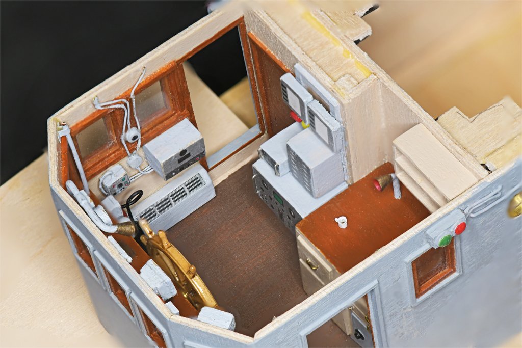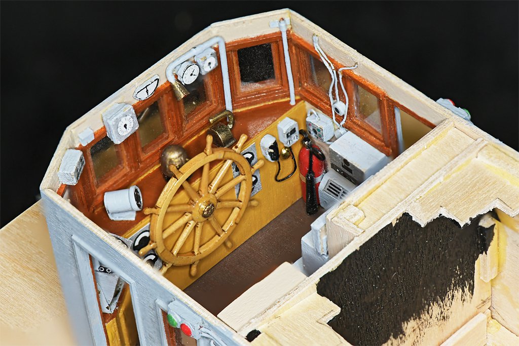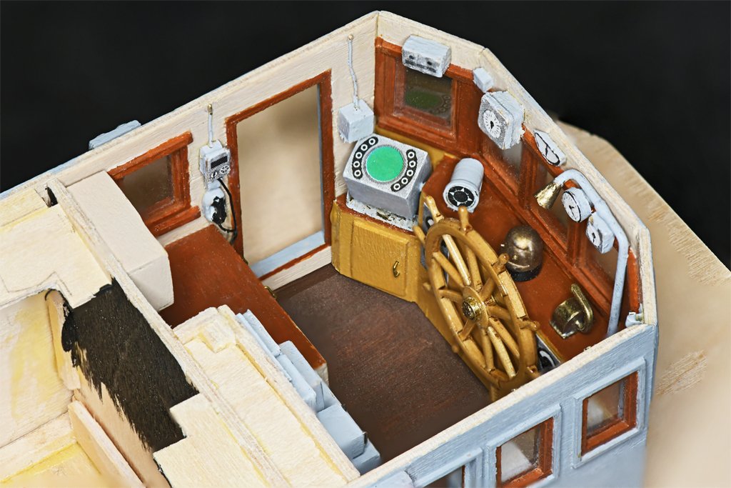 John, The doors on the sides of the pilot house will be open, and the interior will be visible through them. The side windows will offer a bit of a view. But the front windows will be hidden under a canvas cover over the open bridge. I suppose if you use a dental mirror or fiber optic camera you could see most of the detail.