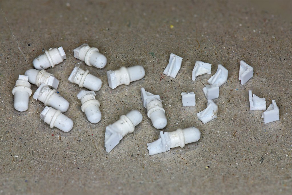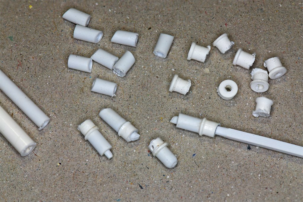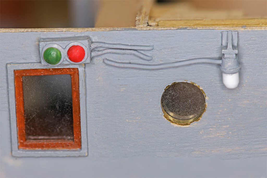 Here are a few more small details. The ship had several lights on the external bulkheads to illuminate the decks at night. I had the approximate dimensions and a 3D CAD file from the Okieboat CAD model. All I needed to do was make them in styrene. I used two sizes of styrene tubing - 0.100 and 0.125 inch (2.5 and 3.2 mm) diameter (left). I chose tubes instead of rods because they would fit concentric around a center rod and I wouldn't have to machine all of the dimensions. The base was turned and shaped with files to get the rim around the light. I didn't have the appropriate size rod so I rounded a piece of 0.0625 inch (1.7 mm) square styrene for the tubing to fit onto. After the glue set the end of the "bulb" was rounded with files and a 0.022 inch (0.6 mm) hole was drilled through the lamp base for the wiring. The next step was to cut pieces of a 0.100 inch (2.5 mm) angle for the mounting bracket (right). A bit of 0.015 inch (0.4 mm) styrene was shaped and glued into the angle. A small piece of 0.030 x 0.060 inch (0.8 x 1.5 mm) styrene was glued to the top of the lamp assembly, and the mounting bracket was glued onto this. The pieces were painted and this finished the lamp assemblies. I know I will need six or seven of these but I made a dozen. I will choose the best for the model. The photo on the right shows a lamp mounted on the port bulkhead of the O1 deck house behind the pilot house. A two colored Polarity Light is mounted above the window over the chart desk. The wiring for the lights is 0.020 inch (0.5 mm) copper wire. Ideally there would be a short "stuffing tube" around the wires where they enter the light housings, and another where the wires penetrate the bulkheads, but I couldn't figure a way to make these repeatably at this scale. The deck house sides have been painted with an acrylic base sealer, two coats of grey acrylic paint, and sanded. I will add another coat of paint, sand again, and finish with a clear satin acrylic varnish. Here are a few more photos of the pilot house after the front bulkhead was attached. The compartment was 9 feet (3 meters) wide with just enough room for the helmsman at the wheel and the navigator at the chart desk and radar. I am adding details to the exterior of the O1 level deckhouse and am about ready to put the O2 level deck over the house. This will also involve making the footing and attachments for the mast. There are actually relatively few wiring details on the exterior of this ship. It has wooden bulkheads that were framed much like ordinary house construction, and most of the wiring was placed inside the walls. This is in contrast to metal ships with thin (3/8 inch or 10 mm) steel plate bulkheads where much of the wiring is routed externally. There were railings around the O2 level on top of the deck house, and a few assorted odds and ends on the O2 level.