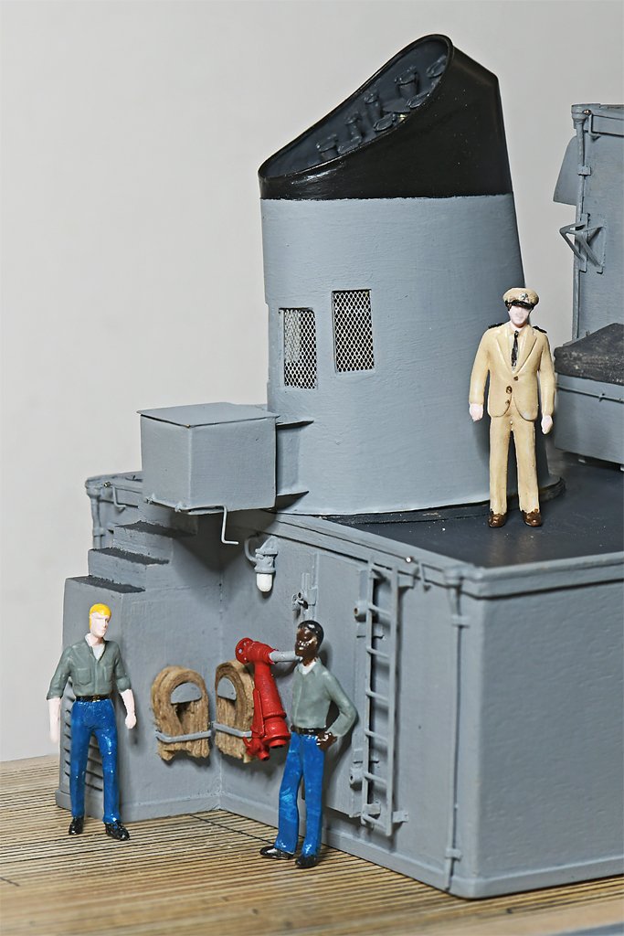 The smoke stack is finished (except for the antenna). I painted the brass with a thin coat of FolkArt all-purpose satin finish sealer. This is what I have been using to seal the wooden surfaces before painting. The instructions on the bottle say it can be used on a "non-porous surface to add slight texture for increased paint adhesion." It is a water-based clear acrylic paint. After the sealer had dried about 40 hours (delayed due to Christmas events) I painted the black top. After that dried overnight I applied masking tape over the black and painted the grey. The paint flowed on smoothly and adhered to the sealer nicely. Neither the paint nor sealer lifted off the brass when the masking tape was removed. Here is a picture of the fire station at the aft end of the main deckhouse. The life jacket locker hangs directly overhead. It was an open space away from passageways where the life jackets could be dumped. However, it was just relatively open! The two sailors are standing on a "portable" (removable) deck section that is directly over the four GMC 6-71 main propulsion diesels. An inclined ladder will lead down to the main deck behind the sailor on the left. When I get around to making the minesweeping gear a small winch will be mounted on the portable deck section. The winch is for handling the large float for the acoustic sweep device. Just outboard to starboard of the winch was a davit, and the acoustic sounder mounted outboard of that. The life jackets would dump on top of the winch and the spaces around it. A hand grenade locker was positioned where the Captain (in dress khakis) is standing. One of the life rafts will be positioned at the aft starboard corner of the deck house. Forward of that was a pyrotechnic locker. There was a narrow walkway between the lockers and life raft leading to the top of the vertical ladder. There really wasn't a lot of bare deck space anywhere on the ship.