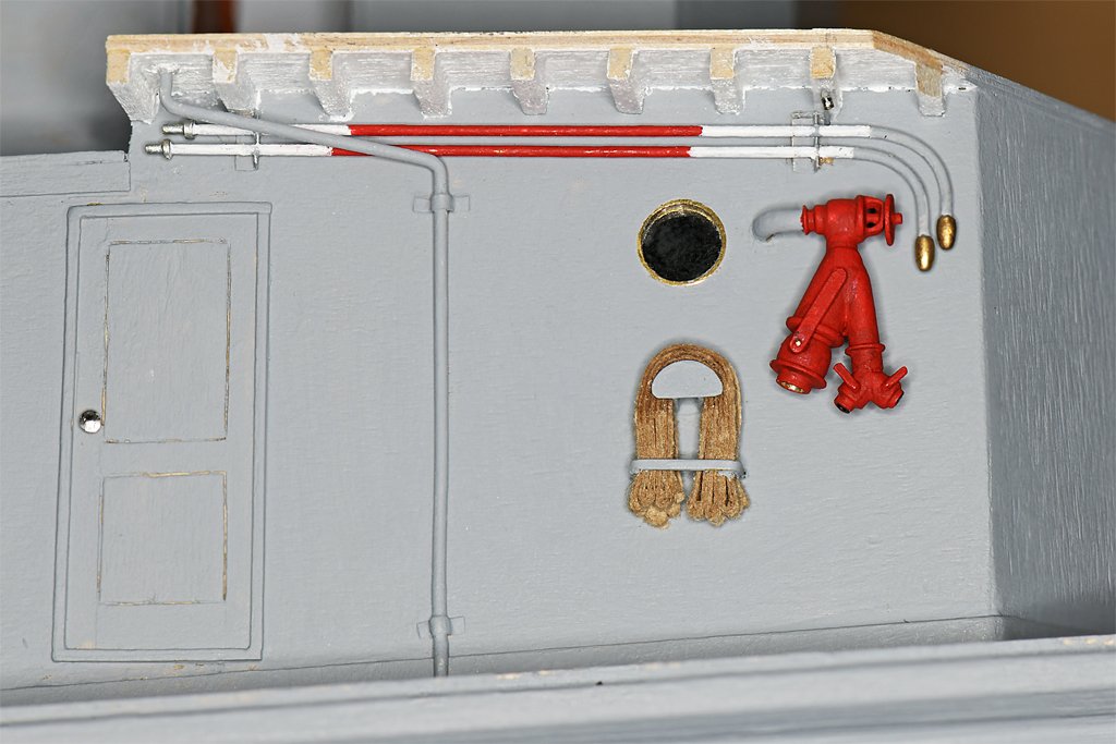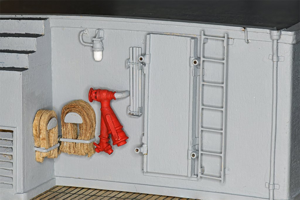 John, It was easy to get the hoses off and on the racks. Because the hose isn't looped around the rack, but is just draped over it, all you needed to do was pull on the hose and it slipped right off the rack without getting tangled. Putting it back on the rack took a bit longer. The "U" shaped bracket that holds the hose below the rack was actually a three piece thing with a hinged bar over the hose and a locking pin on one end. Just pull the pin, swing the bar back out of the way and pull on the hose. The 1:48 scale model bar is 0.030 inch (0/8 mm), but the blueprints call for 0.021 inch (0.05 mm or 1" at 1:1 scale). I wasn't about to try making the hinges and locking pin at that scale. I should say it was usually easy to get the hoses ready for action. But in one firefighting school I had the folks running the class had prepared a damage control locker with a collection of parts where no two pieces would fit together! We had all had other fire fighting schools so on our first drill we went at it with confidence until we couldn't get anything to work. Then frustration turned to laughter when we realized this was a lesson telling us that we needed to be sure all our gear was ready to be used before we really needed it!