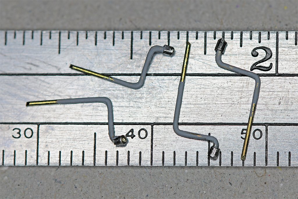 Next up is vertical ladders. I need four for this model. One of the assembled ladders is shown here. It will go on the aft end of the main deckhouse, on the starboard side, from the main deck to the O1 level. Below it are the pieces of a "kit" for a longer ladder that will go on the port side of the O1 level deckhouse from the O1 level to the O2 level on top of the pilot house. The ladder parts were cut from some 0.030 x 0.015 inch (0.76 x 0.38 mm) brass strip made by Special Shapes Company. They made many different small brass shapes, including "U", "H", "L", solid rectangular and round rods. Unfortunately they are no longer in business and I know of no other company that makes these parts. I bought out the stock years ago from a local hardware store that was run out of business by big box hardware stores. I guess there isn't enough profit for the big store paper shufflers to bother stocking these things. The actual cross section dimensions of the side pieces and rungs of vertical ladders in the US Navy were 1 3/4 x 3/4 inch (44 x 19 mm). That would be 0.036 x 0.016 inches (0.9 x 0.4 mm) at 1:48 scale, so the brass strip is just slightly undersize. All of the ladders on the MSIs had rungs spaced 12 inches (305 mm) vertically. This was pretty common in the Navy. However, not all vertical ladders (ladder rungs, steps, etc.) were the spaced the same. When I made the CAD model of CLG-5 the blueprints often showed the spacing of the top rung below the upper deck, and the bottom rung above the lower deck. Then the blueprints said to space N number of rungs equally between the top and bottom rungs. This produced spacings from 11 to 15 inches (279 to 381 mm), although about 13 inches (330 mm) was the most common. The rungs were all 12 inches long (305 mm), although the blueprints show ladders were also built with 18 and 24 inch (457 and 610 mm) widths. I made this jig from scrap wood for assembling the vertical ladders. The 0.094 x 0.030 inch (2.4 x 0.76 mm) side basswood strips are spaced precisely at the outer dimension of the ladder sides 0.28 inches (0.25 + 0.015 + 0.015) or 7.1 mm. At the center are two wooden pieces spaced just over 0.015 inch apart, the narrow width of the ladder rungs. As you can see, the ladder rung is placed in this slot. Holes were cut through the base and wooden side strips to allow a soldering iron tip to contact the brass parts. More basswood pieces were glued to the base spaced exactly 0.25 inch (6.35 mm) from the right hand center piece. Really only three of these spacer pieces are needed to assemble a ladder - the center one and one to either side. But the additional pieces serve to hold the assembly in place and show any spacing errors that might creep in. The gap between these spacer pieces and the outer side pieces is the narrow dimension thickness of the brass strips, 0.015 inch. The brass parts fit tightly between the wooden jig parts. Each ladder rung was soldered on both ends to the side pieces. I placed a small drop of liquid flux in each joint and then touched the tinned tip to the joints briefly. I used a metal tool to hold the rung down until the solder hardened - otherwise it would try to lift out as the soldering iron tip was raised. The photo on the left above shows the correct way to assemble the ladders. First an end rung was soldered between the sides at the proper end position (this varies with each ladder). Then the assembly was lifted and moved so the rung was positioned one step to the right, tightly against the spacer strip. Then the second rung was soldered in place. The assembly was lifted again and moved one place to the right. Another rung was added and so on. It is very important that this sequence is followed to ensure that the spacing of all rungs is equal. Starting at the middle (as shown in the right photo above) or trying to install the end rungs first and fill in the rest later will likely result in uneven spacing. After the ladders were assembled they were cleaned up with files, brushes and sandpaper to remove excess solder. Then the ladder supports were soldered on. These were made from 0.005 inch (0.13 mm) brass strips cut from a large sheet to a scale 3 inch (0.0625 inch or 1.59 mm) width. The faces of the ladders were spaced 6 inches (152 mm) from the bulkhead surfaces. That is 0.125 inch (3.175 mm) at 1:48 scale. The long legs of the supports are 0.125 inch, and the mounting "feet" were 0.0625 inch. Soldering the tiny pieces in place was a test of my patience. A drop of solder was placed on the mounting surface of the supports. I used a resistance soldering "tweezer" tool to pinch the support to the ladder side and then applied a brief current to melt the solder. This worked most of the time but a few of the pieces moved before the solder hardened and I had to remove them and start over. But I finally got them all done. The parts were washed with acetone to remove the solder flux and then painted with acrylic paint. After they are mounted to the deckhouses they will be painted again to touch up thin spots. Before making the two ladders for the ship's mast I will need to replace the two wooden pieces at the center of the jig where the soldering is done. They became charred after repeated soldering. However, most of the black stuff you see in this area is solder flux residue. I had to clean the residue out a few times to be sure the new rung piece fit properly.