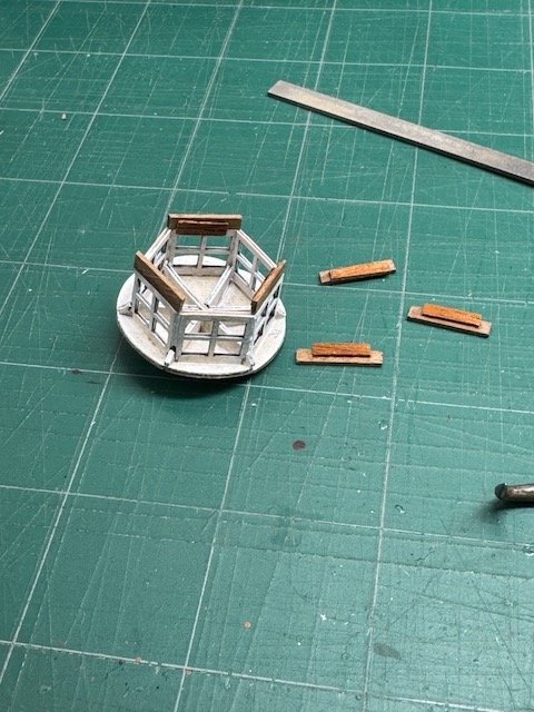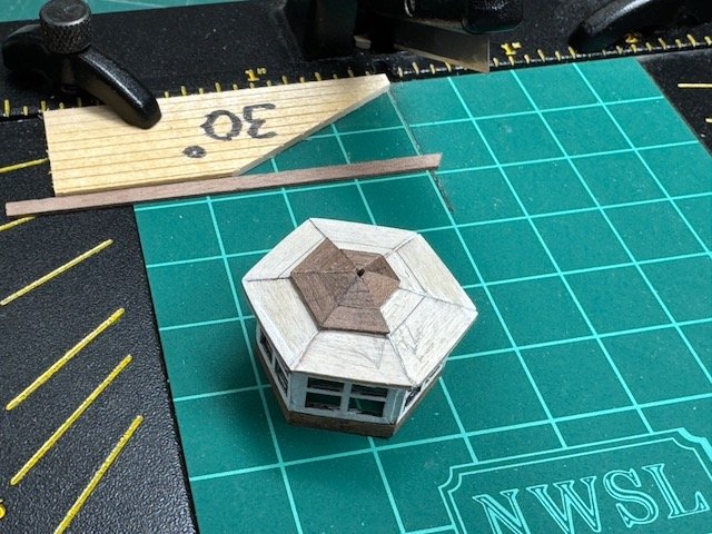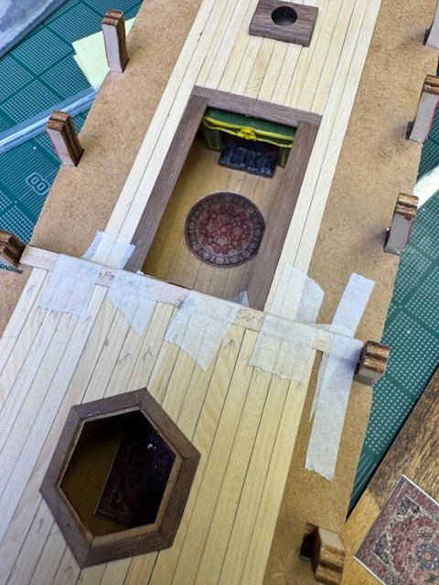 Here's a short update on my progress. First is where I am on the little hexagonal cupola. I've added the walnut skirt around its base. The way I've handled the base is not exactly as it is in the instructions, but the ideas are the same, I think. Besides having the structure look good, I want to make sure that its removability is discreet, i.e. that the viewer can't tell that it lifts off. (Because it might not - I'm still undecided as to whether I'll glue it down or not.) After getting the base all set, what I'm working on now is the walnut roof. The kit-provided subroof is very helpful in getting a good finish layer installed. As you can see, the leaves of the subroof are rounded, which visually makes a somewhat saggy-looking circle when its all installed. Some of the build logs keep the rounded edges, but the photos in the instructions square them off, so that the top's hexagonal like the rest of the structure. I like that look better, so it's what I am doing. You can see in the next photo how that's looking now, with the walnut topping incomplete. The last couple of photos show the expensive Turkish carpets I've gotten for the lower cabins. Eventually the furniture will be painted and permanently installed, but I'm putting that off until after the planking. Pancakes are calling me now, and I have to go. Thanks for looking in! Bob