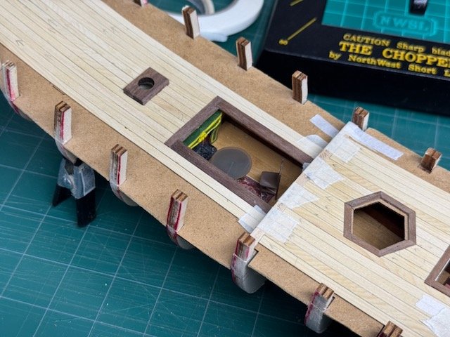 I'm overdue for an update, but there hasn't been a good point to pause. Since the last posting, I've mostly been shifting between work on the transom and fitting out the two lower deck cabins. This post is about work on the transom. The first task was to glue four brackets at the top of the lower transom that will eventually support the upper one. Gluing the brackets into position was challenging because there's there's not nothing to hold them in position, and they aren't balanced to just sit in position. But they have to be located perfectly to support the upper transom (which can help with alignment, but isn't being glued on yet). After a lot of thought, I did the following: tacked the lower transom onto a block of mdf for weight and stability and because the bracket arms are just a wee bit longer than the transom is deep - which is why they hang over the edge of the mdf in the picture below. Then I glued little sacrificial arms on to the bottom of the brackets so that I could adjust and hold each in position as the glue (Titebond) dried. With the brackets and transom stable, I could use the upper transom to tweak the brackets after applying glue. I did the glue up in two steps - first the inner pair and then the outer. You'll see in the photo above that the slots in the upper transom for the outer two brackets are far from square to the brackets, but I've checked photos in the instructions and several build logs, and that's just the way it is. After the glue dried it was trivial to chisel off the basswood brackets. Once the brackets were on I applied the diagonal walnut planking and then the wale that is above that planking. (That wale is supposed to be 2 planks thick - I haven't made the upper half yet). To help me with the planking alignment, I glued a couple of bassword guides which were later removed. I have installed that transom, but not until later.