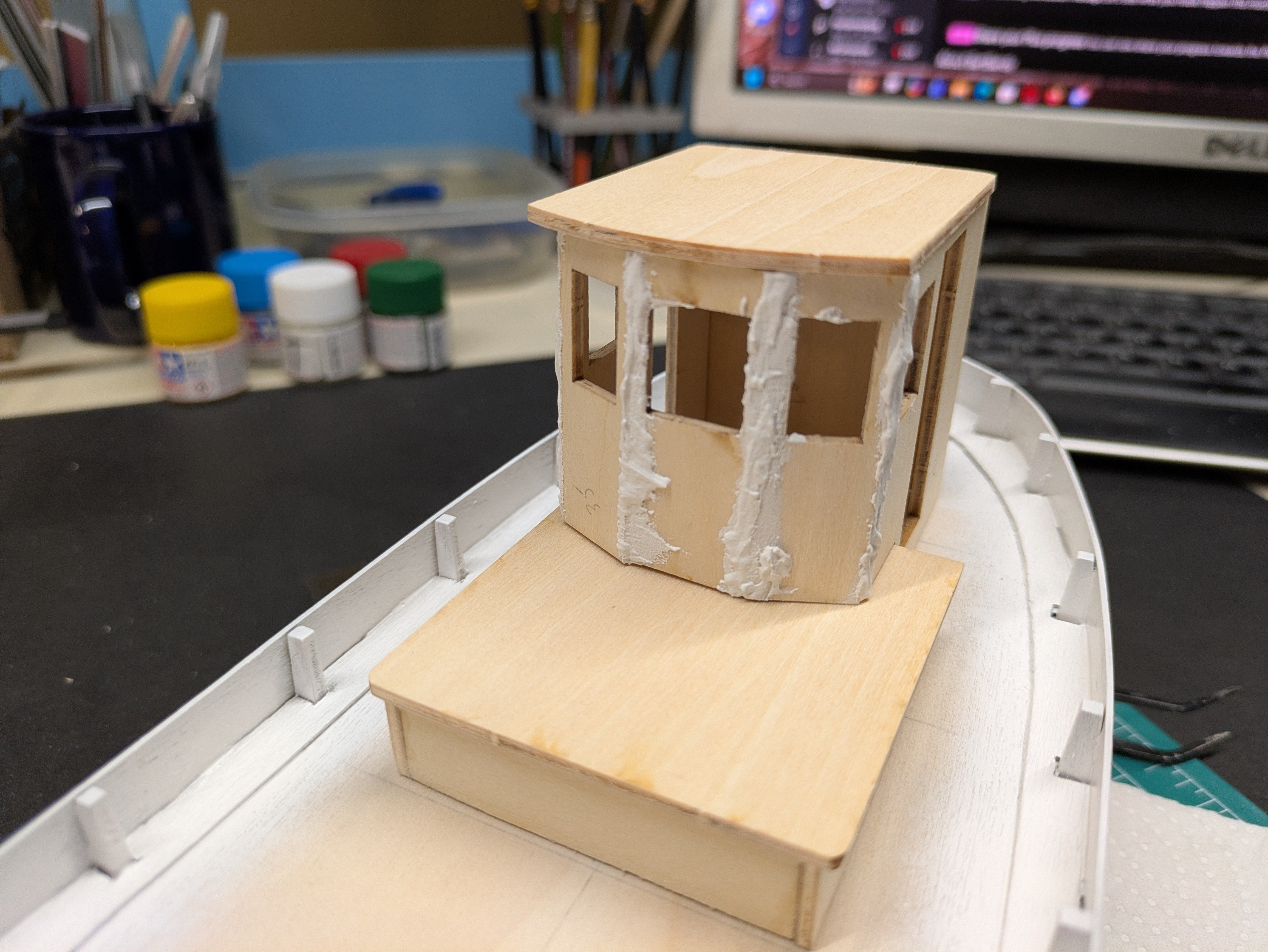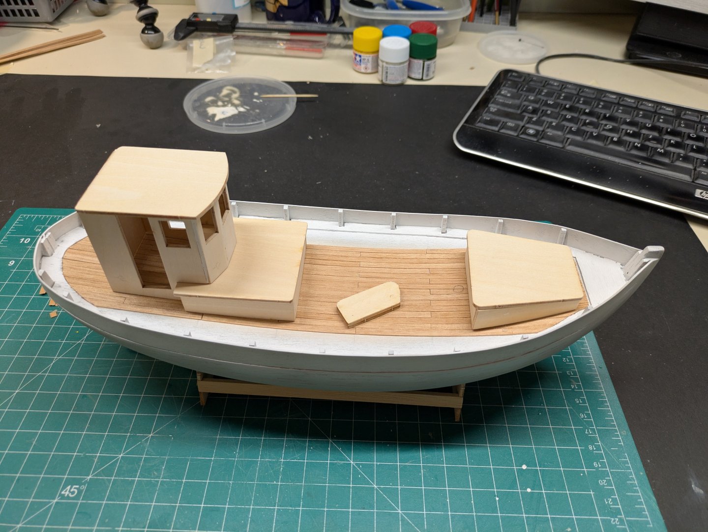 Somewhat productive week. Used the Occre Putty for the first time. It's not bad, you can wipe it thinner with a bit of water if you use too much and dries rock hard. Does seem a bit prone to chips during sanding but one of the better products I have tried. Got the stern blocks in and sanded down along with hull sanding. Did a primer over the whole thing to see how it looks. I want the boat to look wooden planked such as an older boat would be so, went light with the putty. Thoughts? Does it need more putty/sanding or look good for an old wood work boat? Gonna look at it for a few days to decide if I think I like it or not