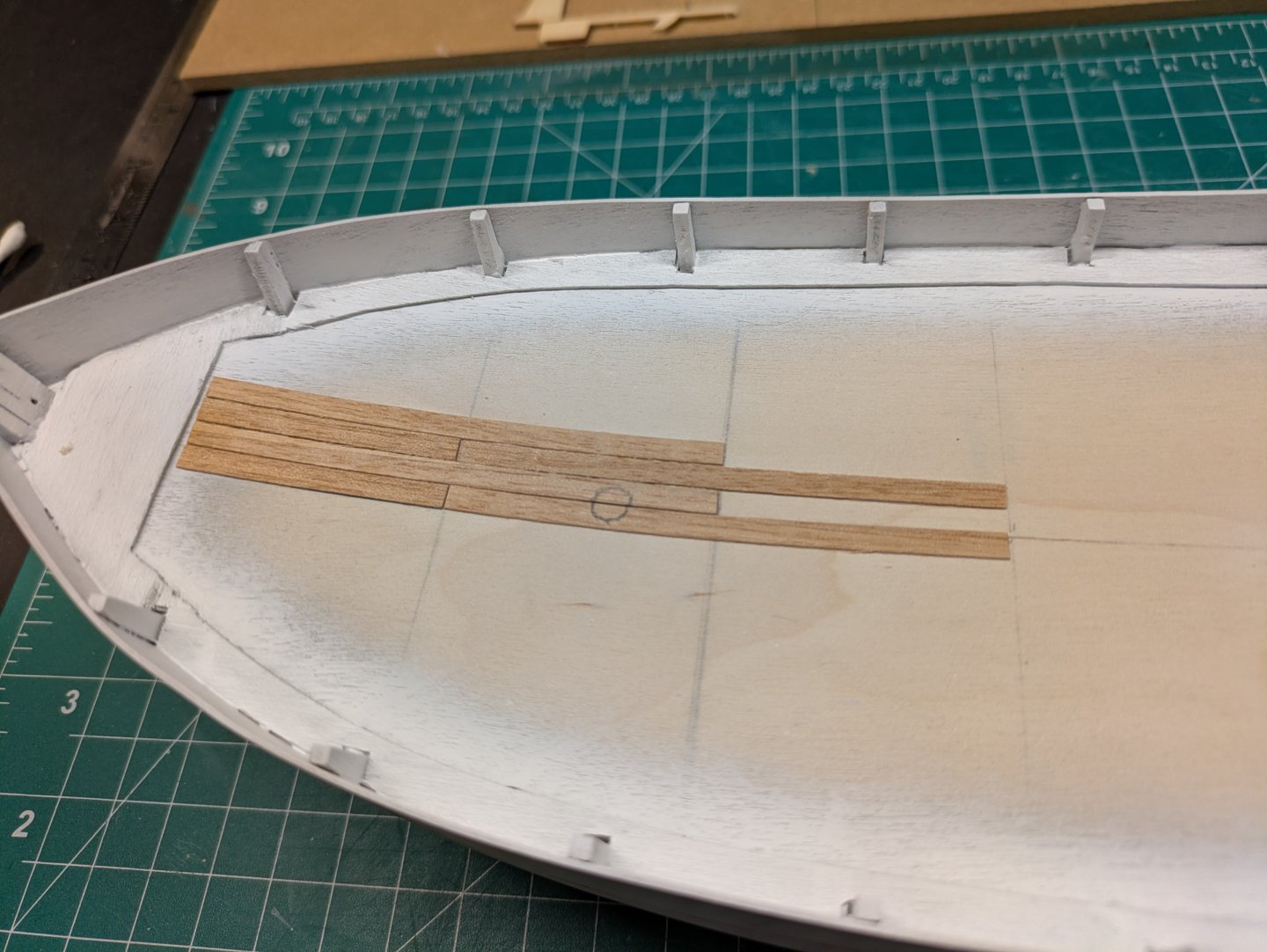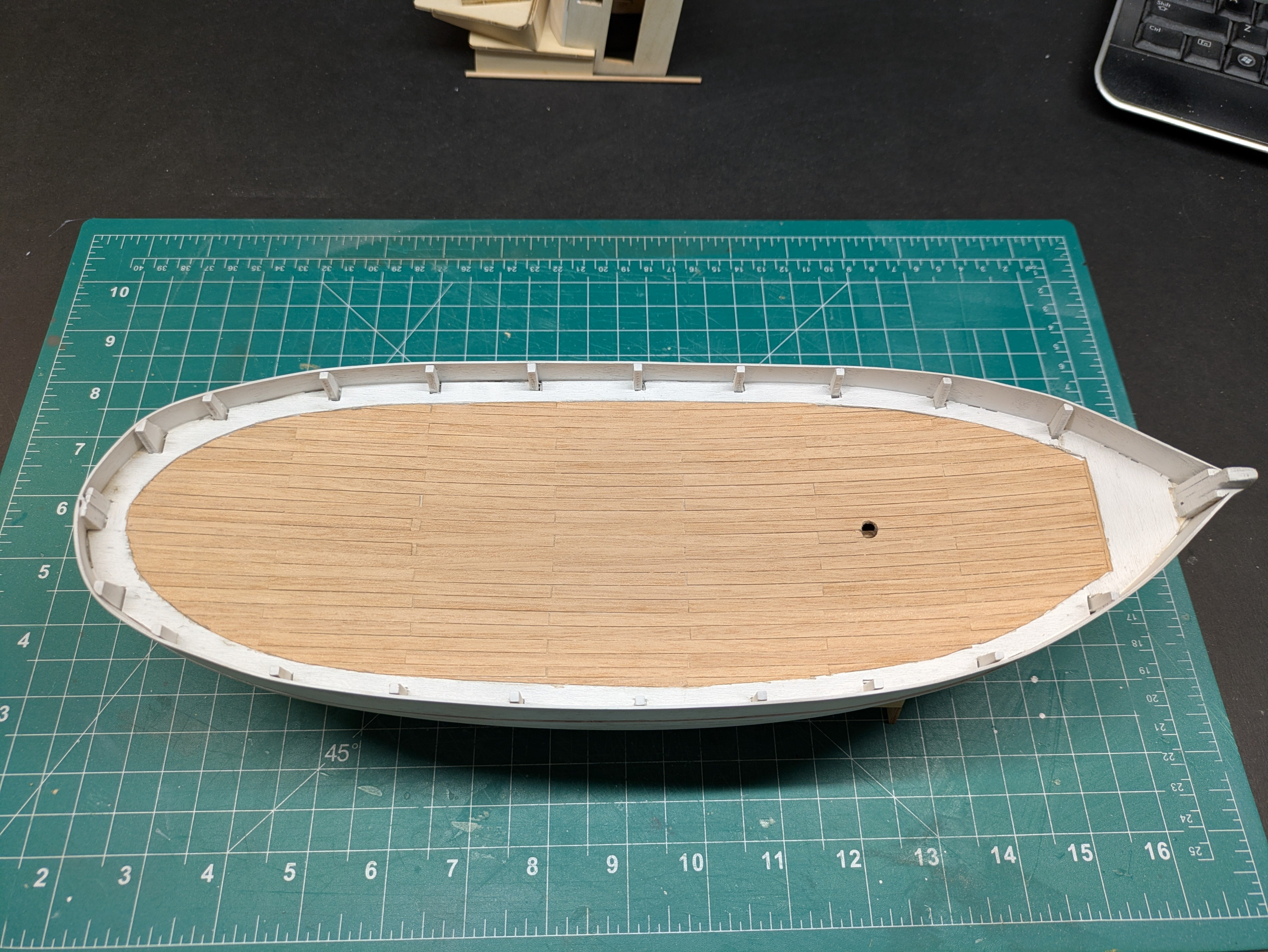Survived my first official planking. Not the prettiest. Lots of sanding and filling ahead. Holes, cracks, craters to fill. But was not near as bad as I thought it would be. But already I know how I will do it different on my next build. Continuing to learn. Excuse the few blood stains, the top of one of the sewing pins came off and impaled my finger. Dang things.