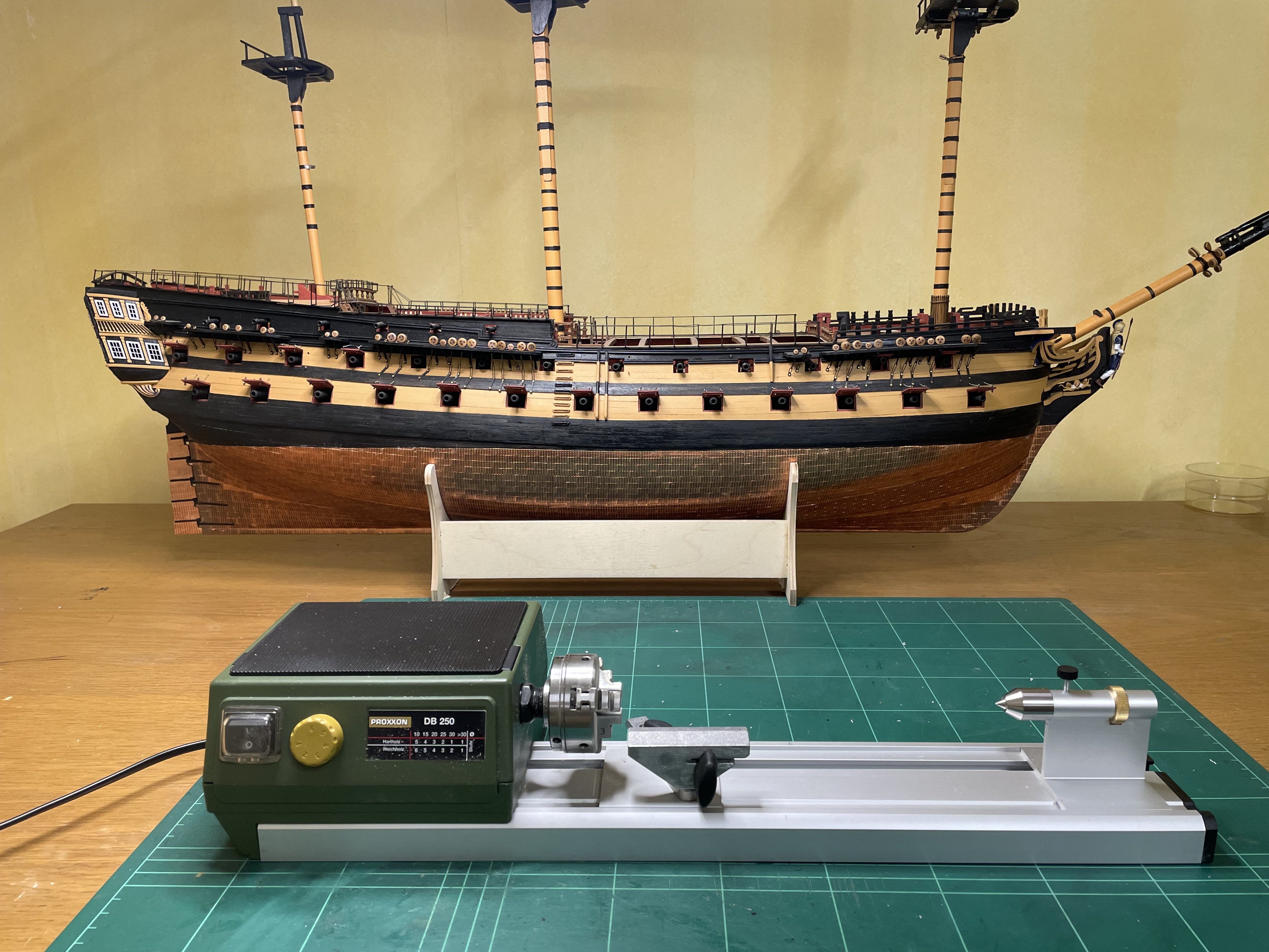 Dear friends, I bought a new tool the other week which I think is useful. It is a Proxxon lathe (DB 250). It makes it much easier to work with the mast parts and yards. The lathe does not come with the three jaw chuck you see in the picture. With the lathe comes some plastic inserts to similar to the inserts you have to hold the drill bits in a Dremel drill but with the jaw chuck the lathe becomes much more versatile. The lathe in its self is not too expensive but the jaw chuck costs almost as half the lathe. Best regards Henrik